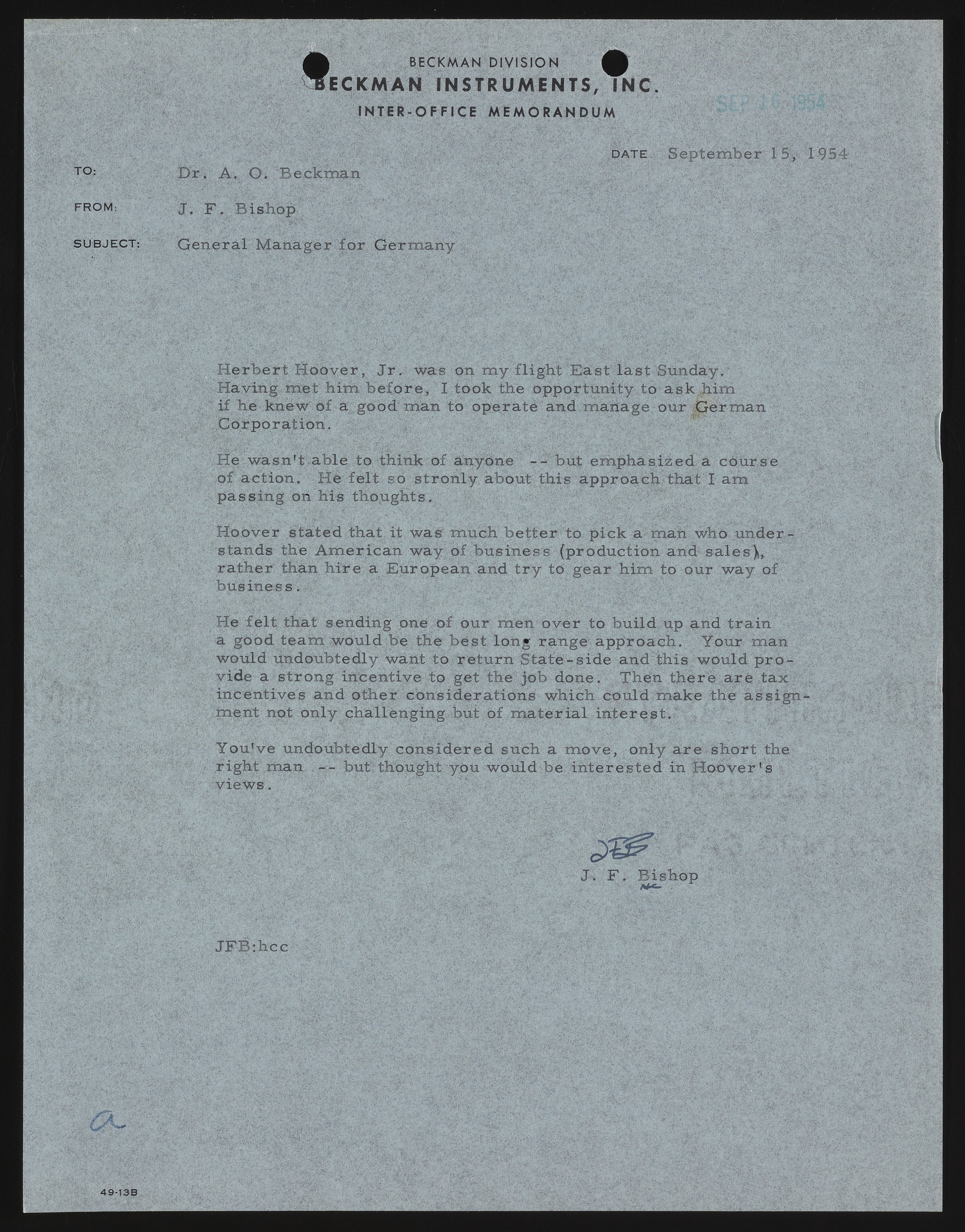 In this letter, John F. Bishop relates a conversation with Herbert Hoover, Jr., in which Hoover recommended that Beckman choose "a man who understands the American way of business," rather than a European candidate, to head the German subsidiary.