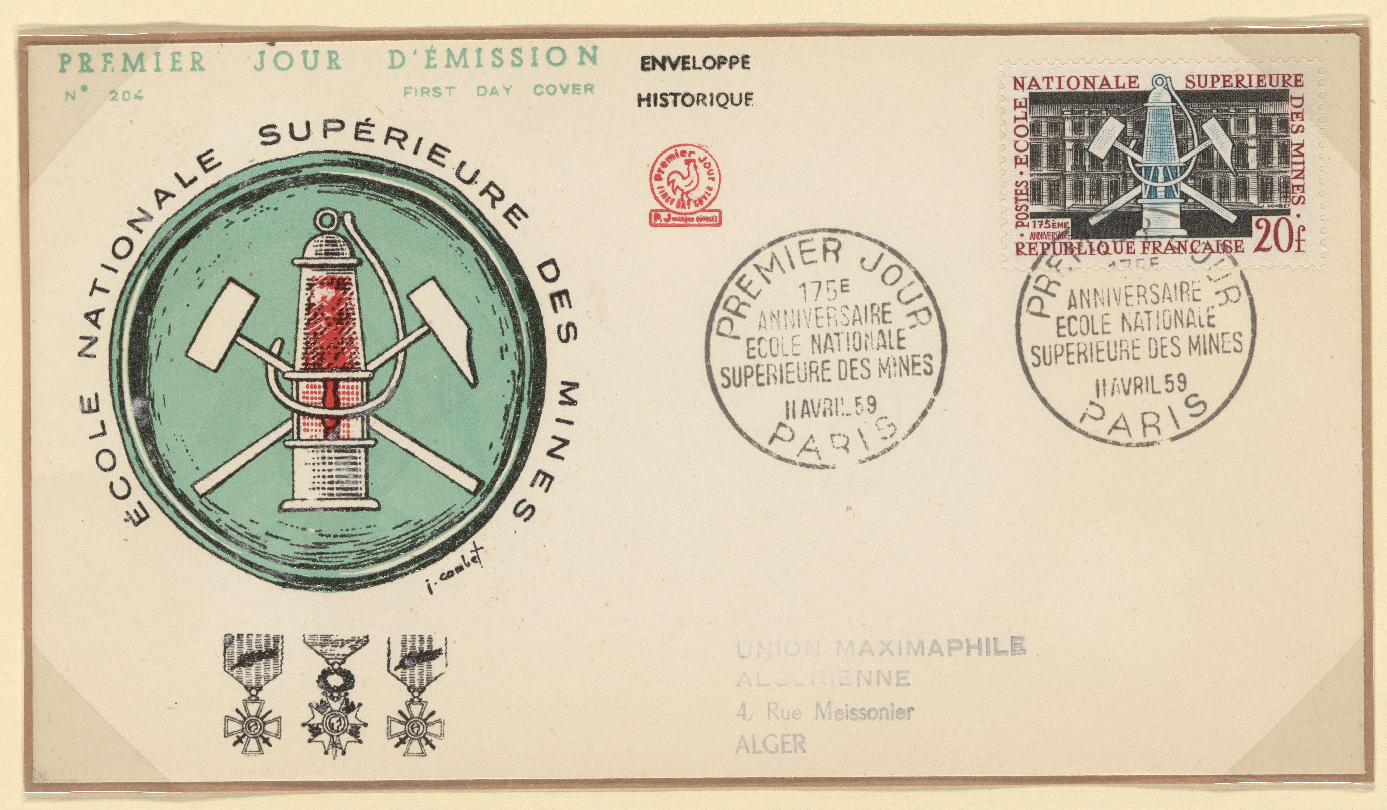 “First Day Cover Commemorating the École Nationale Supérieure Des Mines De Paris,” April 11, 1959. Witco Stamp Collection, Box 7. Science History Institute. Philadelphia. https://digital.sciencehistory.org/works/vk63o5s.