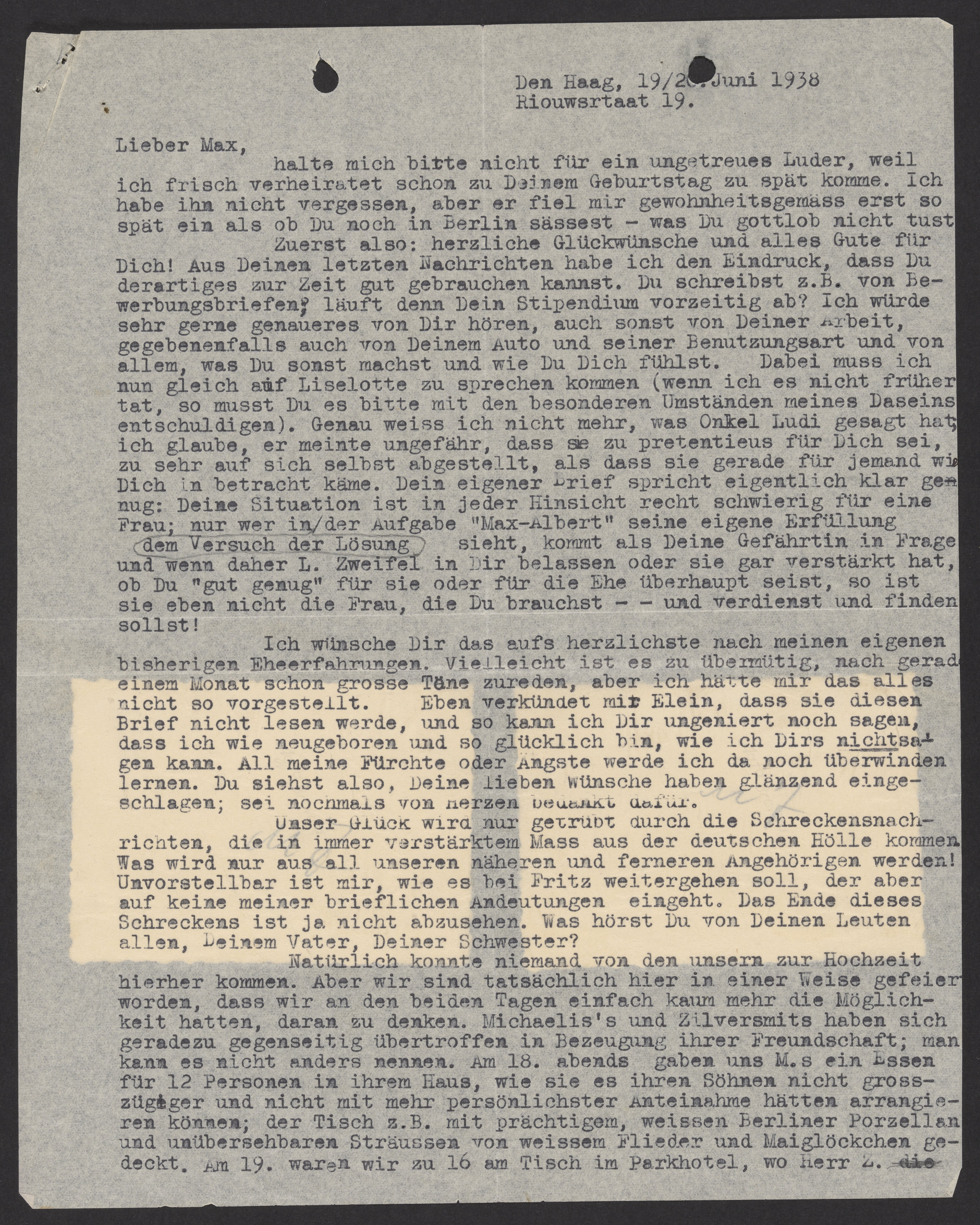 Letter from Eva and Alfred Schnell to Max Bredig, June 19, 1938