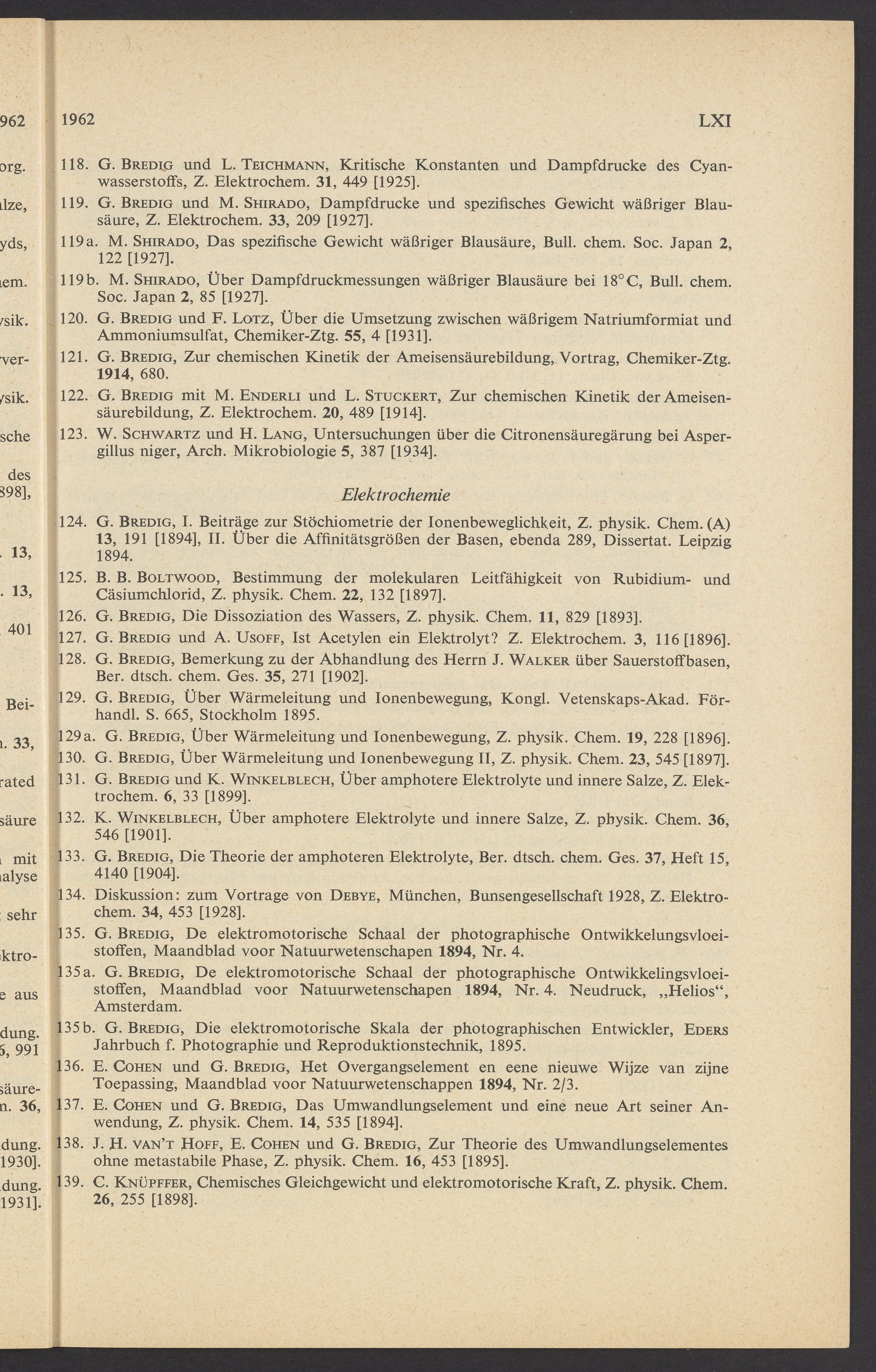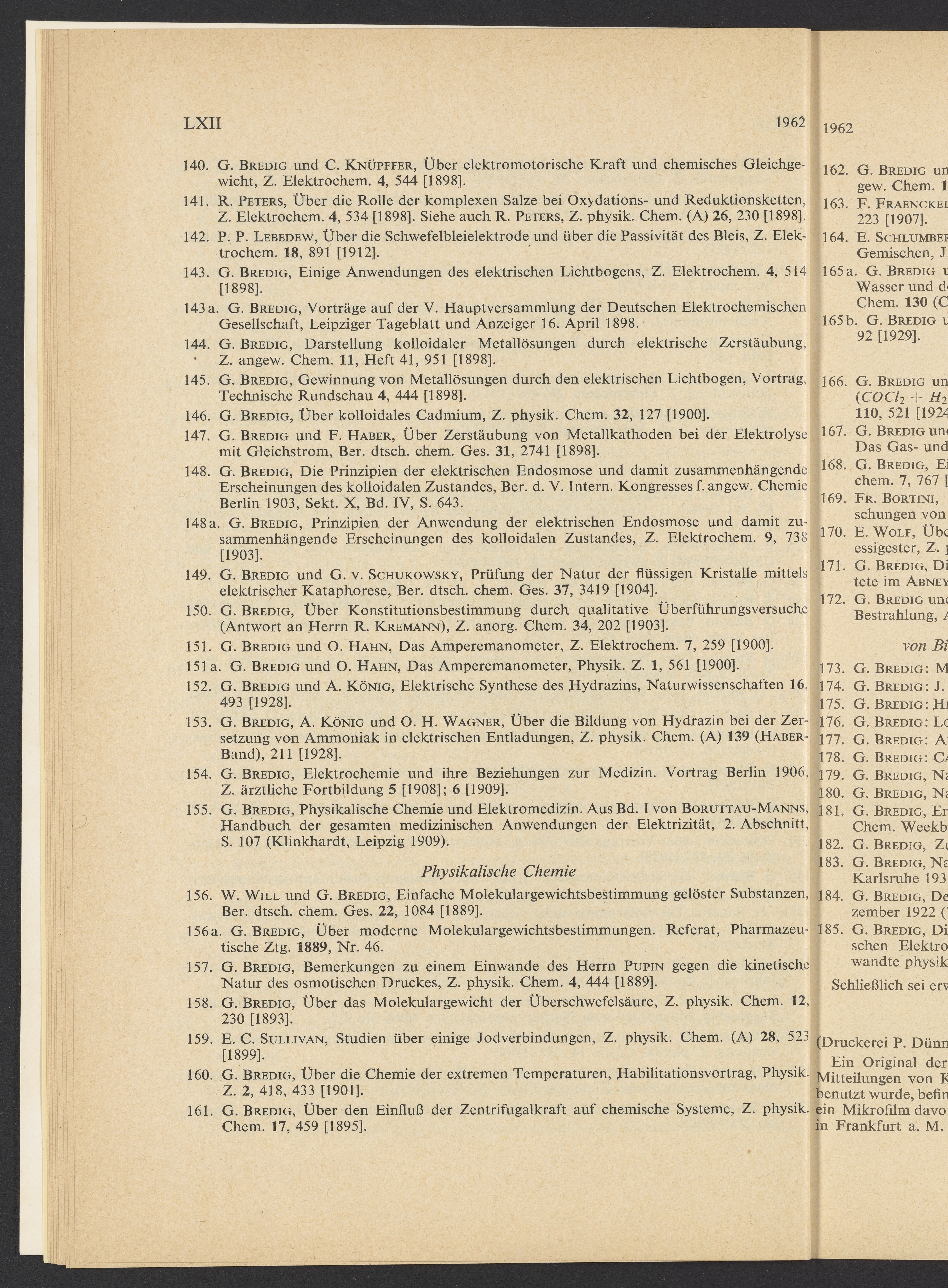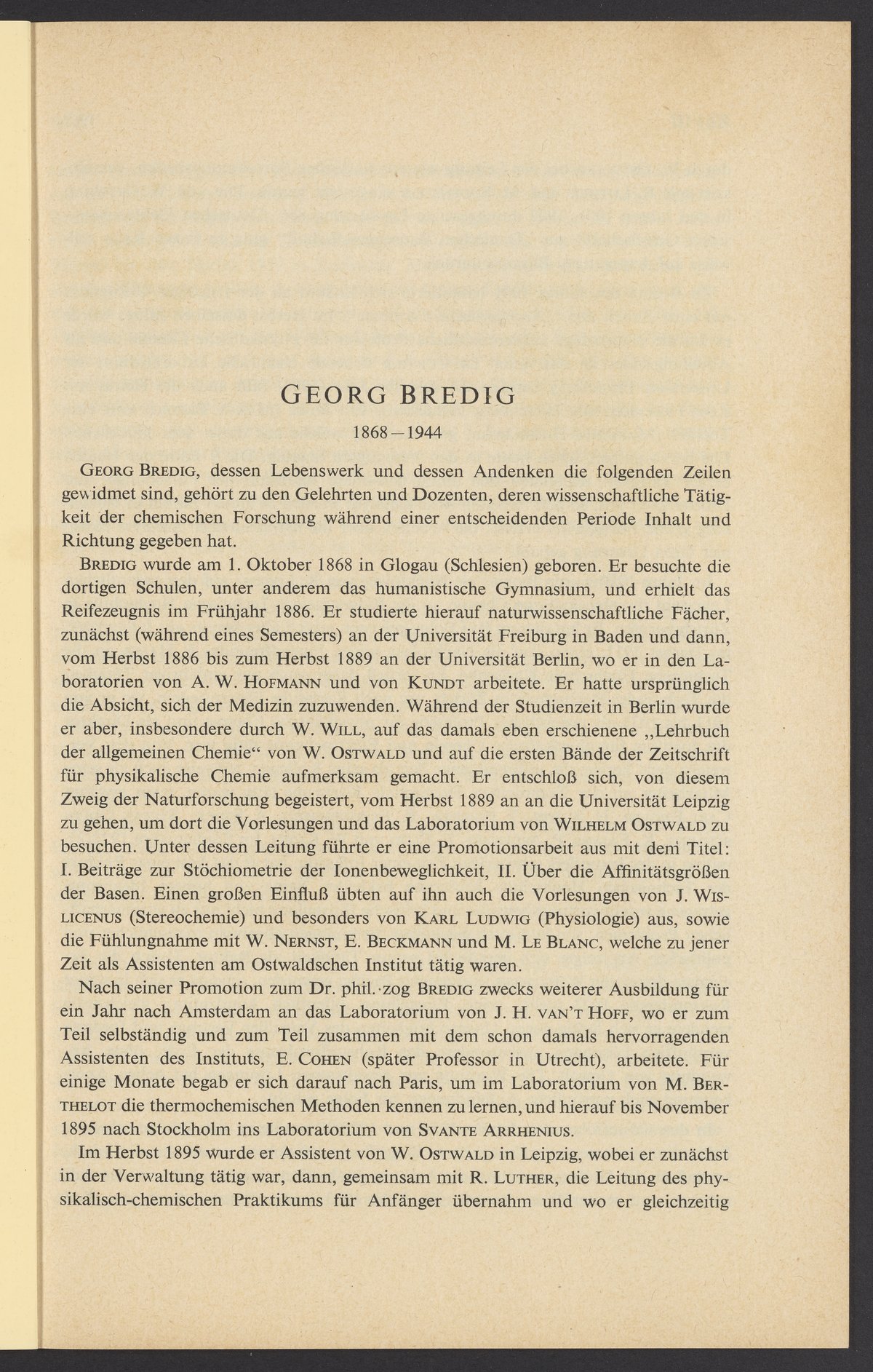 Small JPG1200 x 1779px — 124 KBLarge JPG2880 x 4269px — 846 KBFull-sized JPG3920 x 5810px — 1.5 MBOriginal fileTIFF — 3920 x 5810px — 65.2 MBGeorg Bredig was a German physical chemist known for his work with catalysts, reaction kinetics, and electrochemistry. In 1898 he created Bredig's Arc method, which became the preferred chemical method for preparing colloidal solutions of metals. Bredig studied with a number of notable scientists including Wilhelm Ostwald (1853-1932), Jacobus Henricus van’t Hoff (1852-1911), Marcellin Berthelot (1827-1907) and Svante Arrhenius (1859-1927). He taught at the Technische Hochschule, Karlsruhe from 1911 until he was forced to resign in 1933 when the National Socialist party banned Jewish people from holding academic positions. In 1940 Bredig left Germany for the Netherlands and ultimately emigrated to the United States.