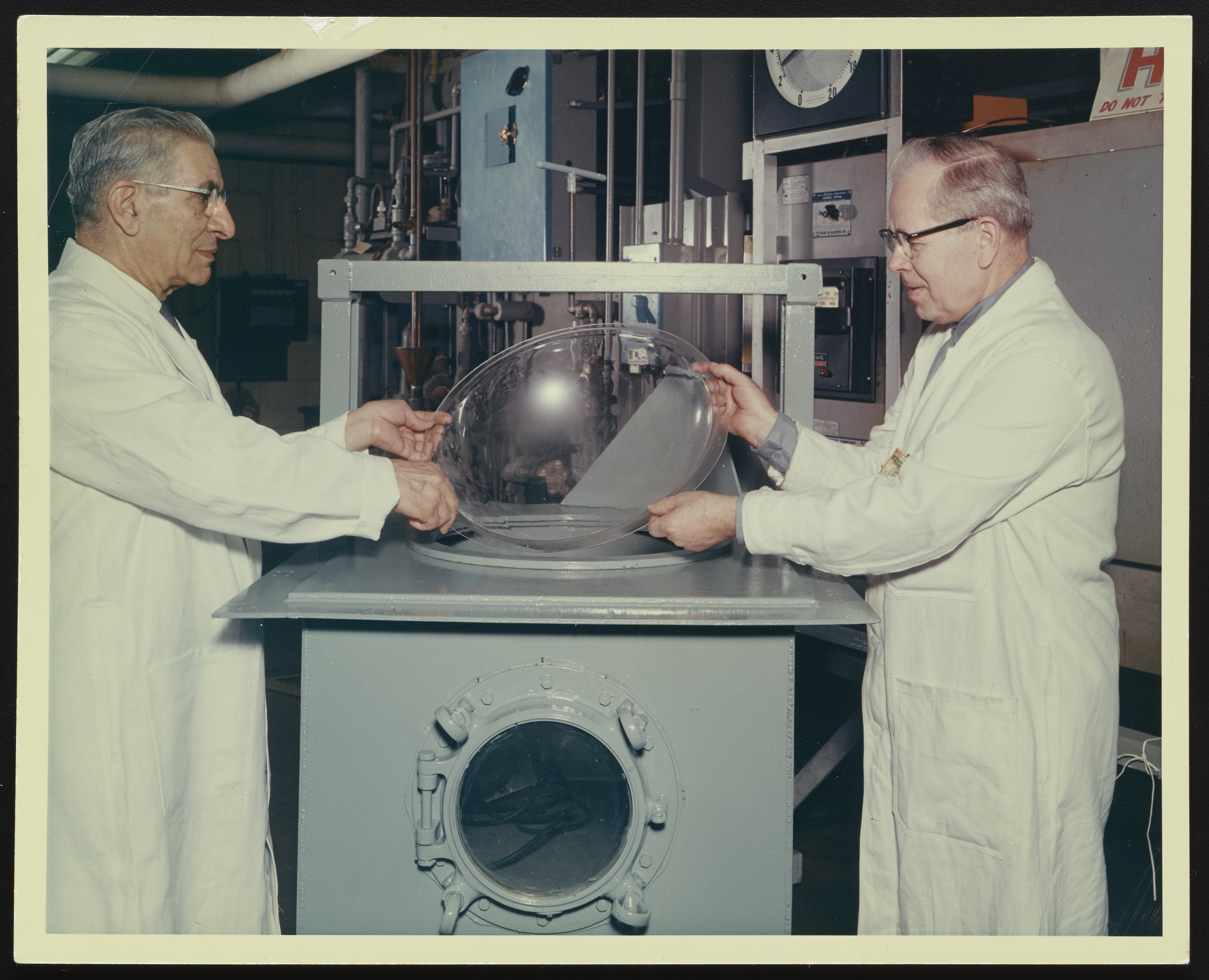 Color photograph showing two technicians removing a plastic dome from an unidentified machine in the Plastics Laboratory at the Naval Air Engineering Center.