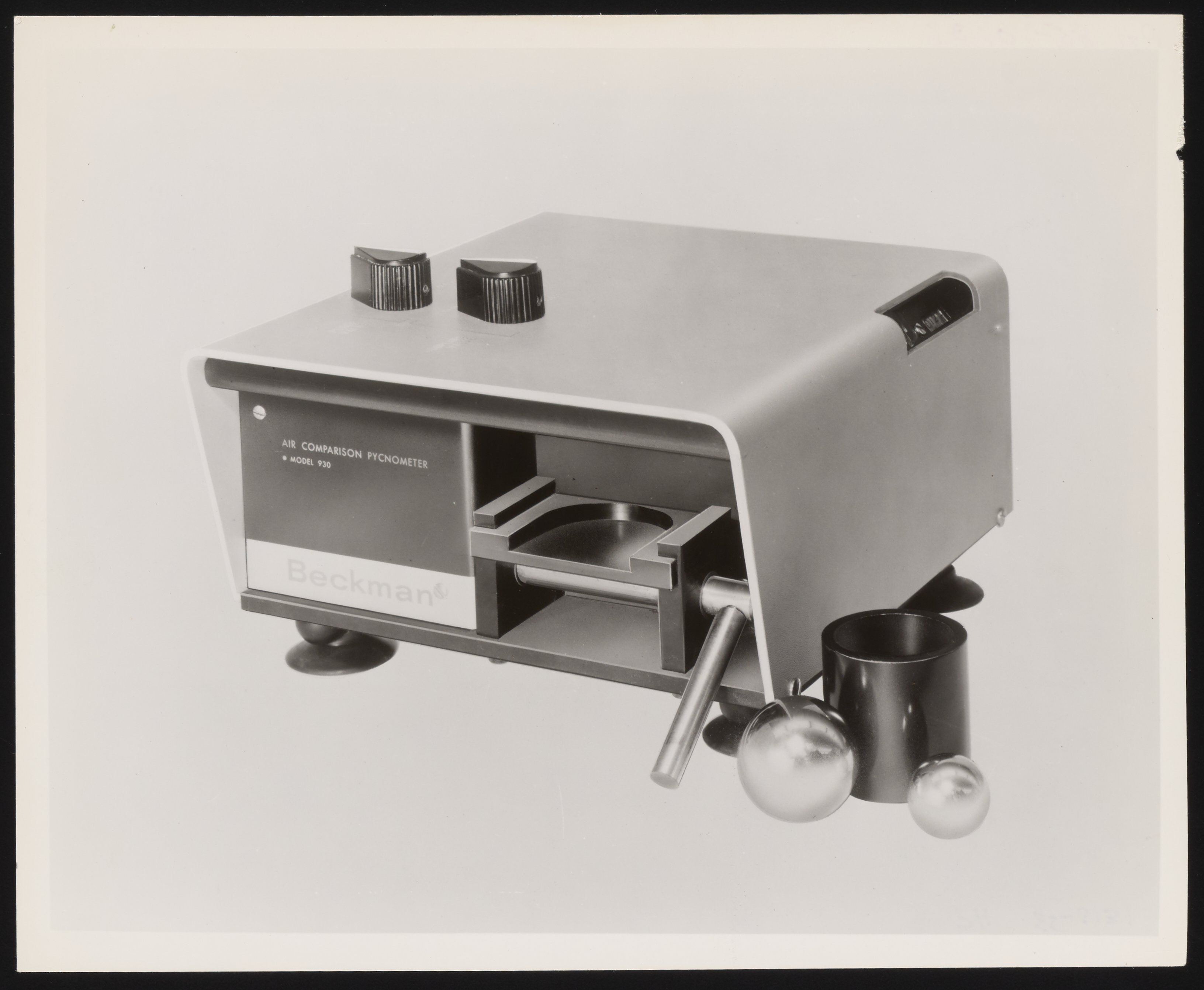 “Beckman Model 930 Air Comparison Pycnometer,” 1960–1969. Beckman Historical Collection, Box 55, Folder 174. Science History Institute. Philadelphia. https://digital.sciencehistory.org/works/vm40xr605.