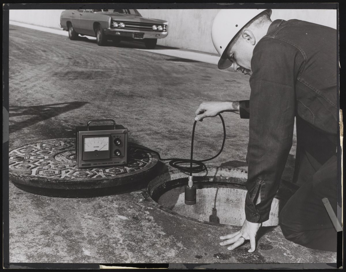 “Man Kneeling beside an Open Manhole Cover, Using a Beckman Model 715 Process Oxygen Monitor,” n.d. Beckman Historical Collection, Box 90, Folder 7. Science History Institute. Philadelphia. https://digital.sciencehistory.org/works/vm40xr70d.