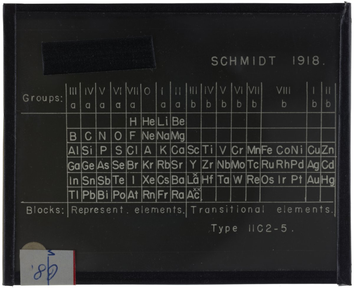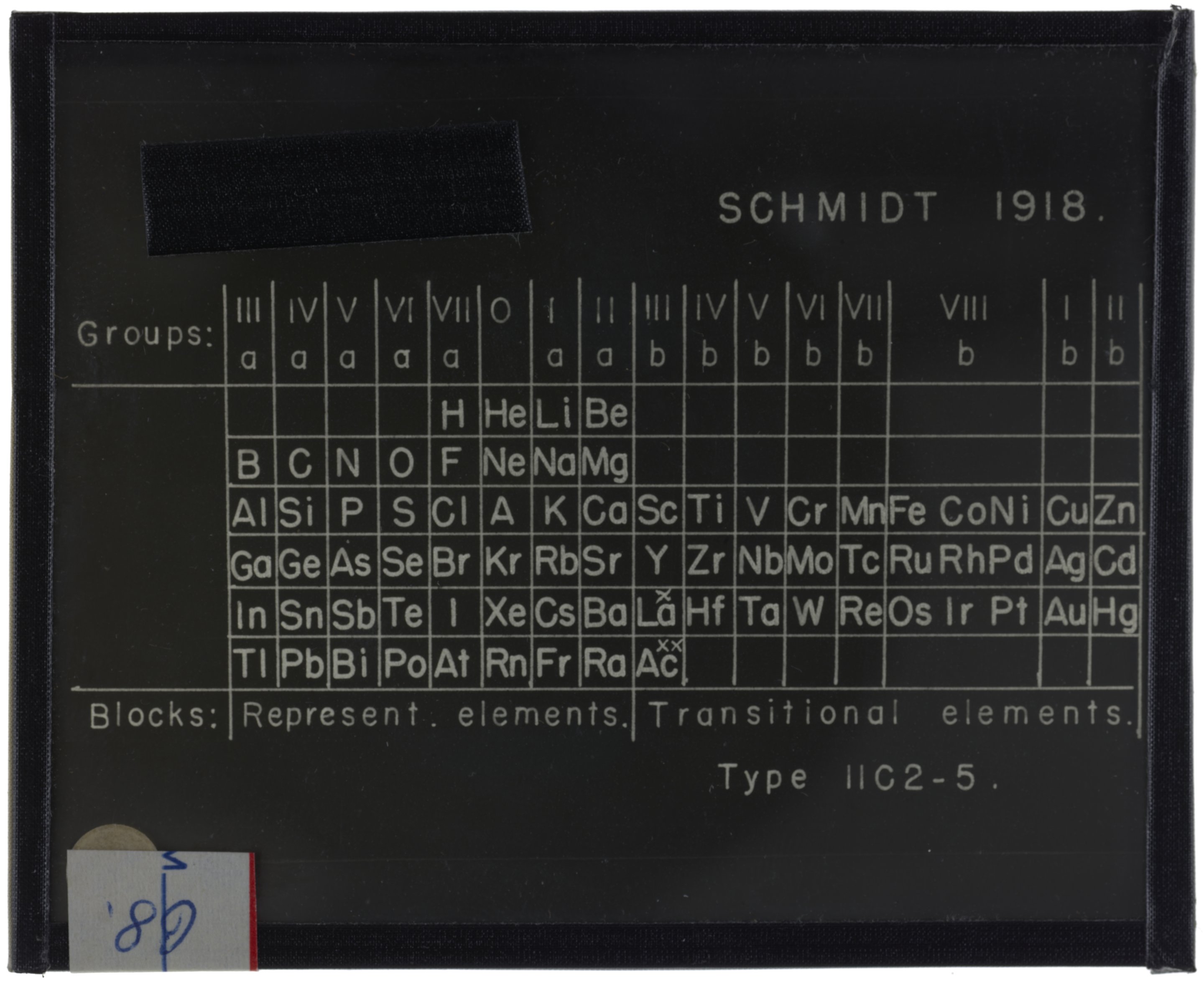 Schmidt, Curt, and Edward G. Mazurs. “Series Table with Group 0 Placed in Middle of Table.” Glass (material), circa 1918–1957. Edward G. Mazurs Collection of Periodic Systems Images, Box 1. Science History Institute. Philadelphia. https://digital.sciencehistory.org/works/vm40xs148.