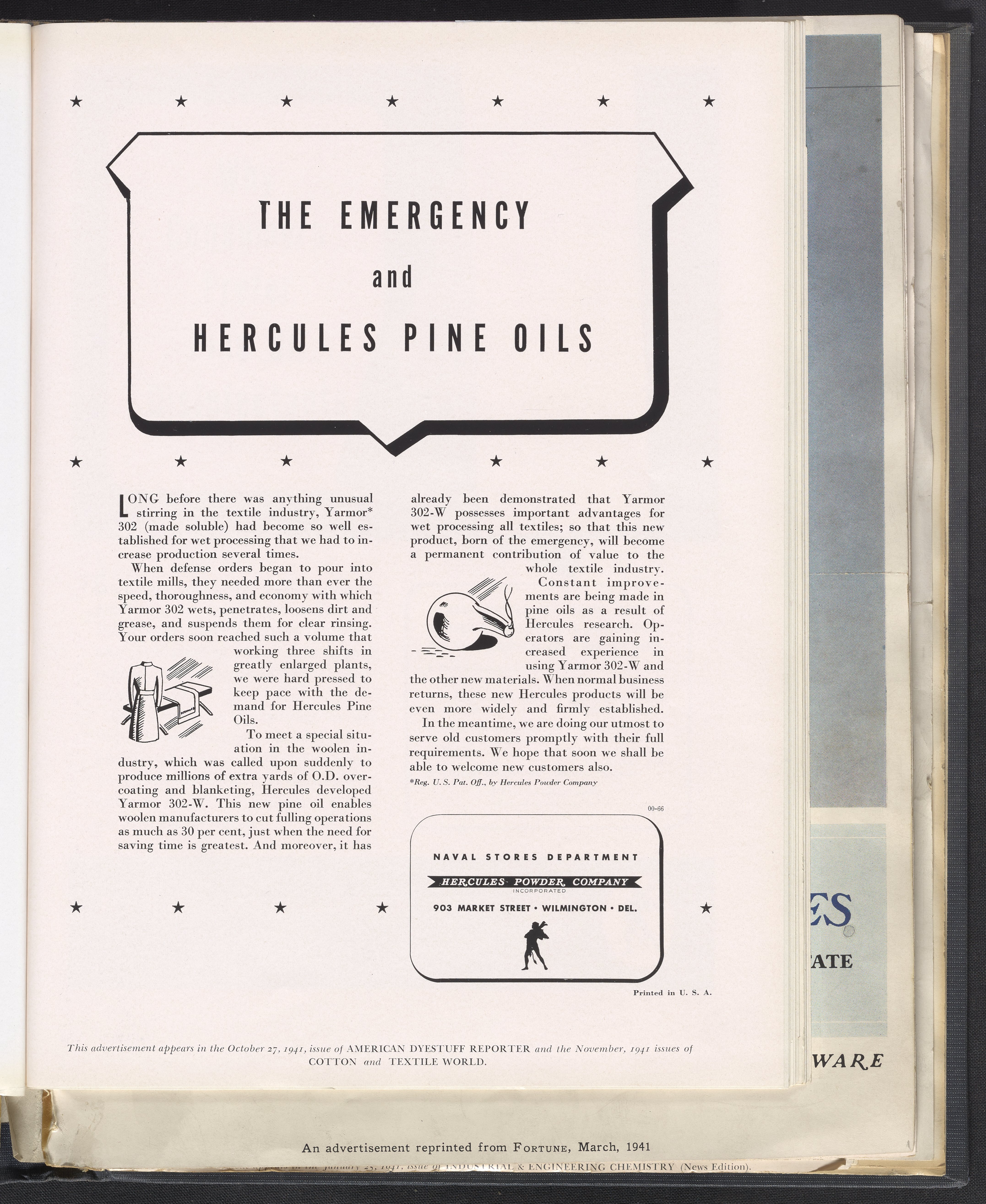 Hercules Incorporated. “The Emergency and Hercules Pine Oils.” 1941 Hercules Advertisements, 1941. Records of Hercules Incorporated, Volume 1941. Science History Institute. Philadelphia. https://digital.sciencehistory.org/works/vm40xs458.