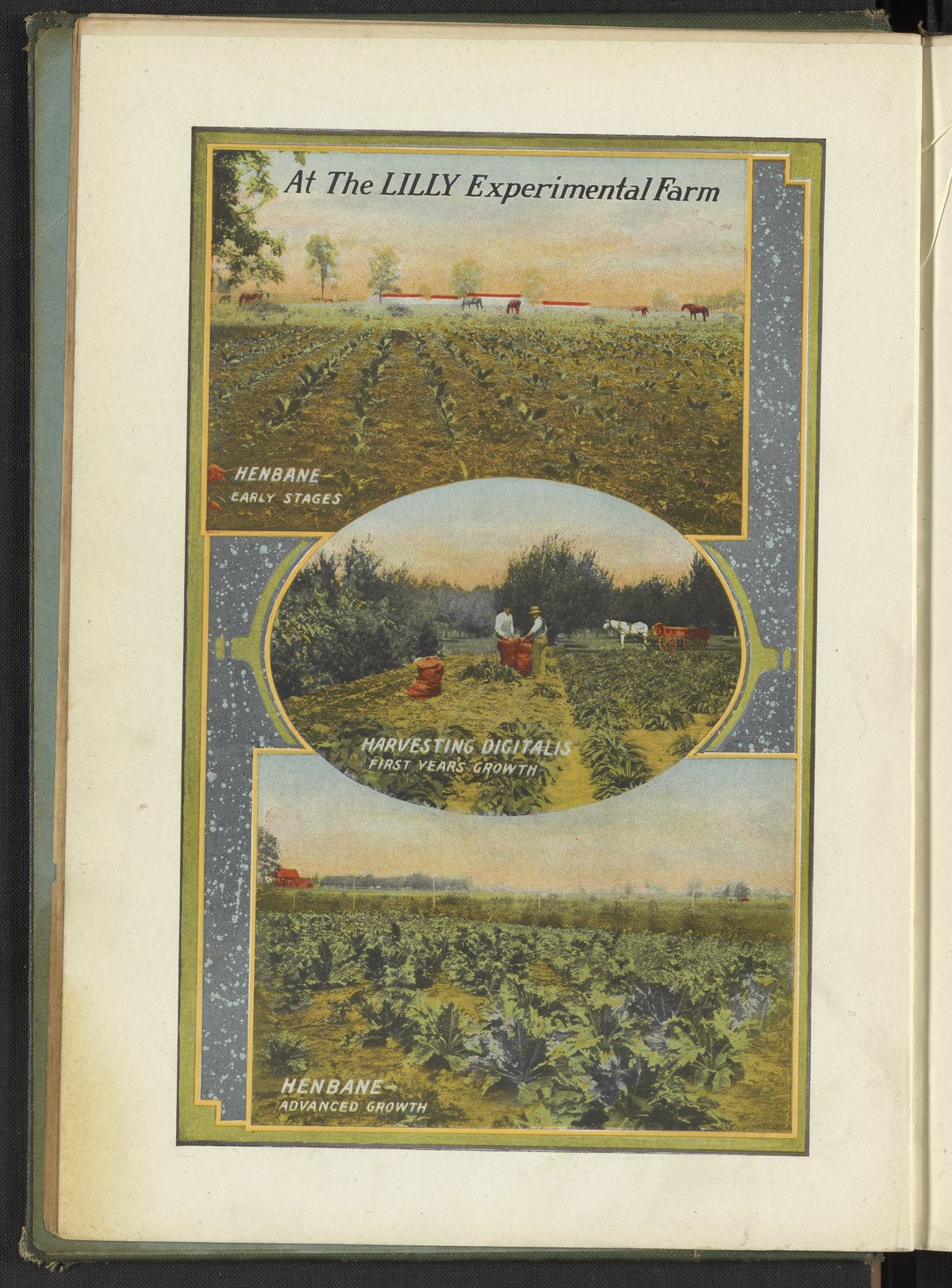 Color printed photographs of fields of medicinal plants with workers and horses present. The medicinal plants are henbane and digitalis. Eli Lilly and Company ran the experimental farm to try to propagate drug plants as potent as those imported from Europe.