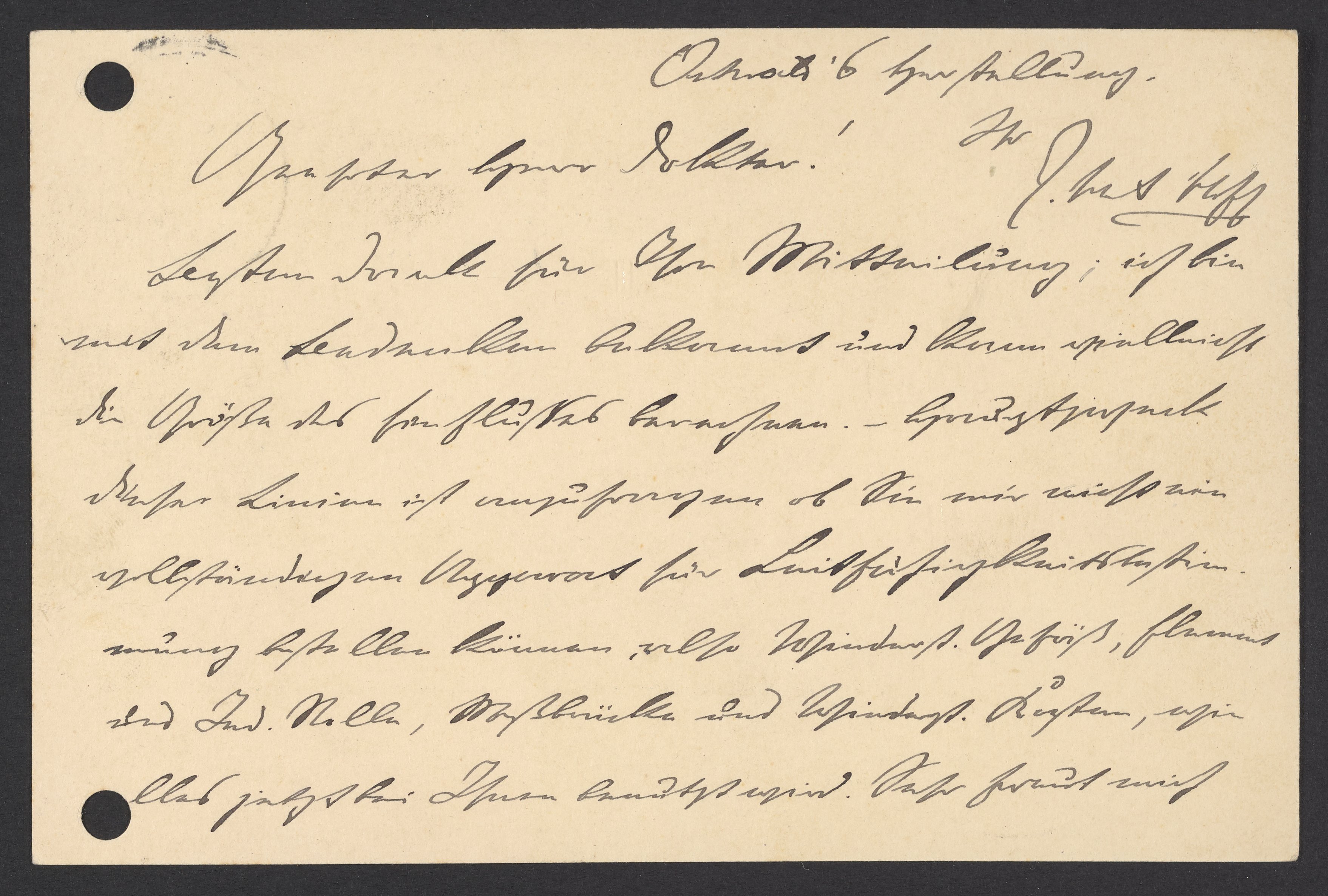 Besten Dank für Ihre Mitteilung; ich bin mit den Bedenken bekannt und kann vielleicht die Größe des Einflusses berechnen. – Hauptpunkt dieser Linien ist anzufragen ob Sie mir nicht ein[en] vollständigen Apparat für Leitflüssigkeitsbestimmung bestellen können, also Widerst. Gefäß, Flammer und Ind. Welle, Meßbrücke und Widerst. Kasten, wie alles jetzt bei Ihnen benutzt wird. Sehr freut mich Ostwalds Bestellung.