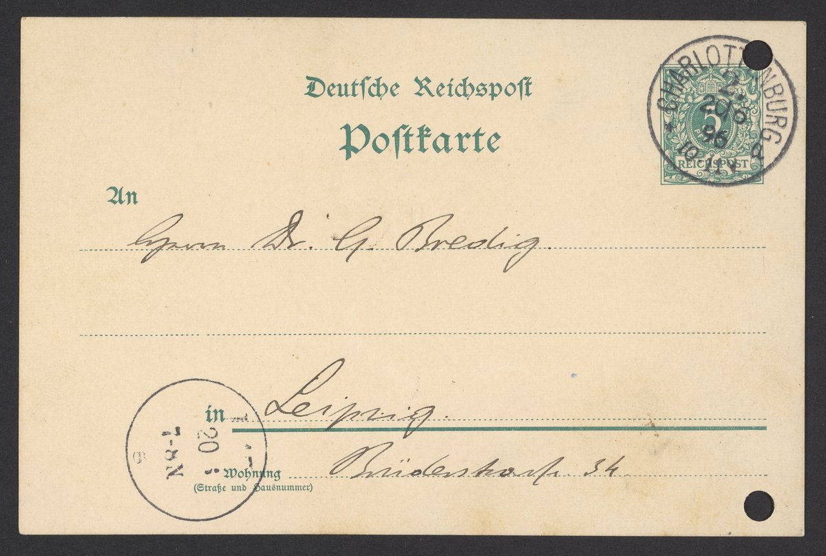 Hoff, J. H. van 't (Jacobus Henricus). “Postcard from Jacobus H. Van 't Hoff to Georg Bredig, June 1896,” June 20, 1896. Papers of Georg and Max Bredig, Box 2, Folder 1. Science History Institute. Philadelphia. https://digital.sciencehistory.org/works/vmcp8wr.