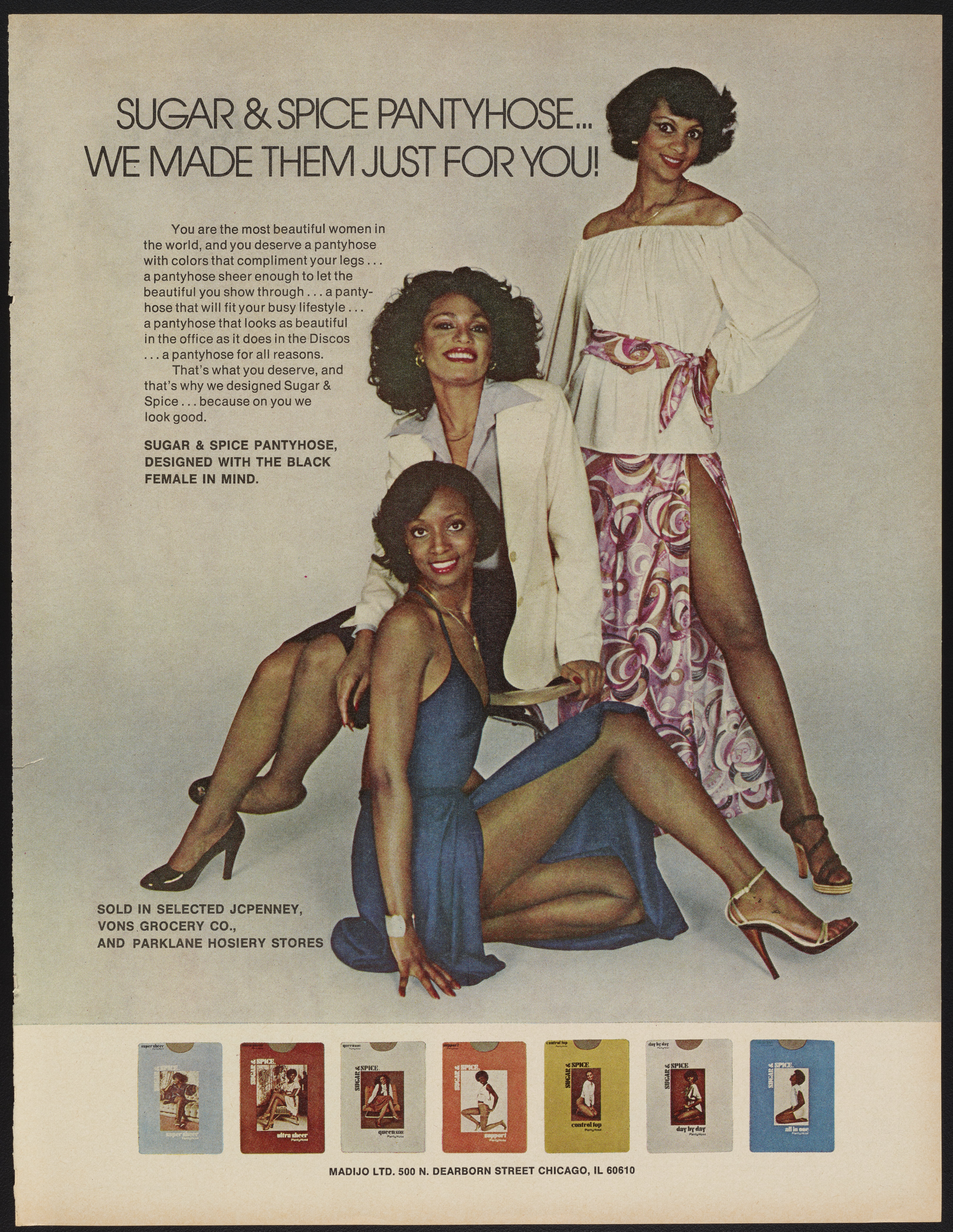 Sugar & Spice. “Sugar & Spice Pantyhose... We Made Them Just For You!” Chicago, Illinois: Johnson Publishing Company, January 1979. Science History Institute. Philadelphia. https://digital.sciencehistory.org/works/vnigzwg.
