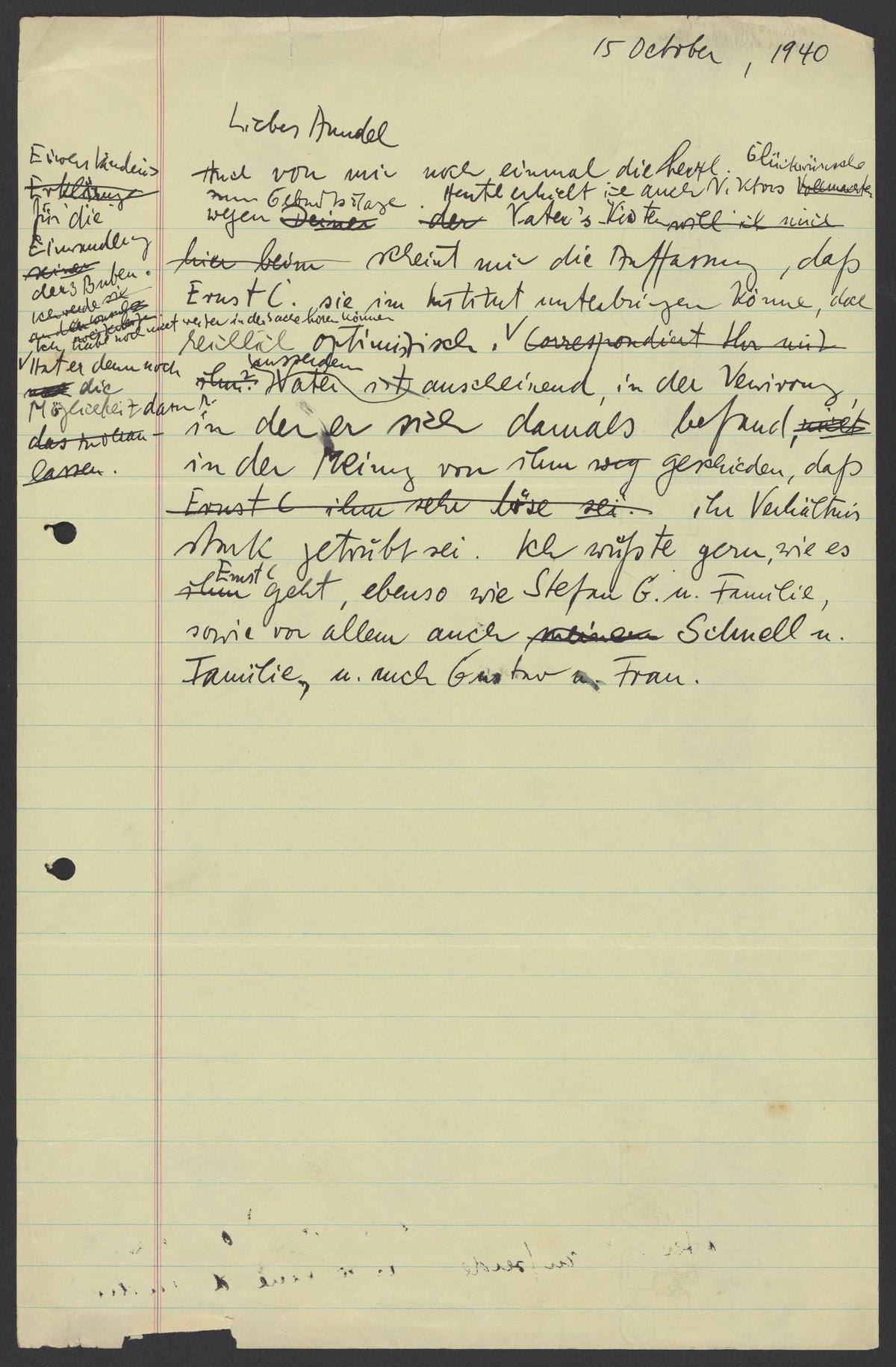 Auch von mir noch einmal die herzl. Glückwünsche zum Geburtstage. Heute erhielt ich Viktors Vollmacht. Wegen Vaters Kisten, scheint mir die Befassung, daß Ernst C. sie im Institut unterbringen könne, doch wirklich optimistisch. Hat er dann die Möglichkeit dazu? Correspondiert Ihr mit ihm? Vater ist ausserdem anscheinend, in der Verwirrung, in der er sich damals befand, in der Meinung von ihm geschieden, daß Ernst C. ihm sehr böse sei (und) ihr Verhältnis stark getrübt sei. Ich wüßte gern, wie es Ernst C. geht, ebenso wie Stefan G. u. Familie, sowie vor allem auch Schnell u. Familie, u. auch Gustav u. Frau.
