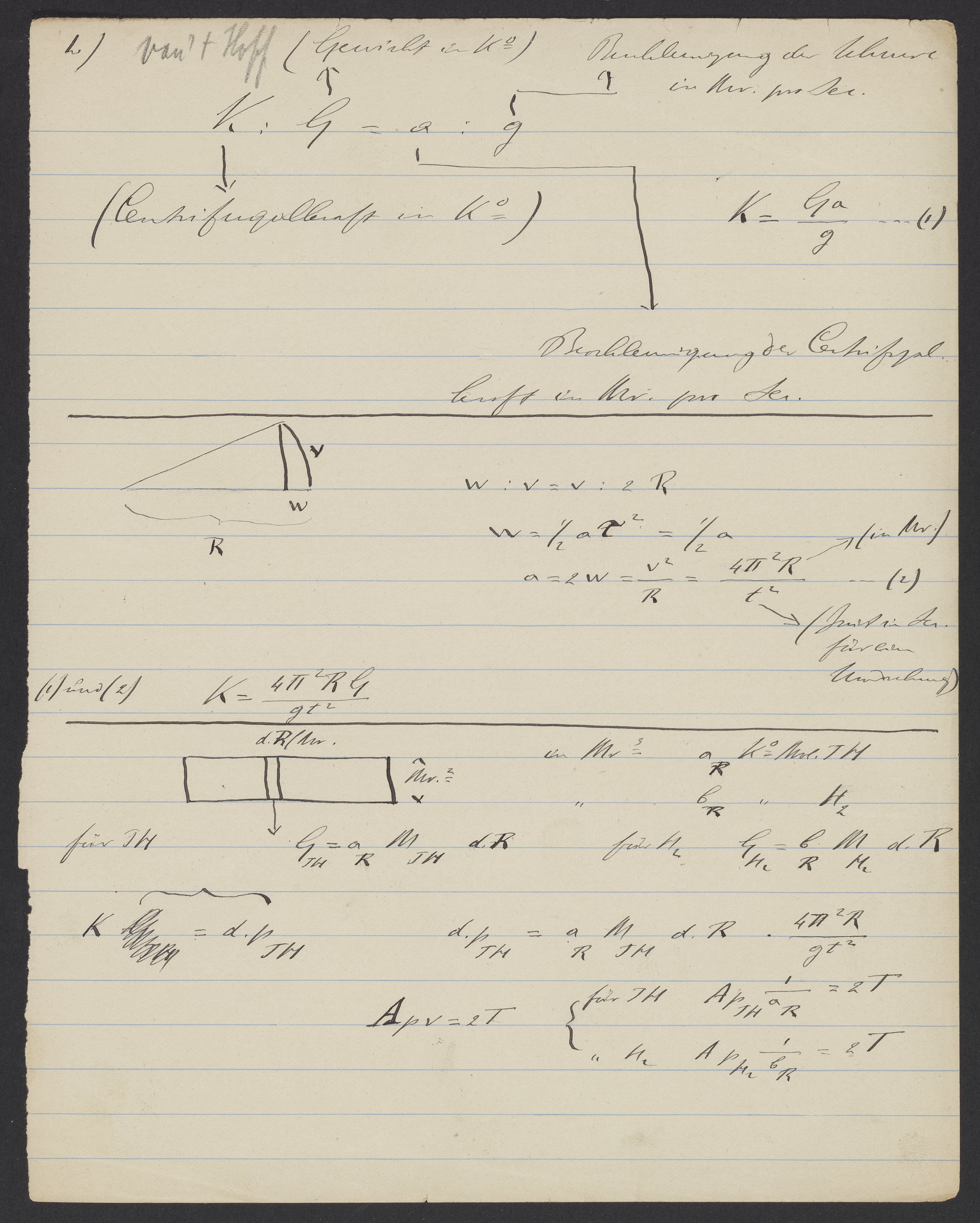 Small JPG1200 x 1498px — 234 KBLarge JPG2880 x 3595px — 1.2 MBFull-sized JPG4190 x 5230px — 2.4 MBOriginal fileTIFF — 4190 x 5230px — 62.8 MBNotes handwritten by Dutch physical chemist, Jacobus H. van’t Hoff (1852-1911). Van’t Hoff was the first winner of the Nobel Prize in chemistry in 1911 and is considered to be one of the lead pioneers of the field of physical chemistry.