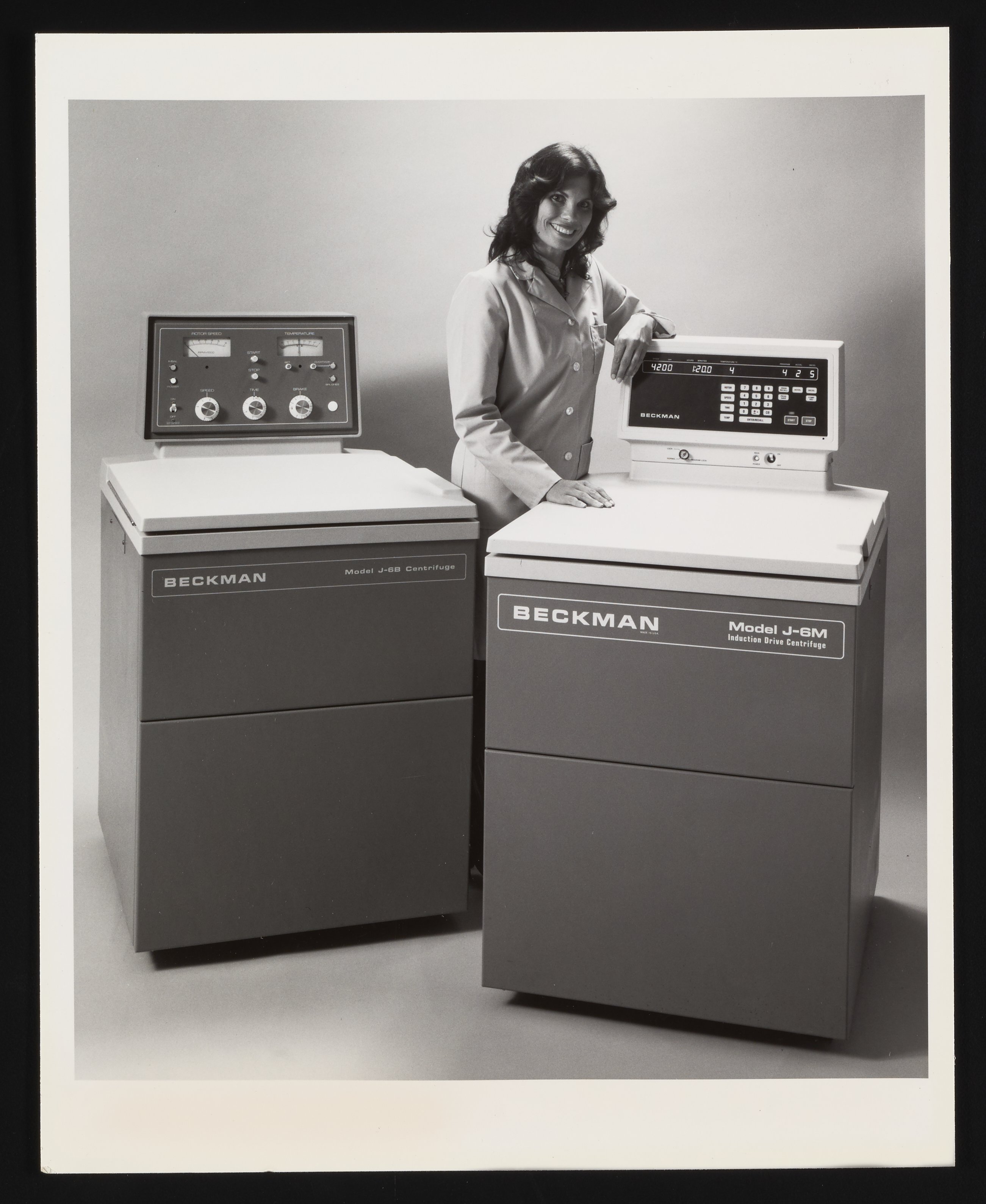 Woman with Beckman Centrifuge Models J-6B and J-6M