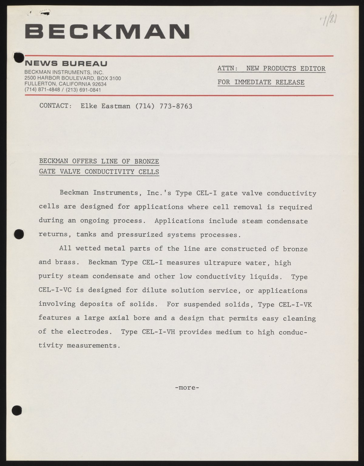 Eastman, Elke. “Beckman Offers Line of Bronze Gate Valve Conductivity Cells,” July 1, 1981. Beckman Historical Collection, Box 58, Folder 69. Science History Institute. Philadelphia. https://digital.sciencehistory.org/works/vq27zn962.