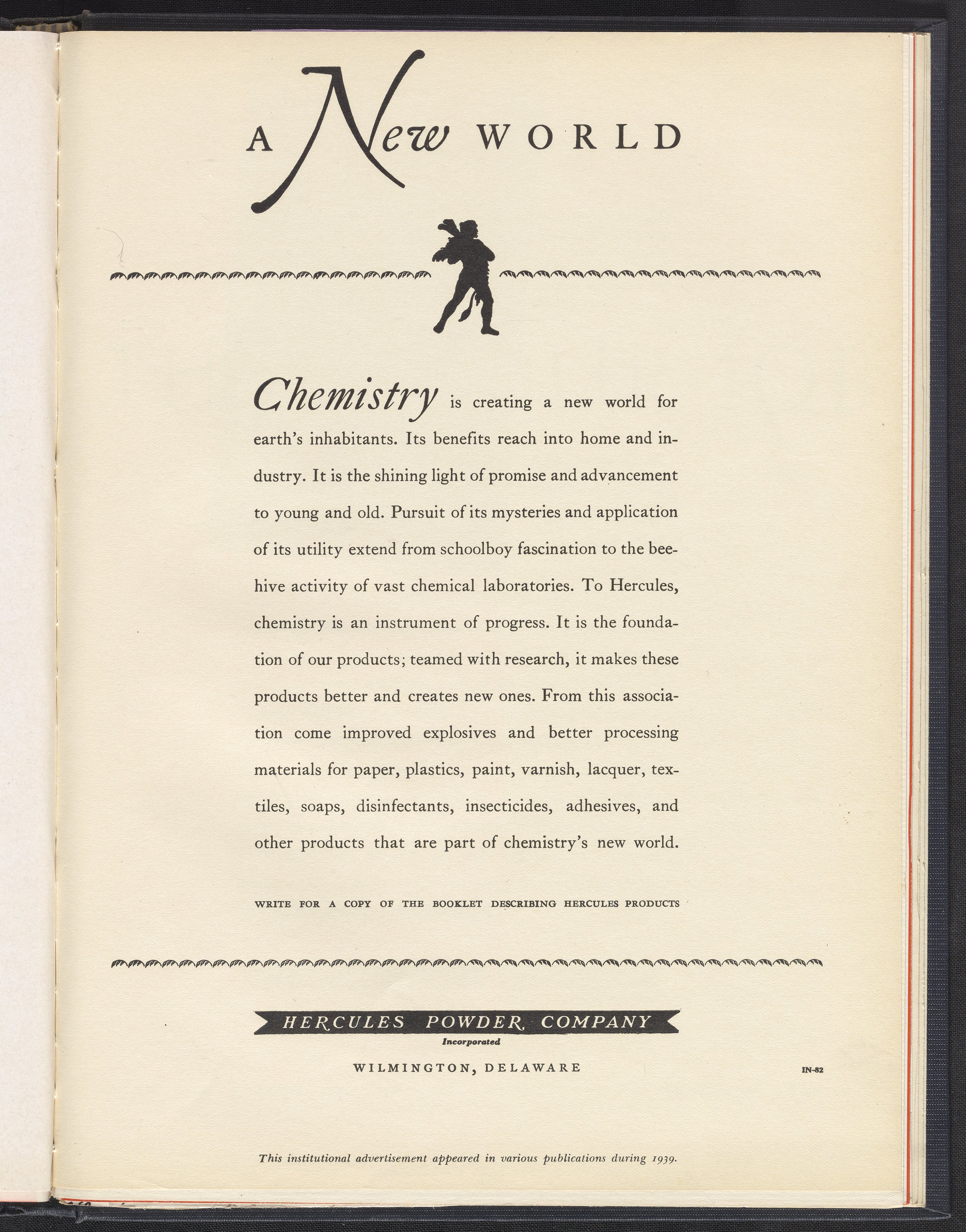 Hercules Incorporated. “Chemistry: A New World.” 1939 Hercules Advertisements, 1939. Records of Hercules Incorporated, Volume 1939. Science History Institute. Philadelphia. https://digital.sciencehistory.org/works/vq27zp216.