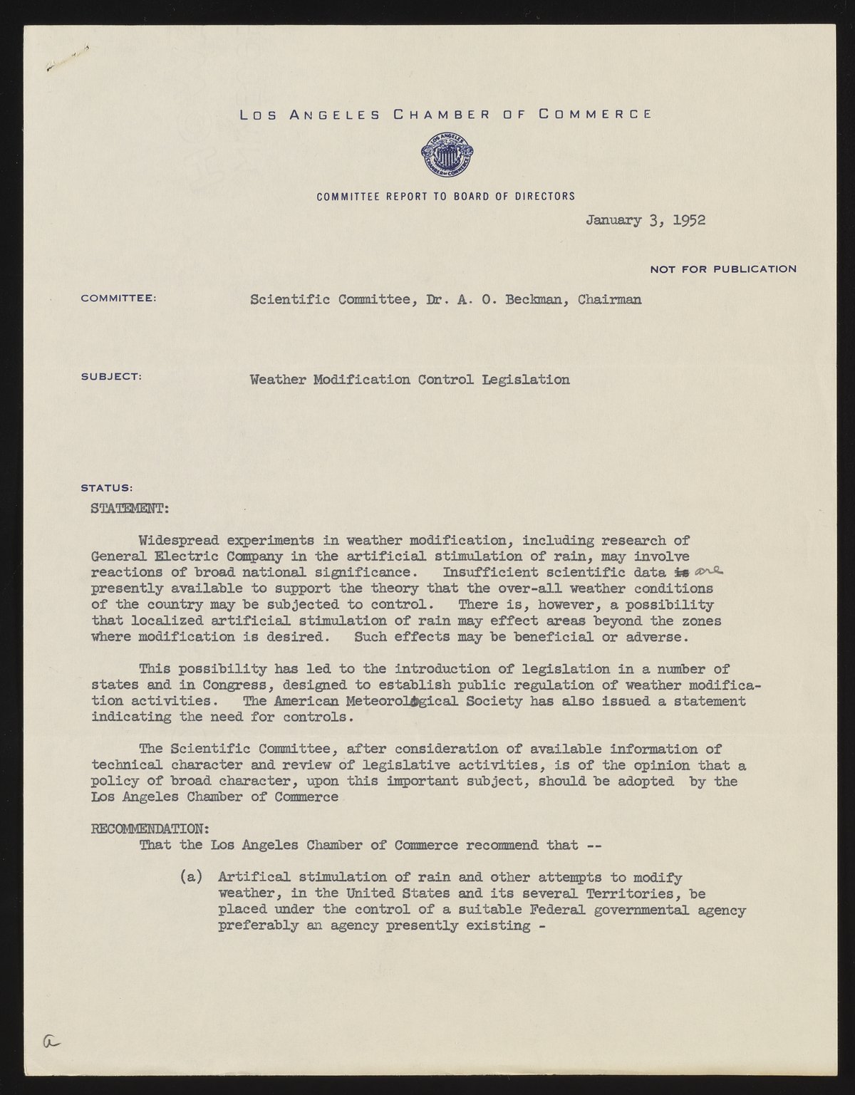 Los Angeles Chamber of Commerce. “Scientific Committee Report to the Los Angeles Chamber of Commerce Board of Directors,” January 3, 1952. Beckman Historical Collection, Box 1, Folder 33. Science History Institute. Philadelphia. https://digital.sciencehistory.org/works/vq27zp22g.