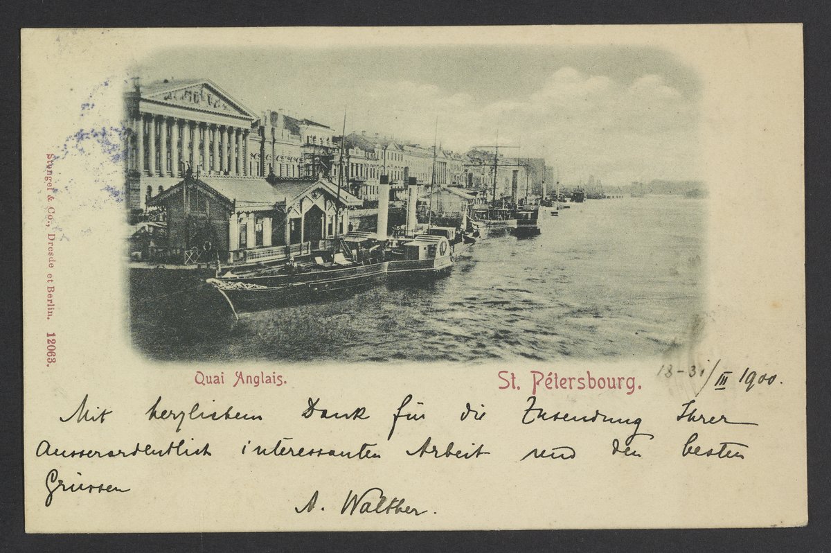 Small JPG1200 x 798px — 167 KBLarge JPG2880 x 1914px — 904 KBFull-sized JPG3578 x 2378px — 1.3 MBOriginal fileTIFF — 3578 x 2378px — 24.4 MBPostcard from A. Walther to Georg Bredig (1868-1944). The postcard features the english dock in St. Petersburg, Russia.