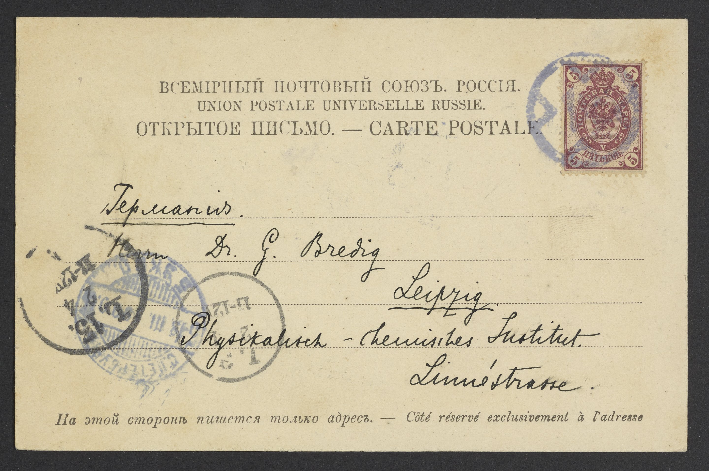 Walther, A. “Postcard from A. Walther to Georg Bredig,” March 1900. Papers of Georg and Max Bredig, Box 22. Science History Institute. Philadelphia. https://digital.sciencehistory.org/works/vs4nxhu.
