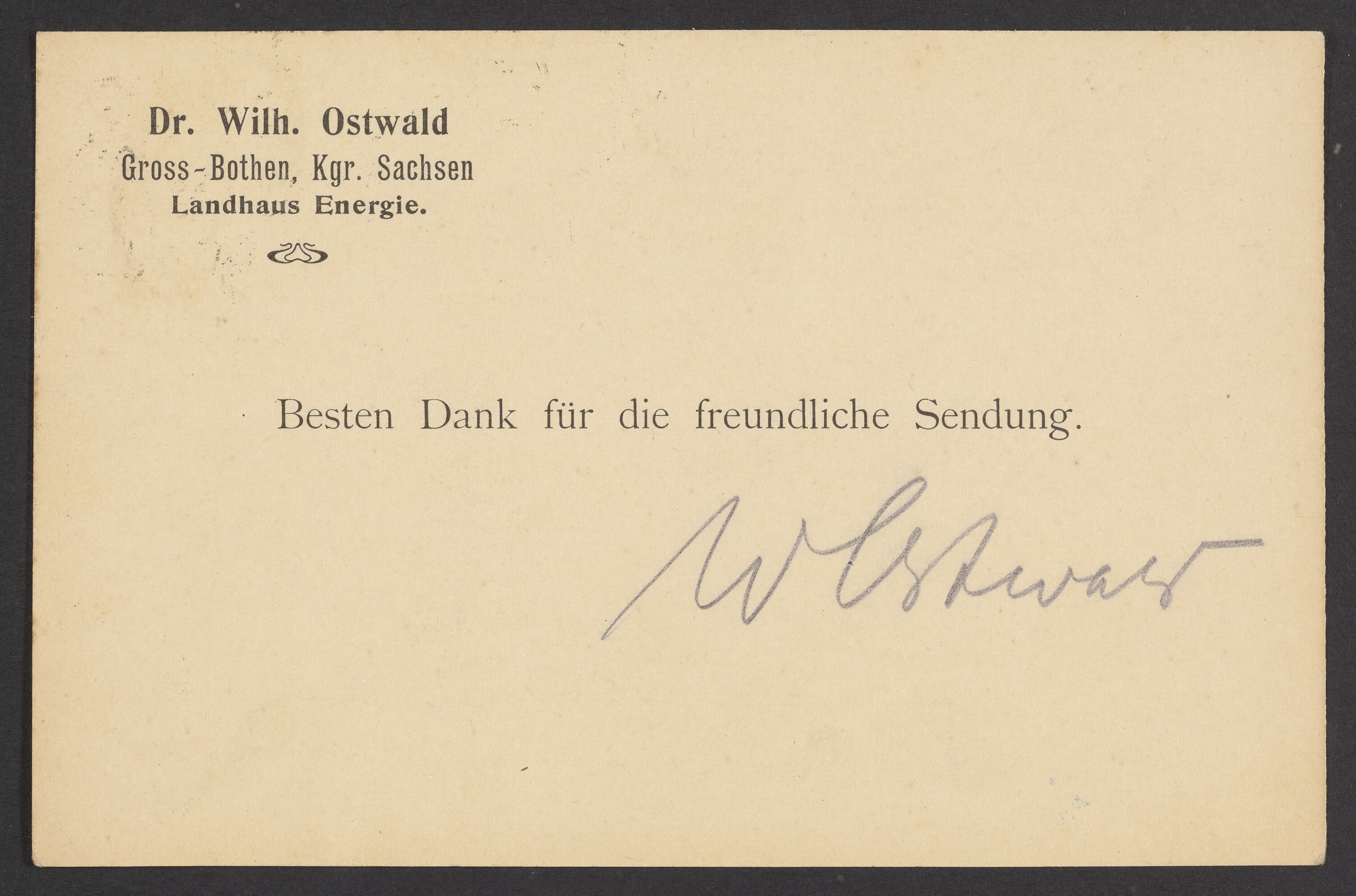 Small JPG1200 x 796px — 116 KBLarge JPG2880 x 1911px — 686 KBFull-sized JPG3538 x 2348px — 1015 KBOriginal fileTIFF — 3538 x 2348px — 23.8 MBWilhelm Ostwald (1853-1932) sends his thanks to Georg Bredig (1868-1944) for his correspondence.