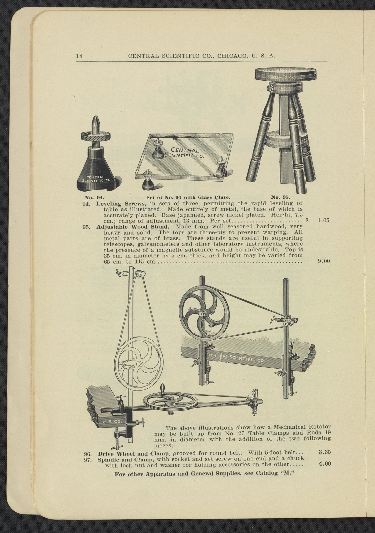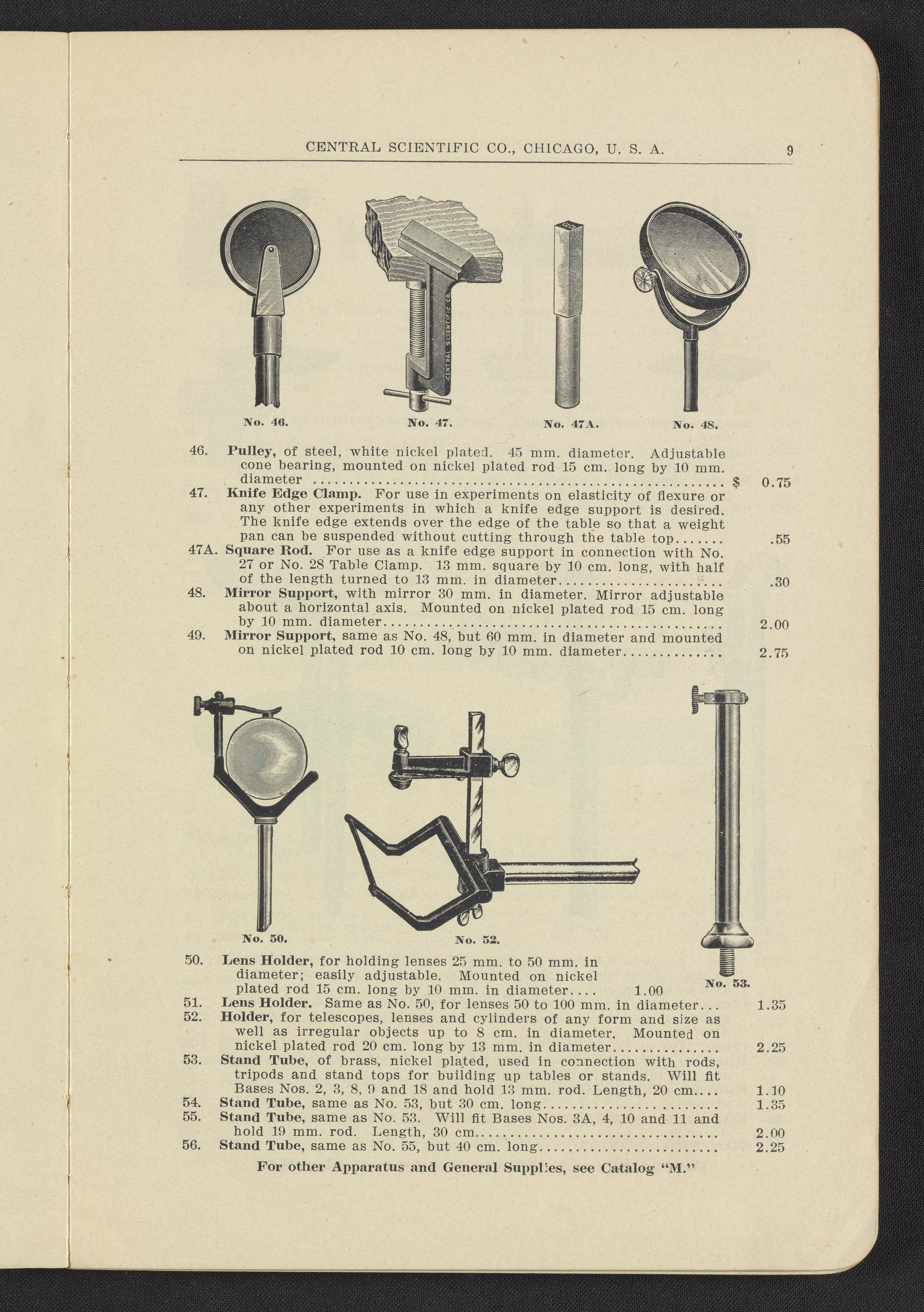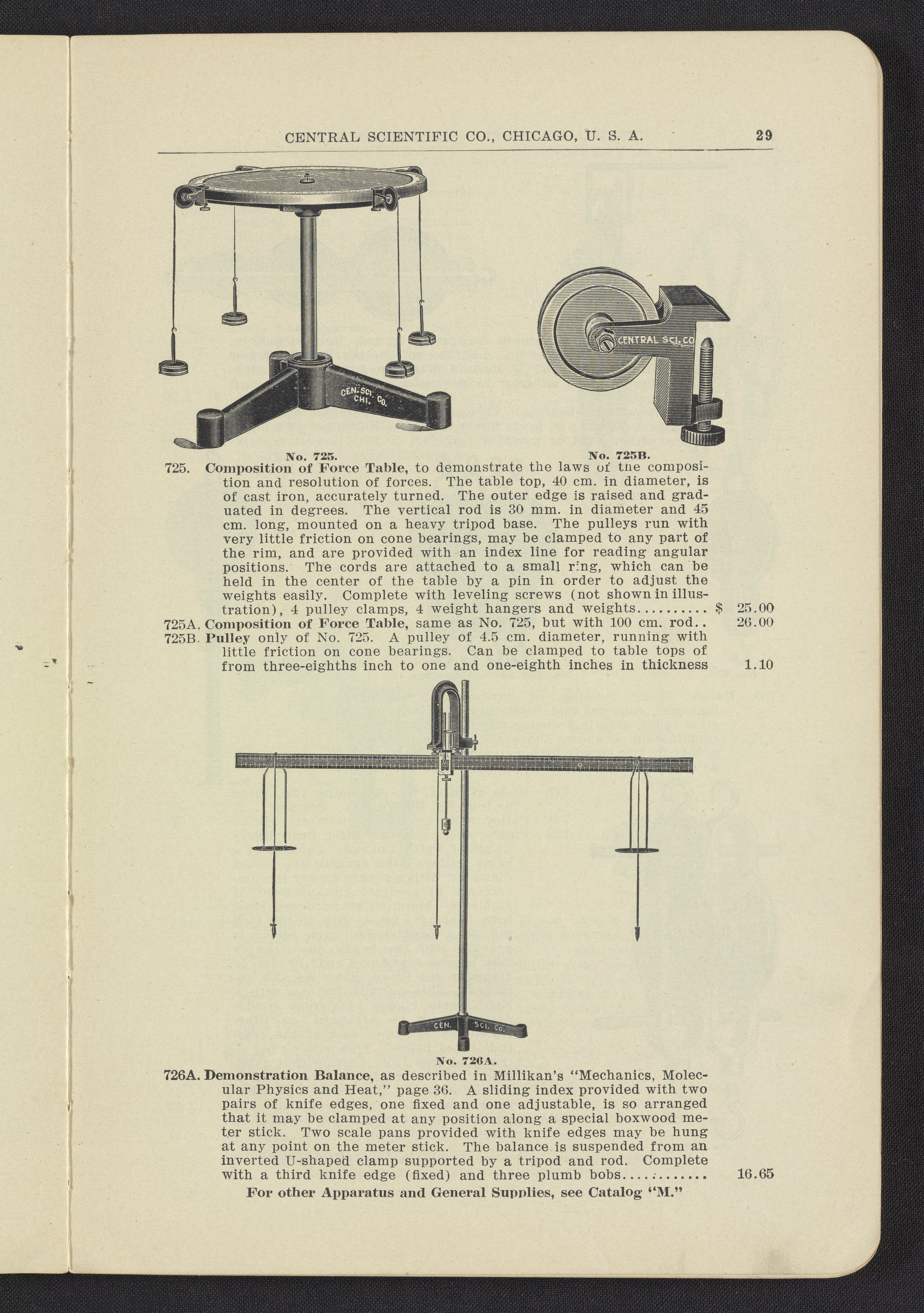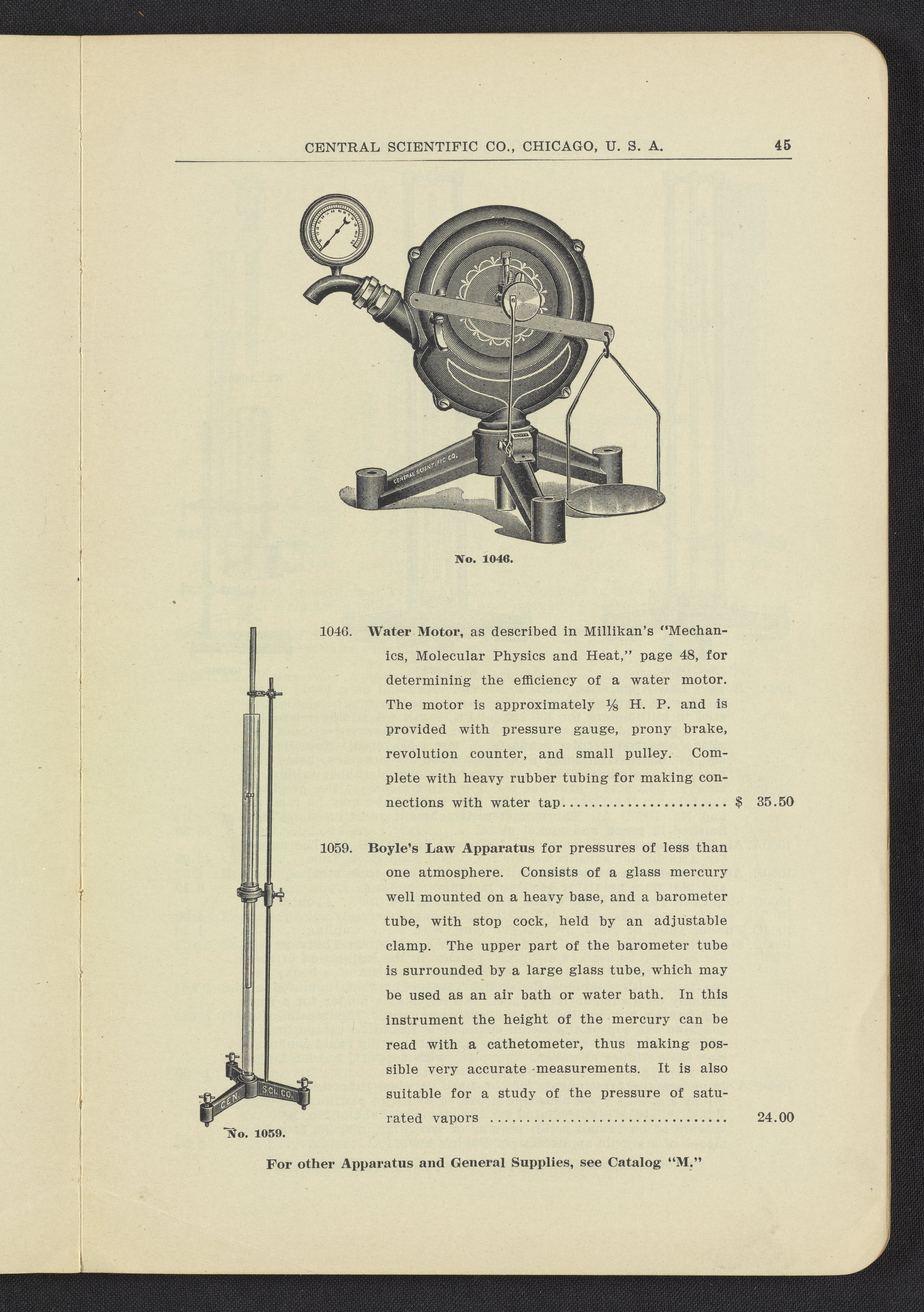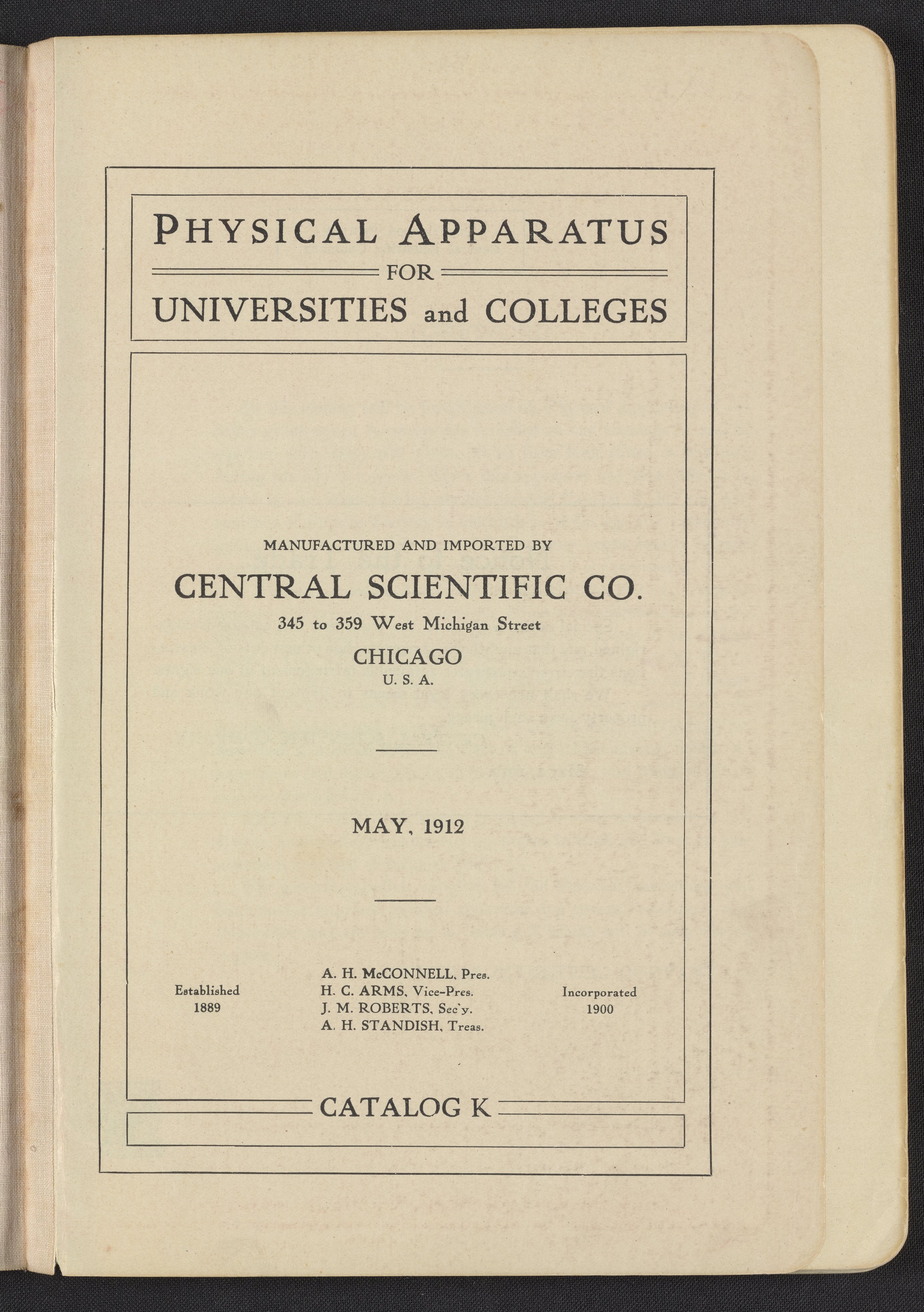 Central Scientific Company. “Physical Apparatus for Universities and Colleges Manufactured and Imported by Central Scientific Co.” Chicago, Illinois: Central Scientific Company, 1912. Q185.7 .C46 1912. Science History Institute. Philadelphia. https://digital.sciencehistory.org/works/vt150k323.