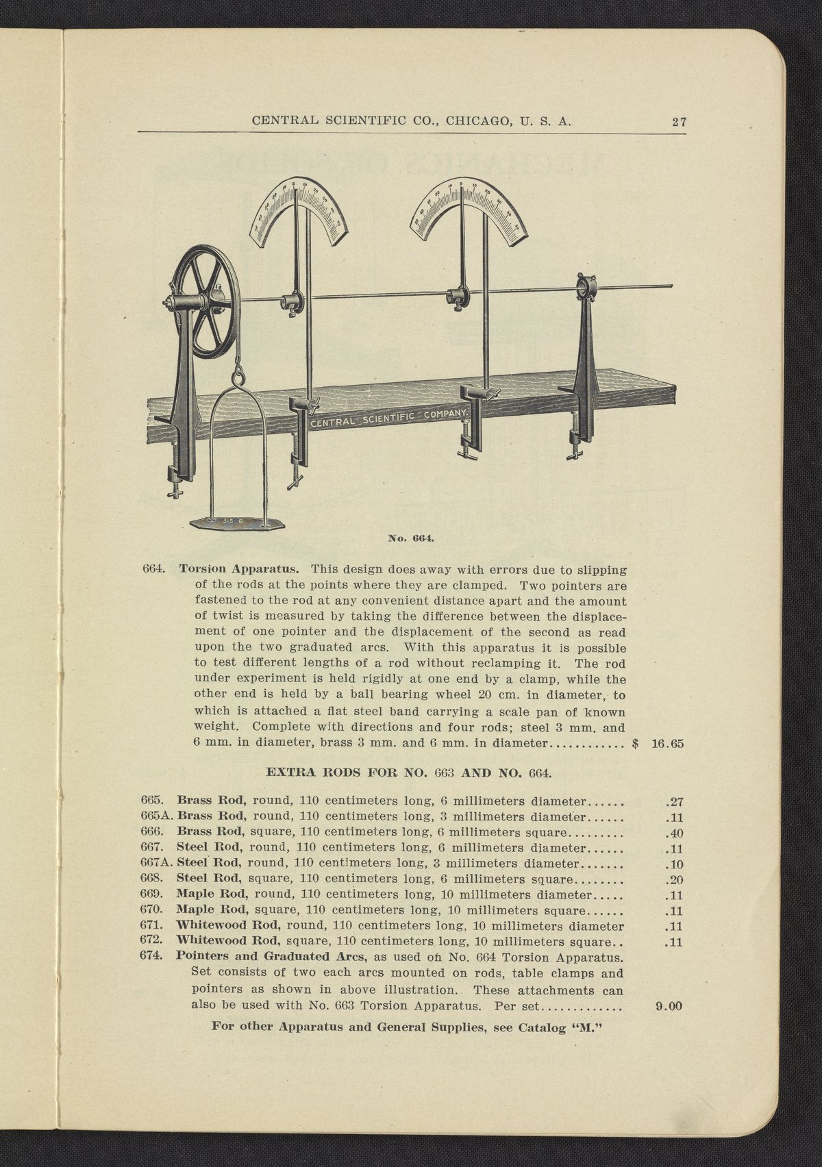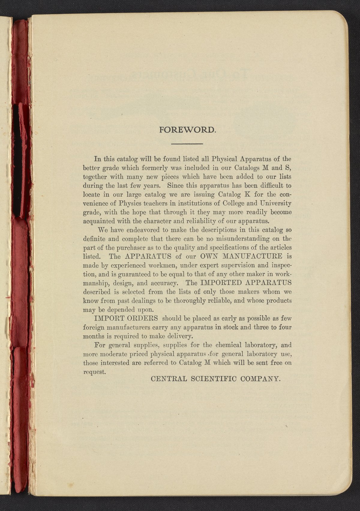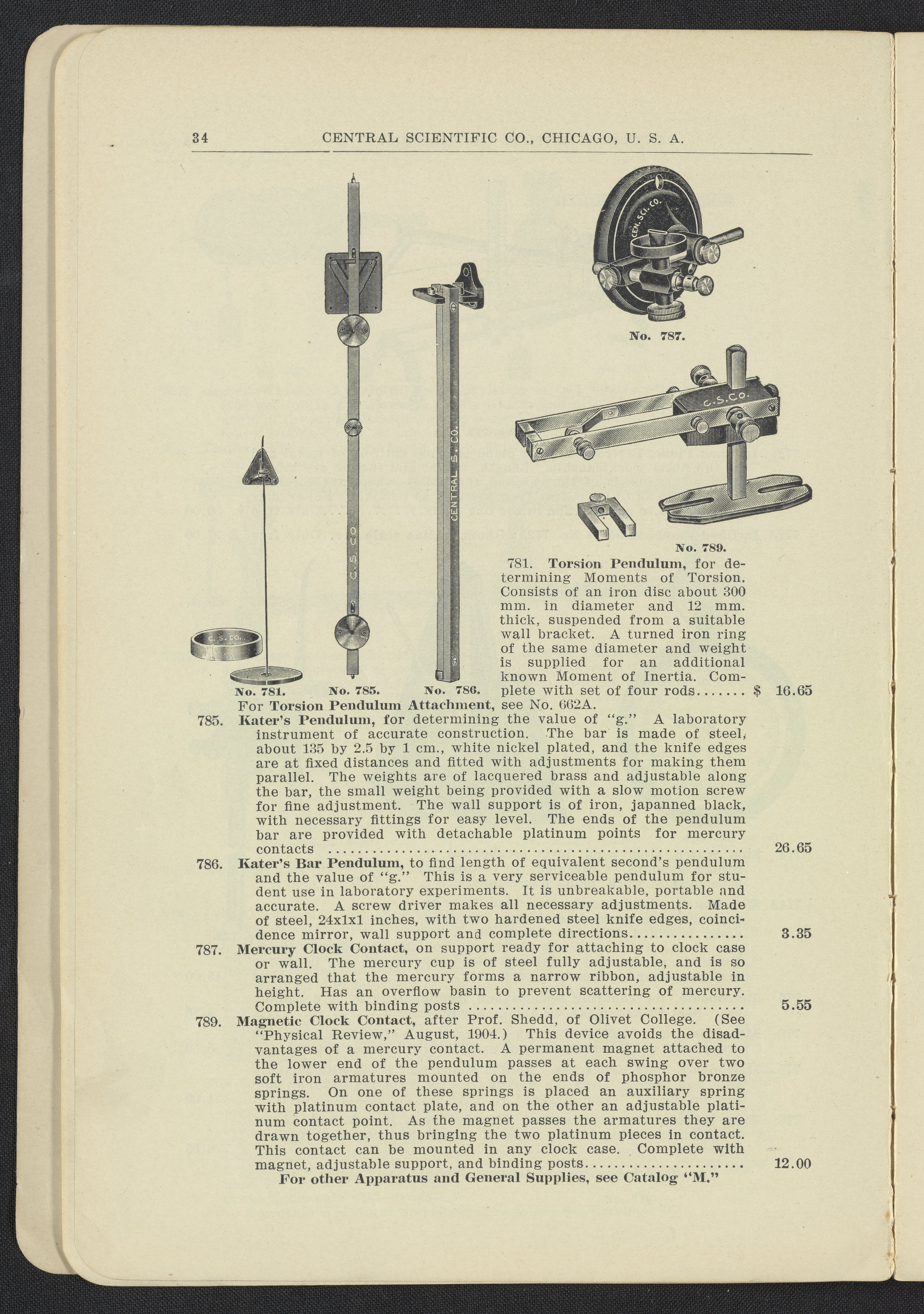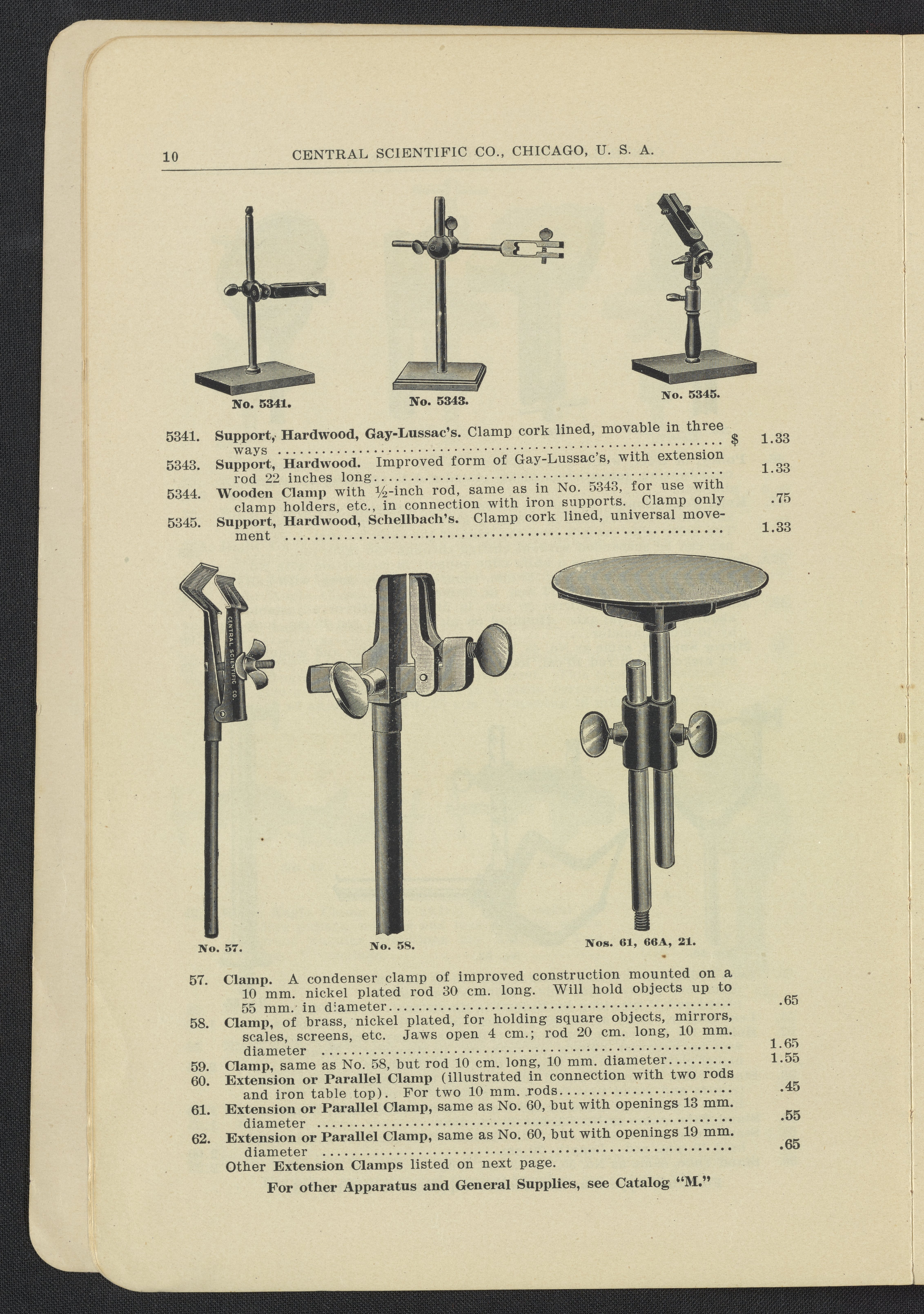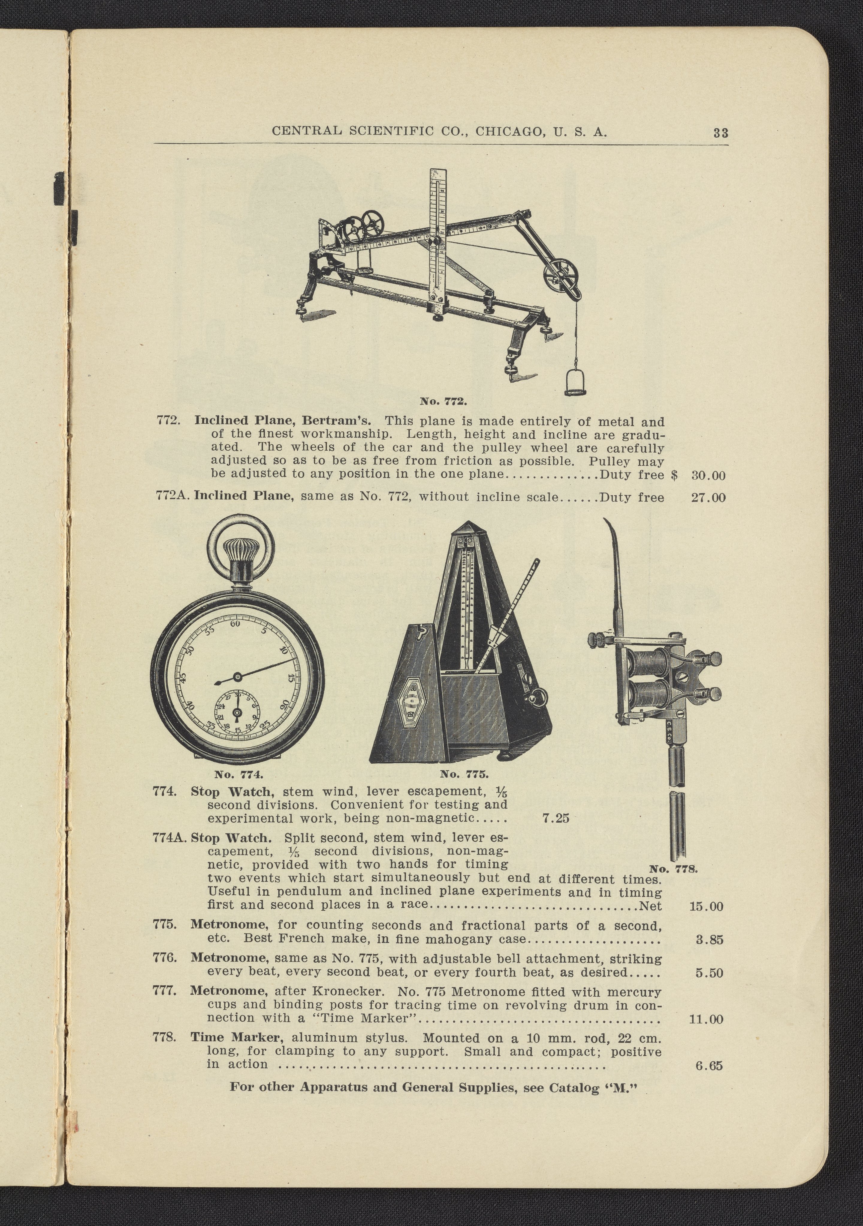 Central Scientific Company. “Physical Apparatus for Universities and Colleges Manufactured and Imported by Central Scientific Co.” Chicago, Illinois: Central Scientific Company, 1912. Q185.7 .C46 1912. Science History Institute. Philadelphia. https://digital.sciencehistory.org/works/vt150k323.