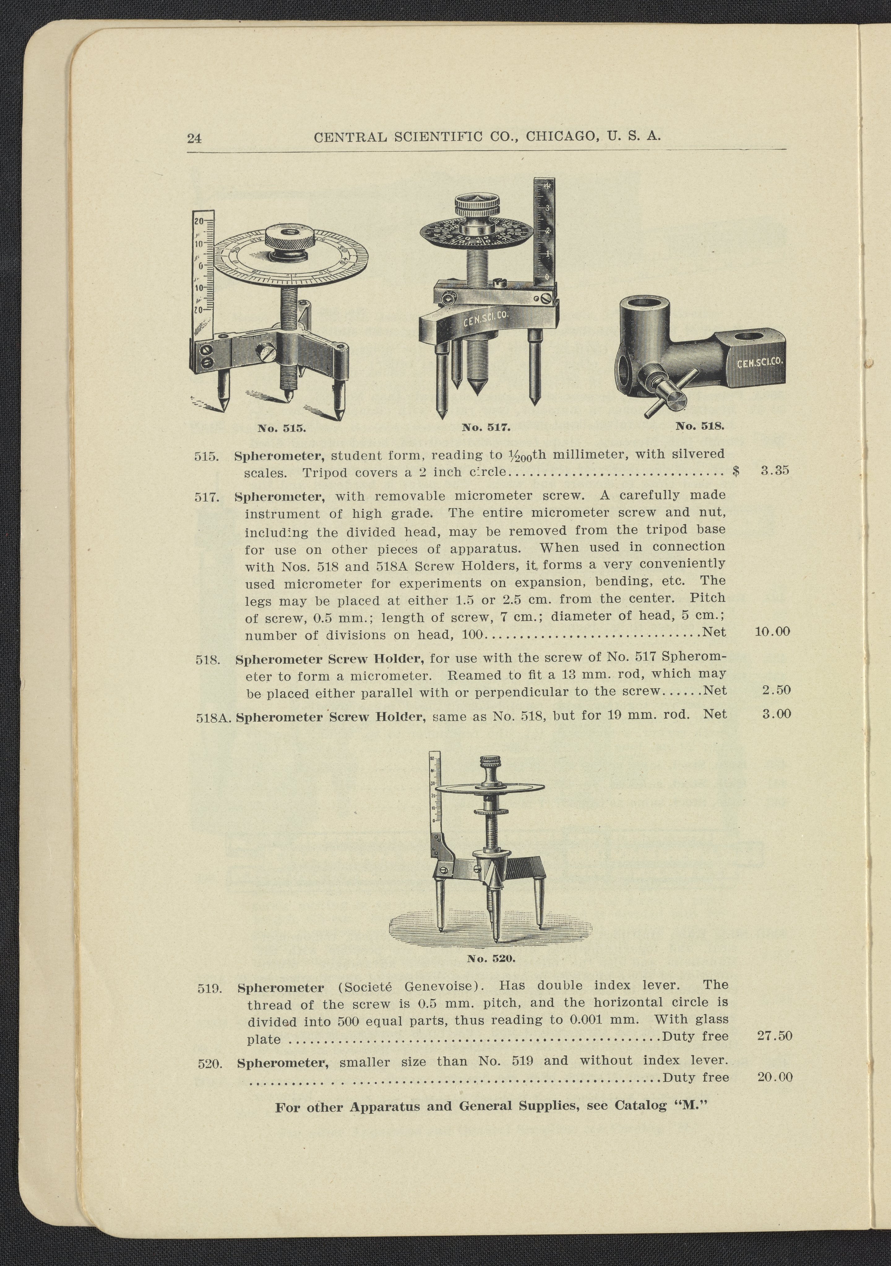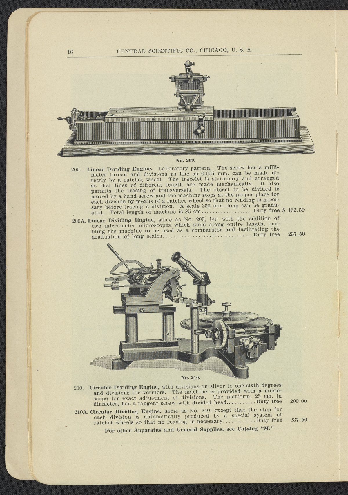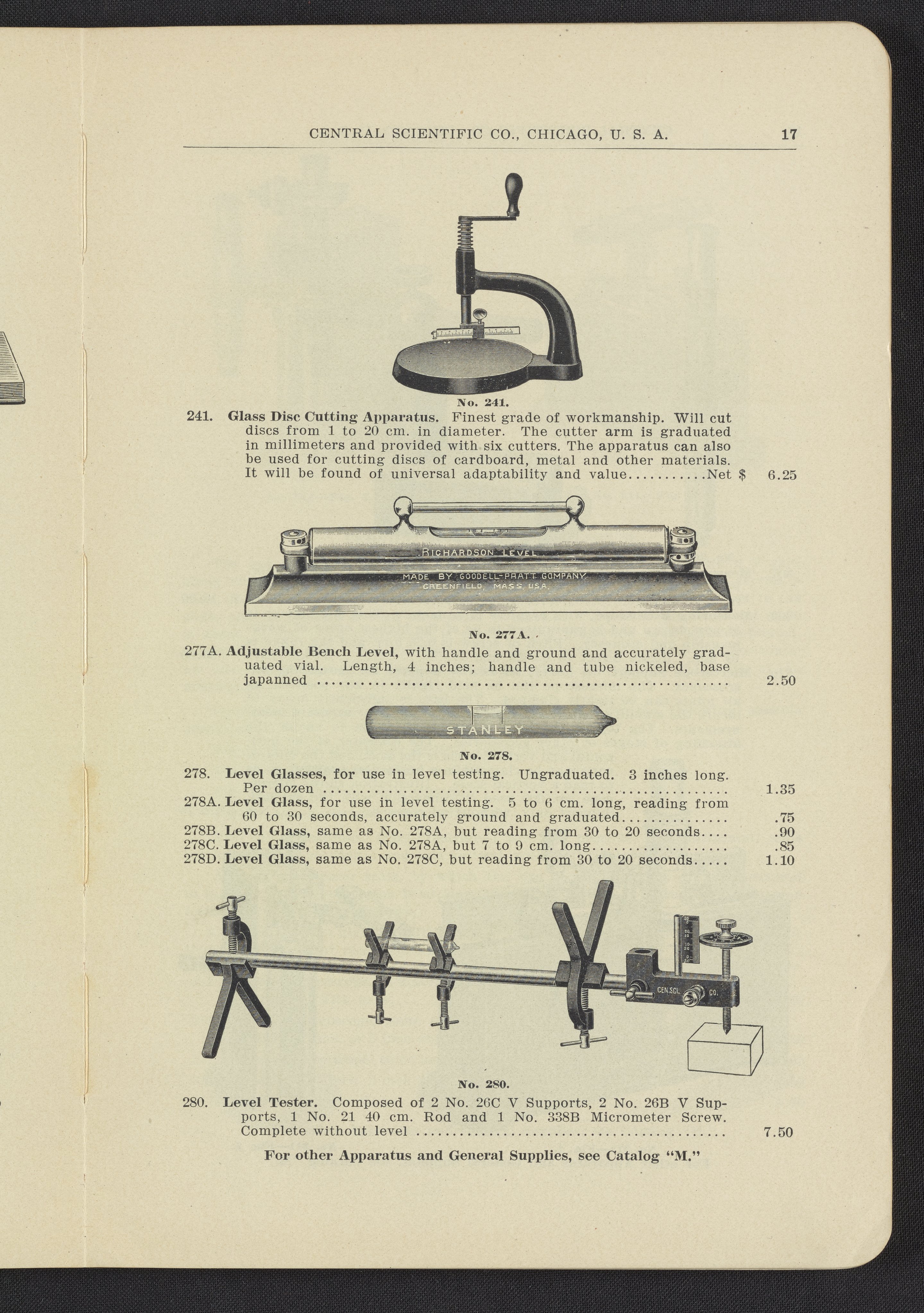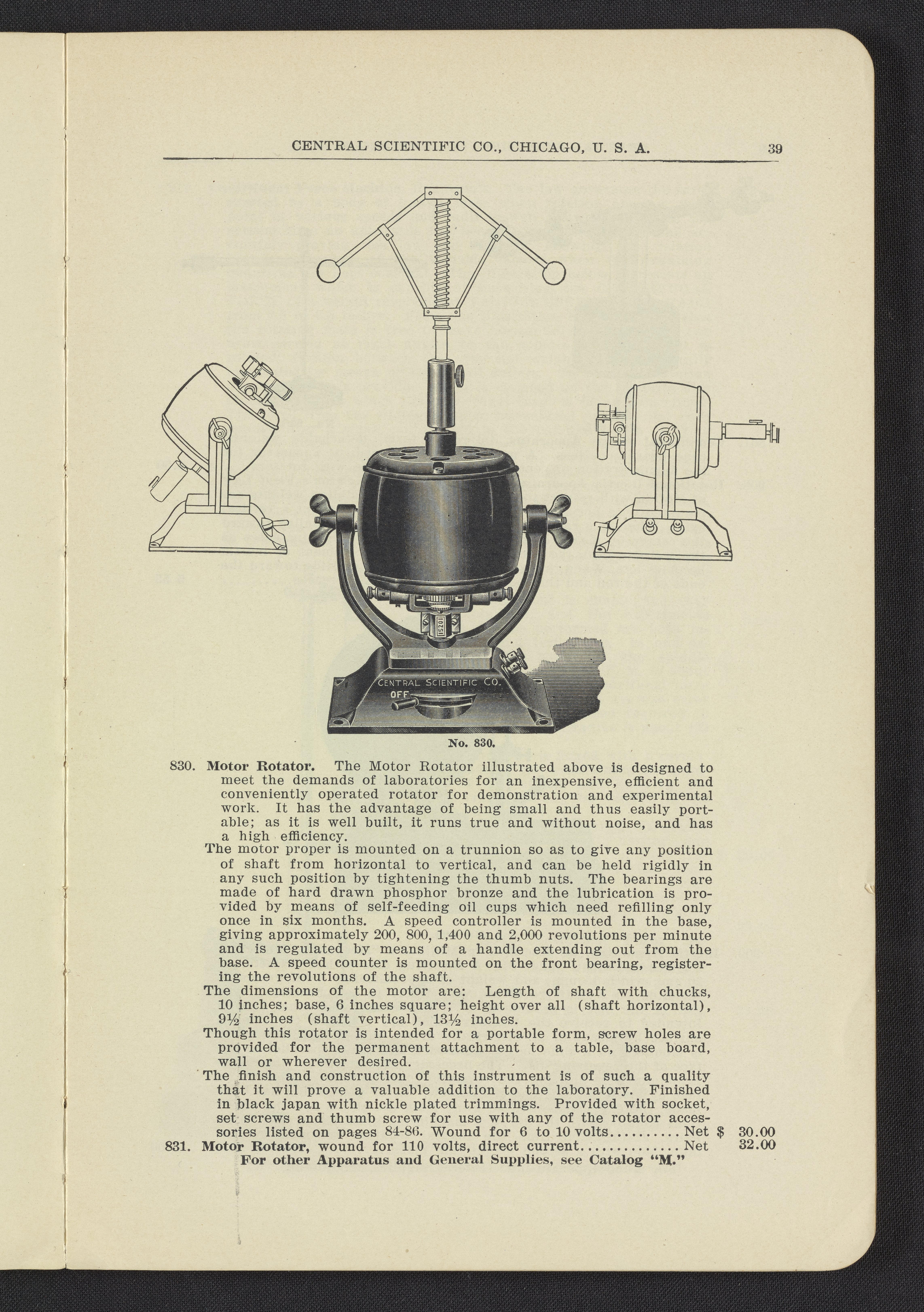 Small JPG1200 x 1716px — 412 KBLarge JPG2880 x 4119px — 2.5 MBFull-sized JPG4418 x 6319px — 5.4 MBOriginal fileTIFF — 4418 x 6319px — 79.9 MBA catalog of laboratory instruments for the physical sciences made by the Central Scientific Company. Founded in 1900 in downtown Chicago, Central Scientific manufactured and distributed science teaching equipment for schools, colleges, and universities by catalog mail order. The trademark CENCO was used from 1909 onwards. The entire work is digitized. Includes an index starting on page 175 and printed illustrations.