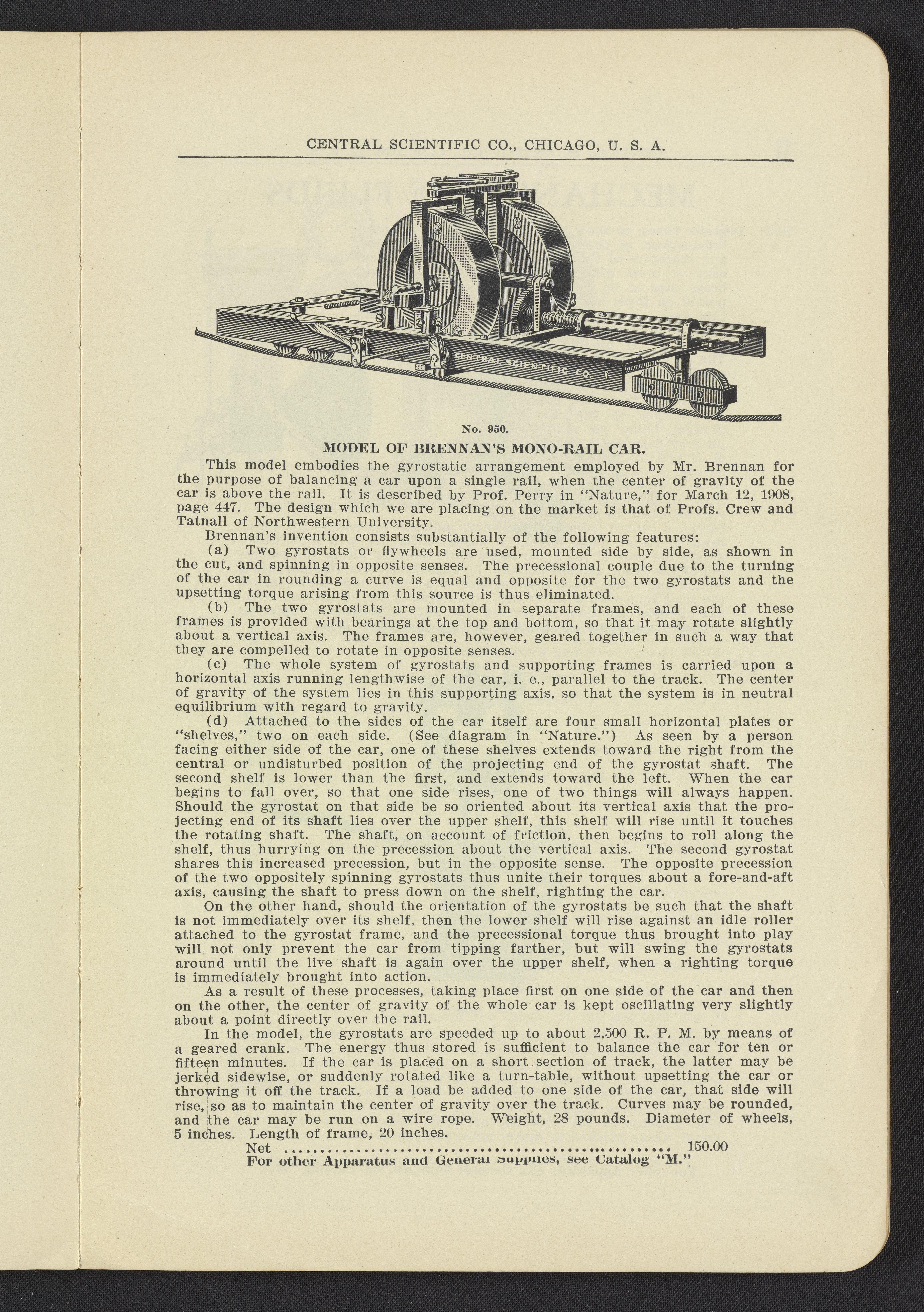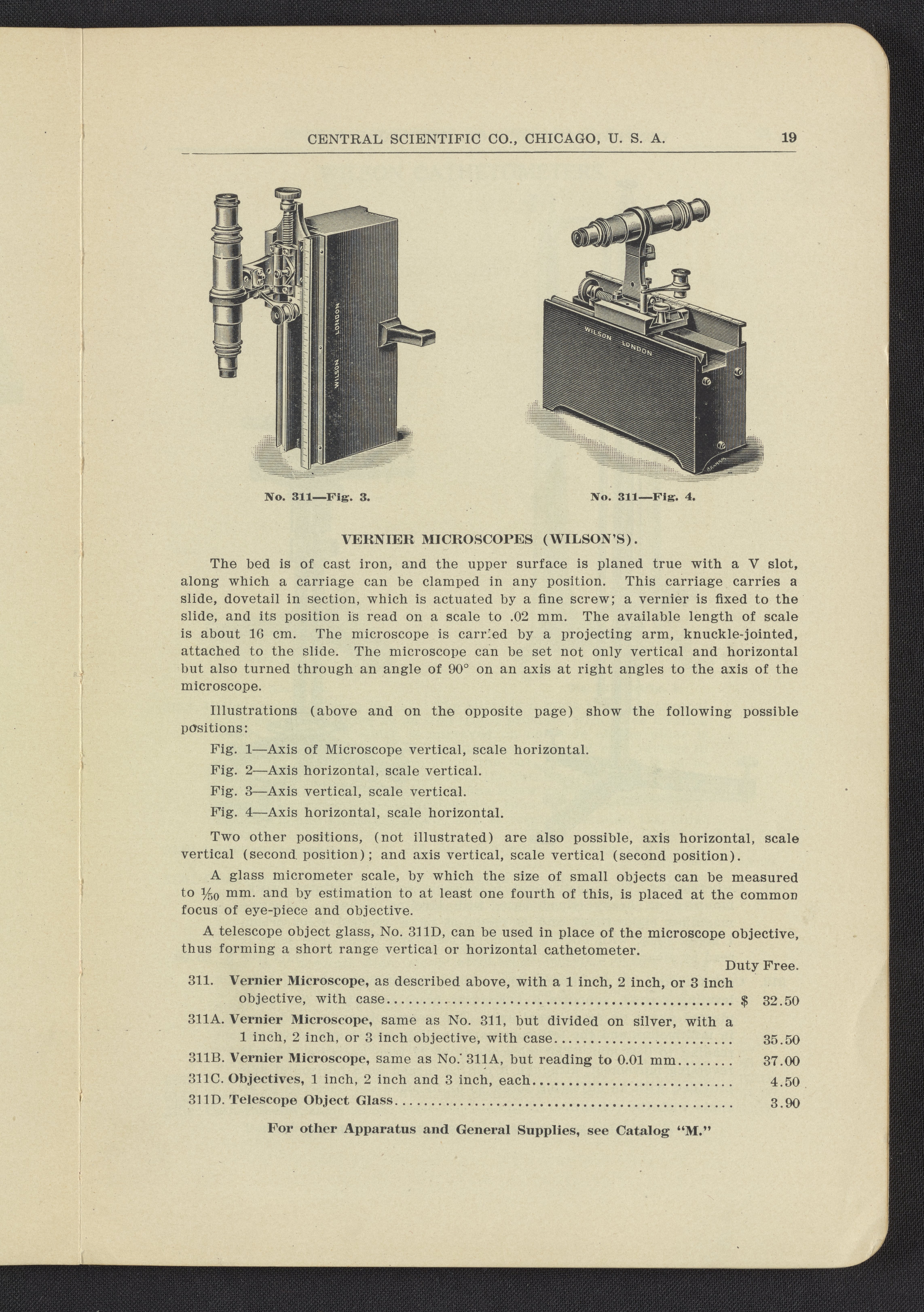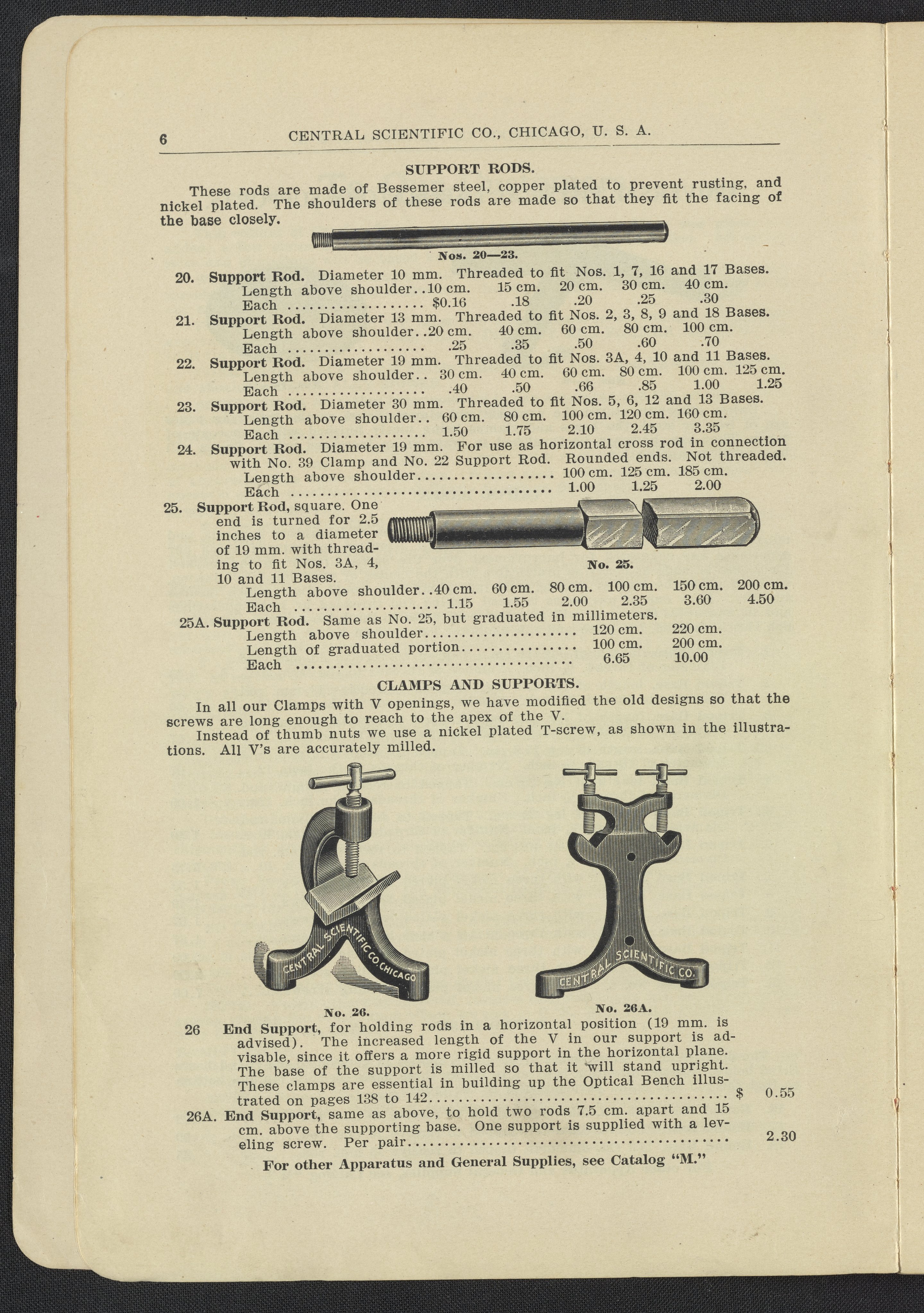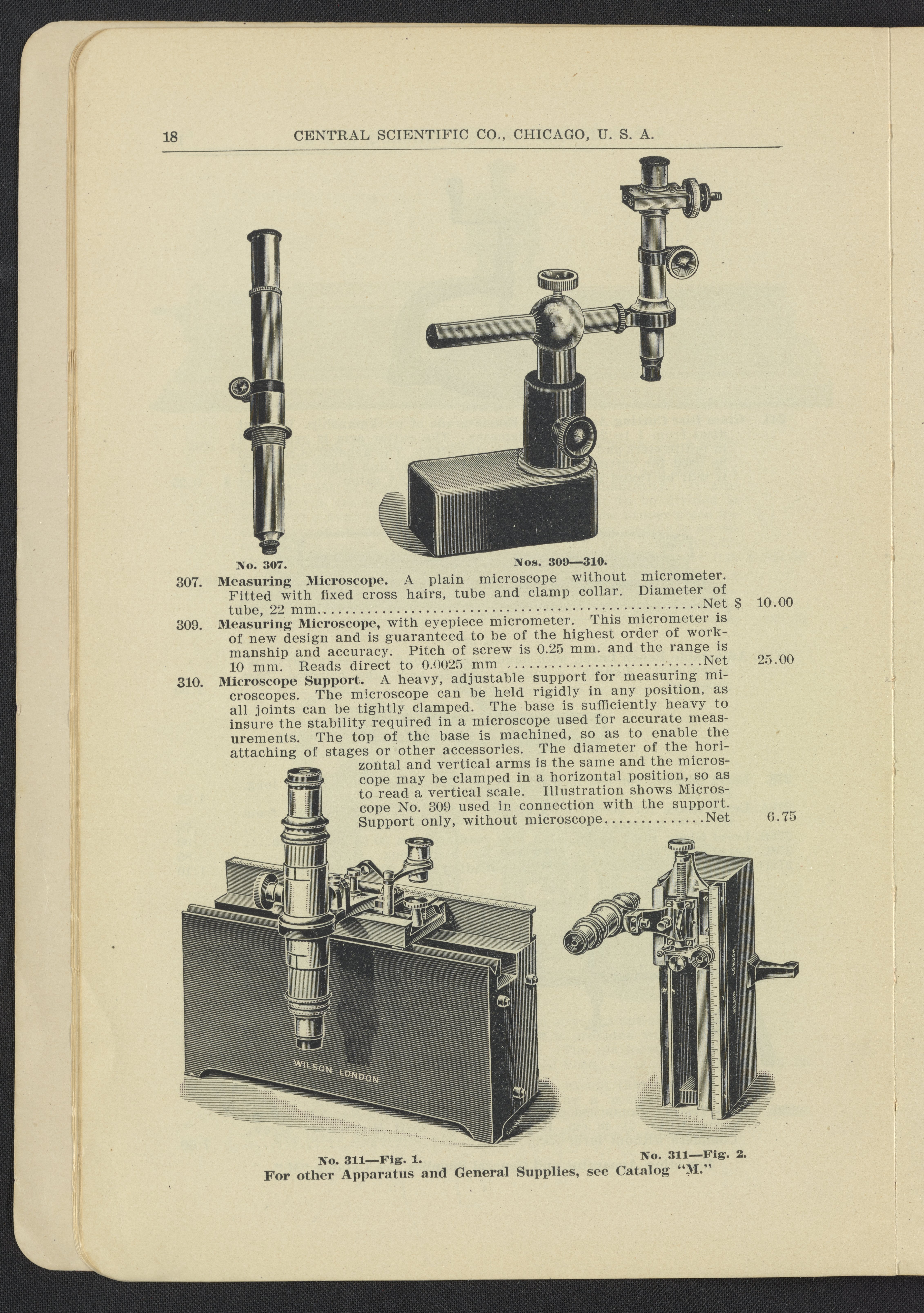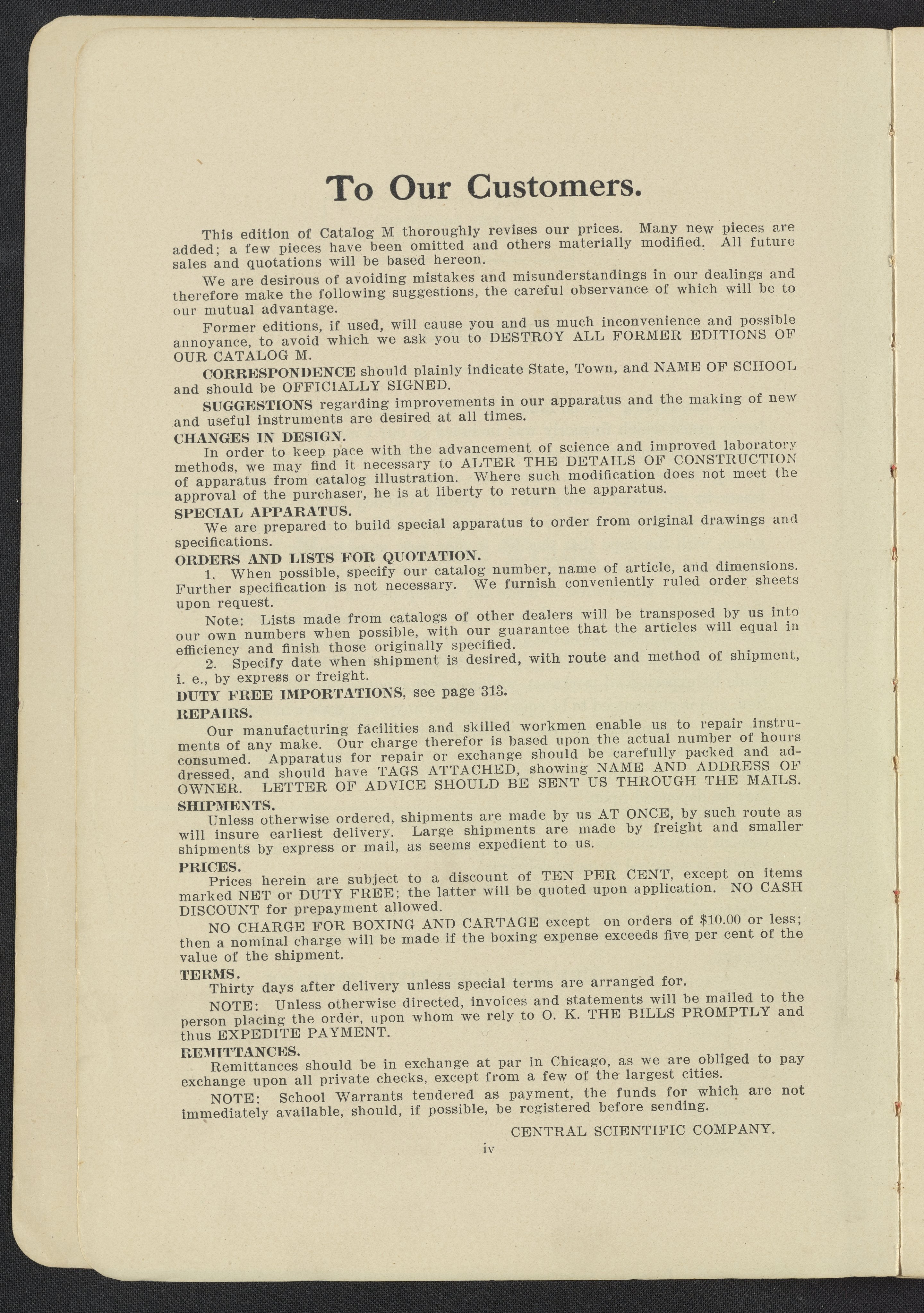 Small JPG1200 x 1716px — 412 KBLarge JPG2880 x 4119px — 2.5 MBFull-sized JPG4418 x 6319px — 5.4 MBOriginal fileTIFF — 4418 x 6319px — 79.9 MBA catalog of laboratory instruments for the physical sciences made by the Central Scientific Company. Founded in 1900 in downtown Chicago, Central Scientific manufactured and distributed science teaching equipment for schools, colleges, and universities by catalog mail order. The trademark CENCO was used from 1909 onwards. The entire work is digitized. Includes an index starting on page 175 and printed illustrations.