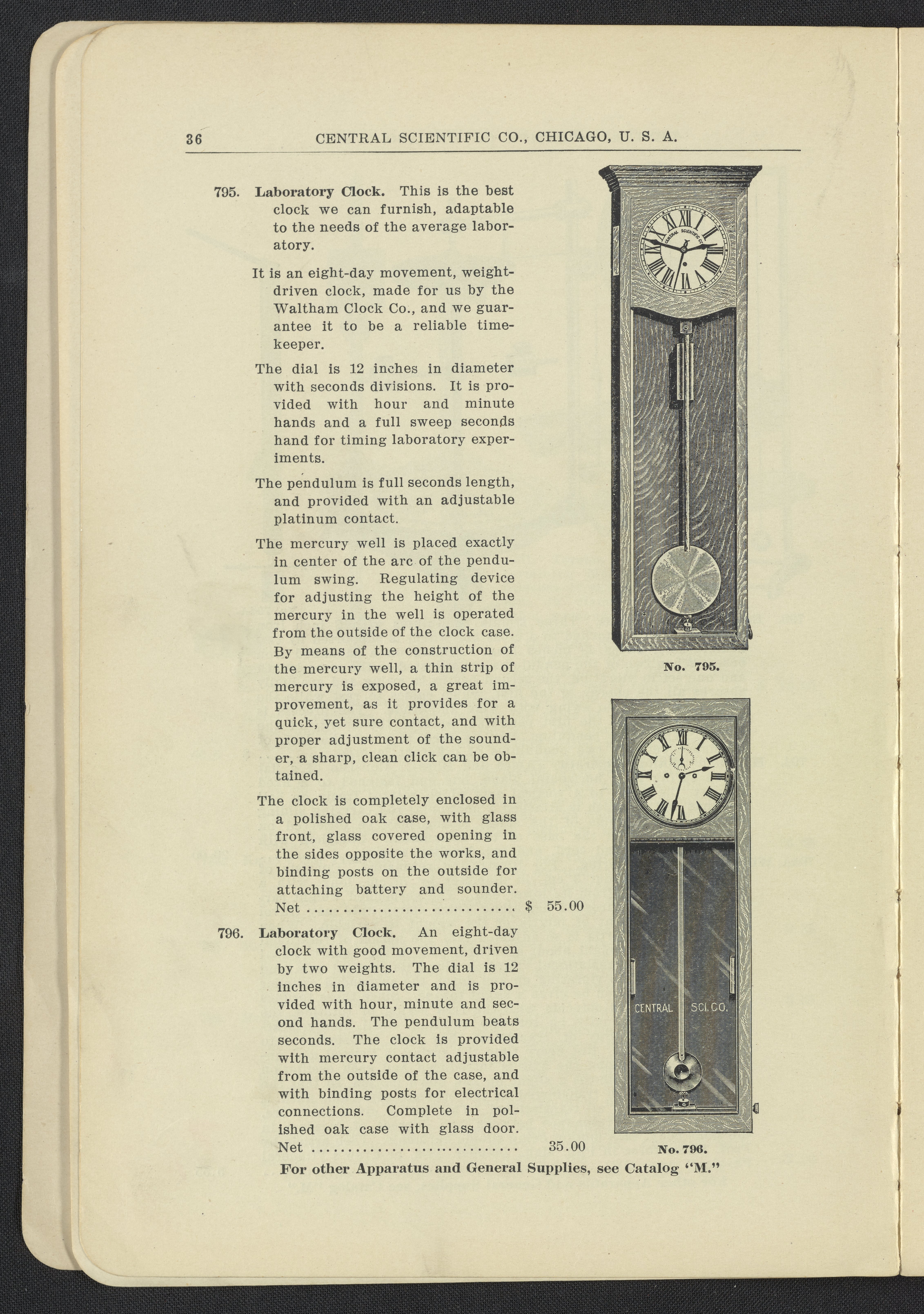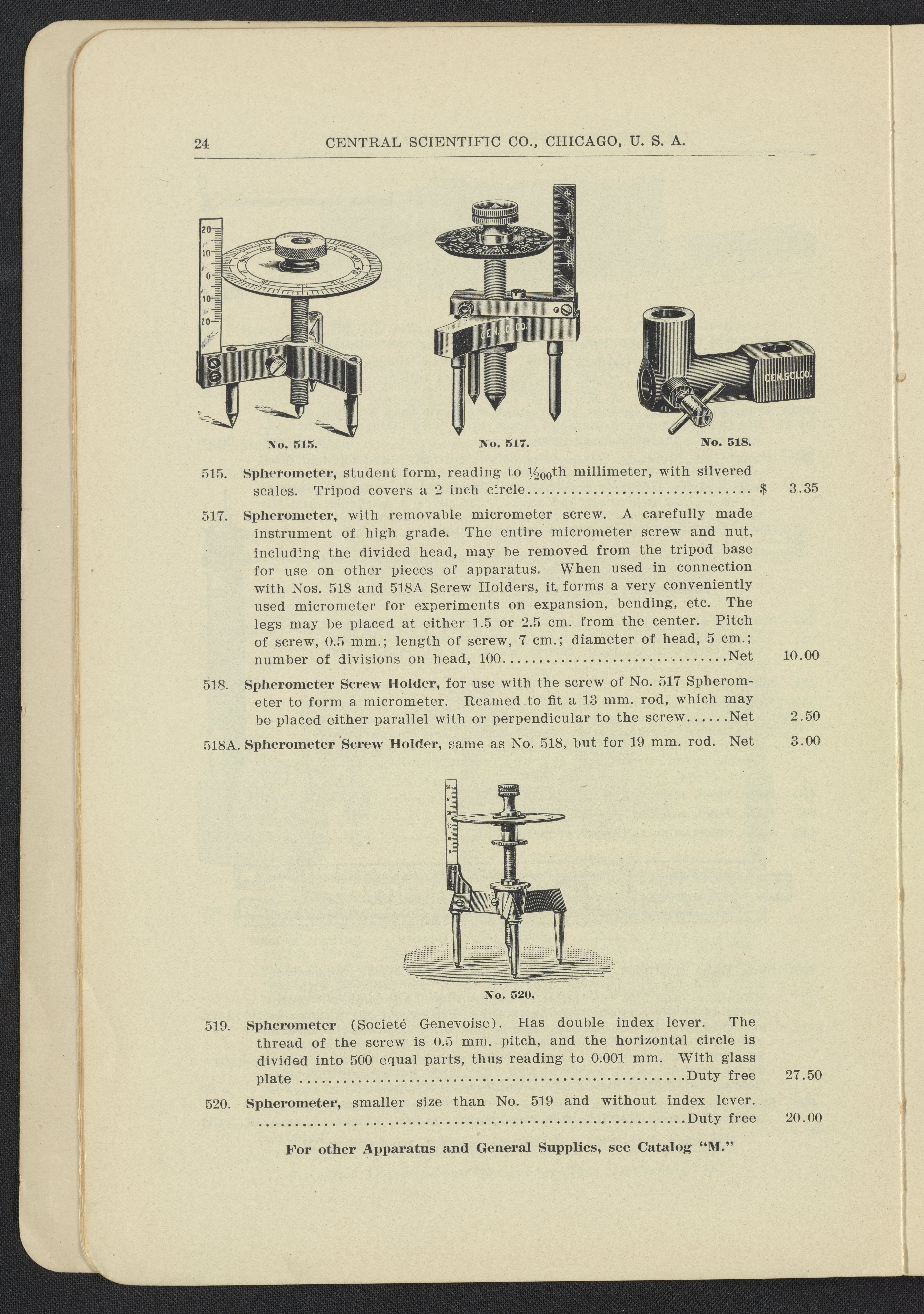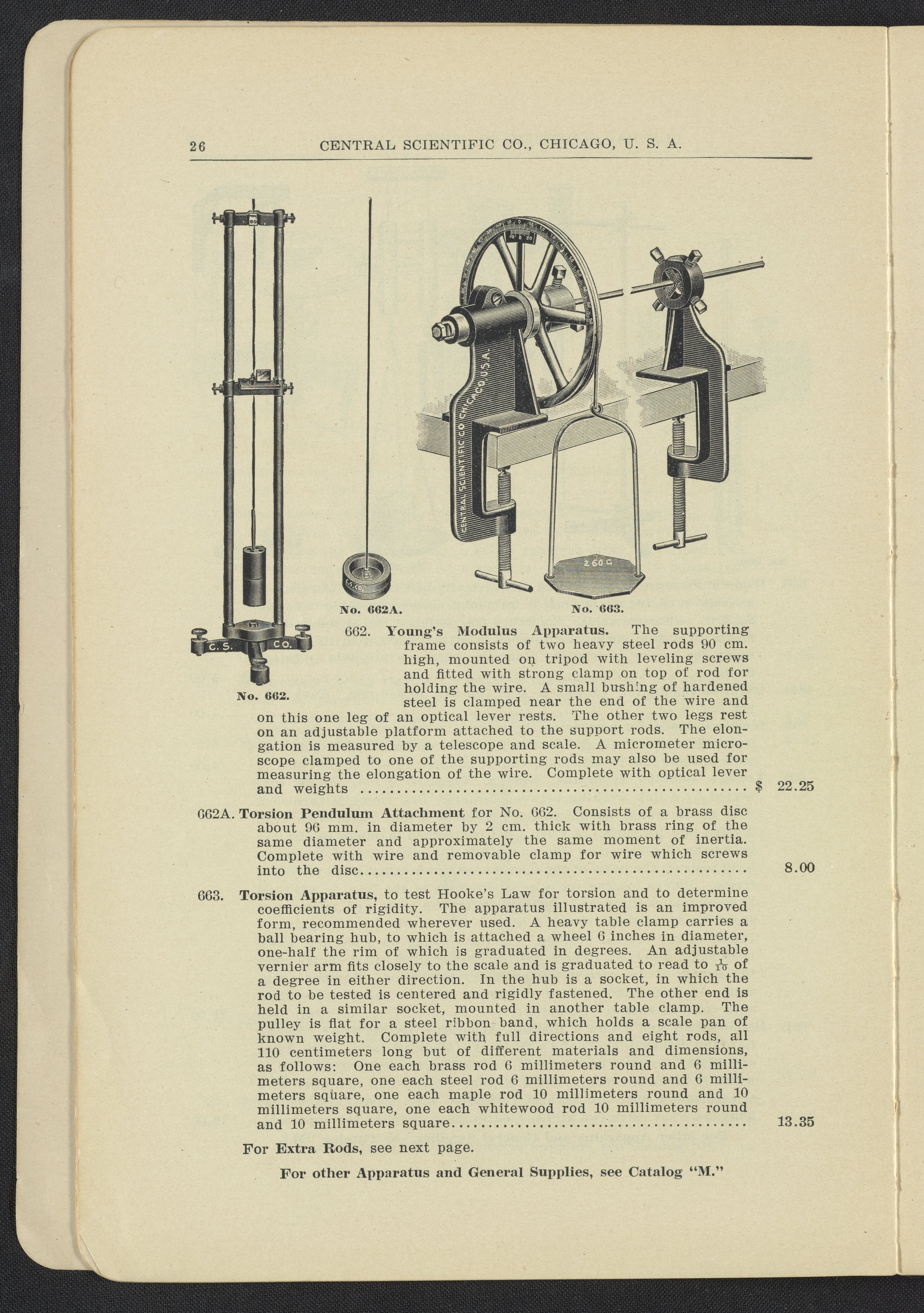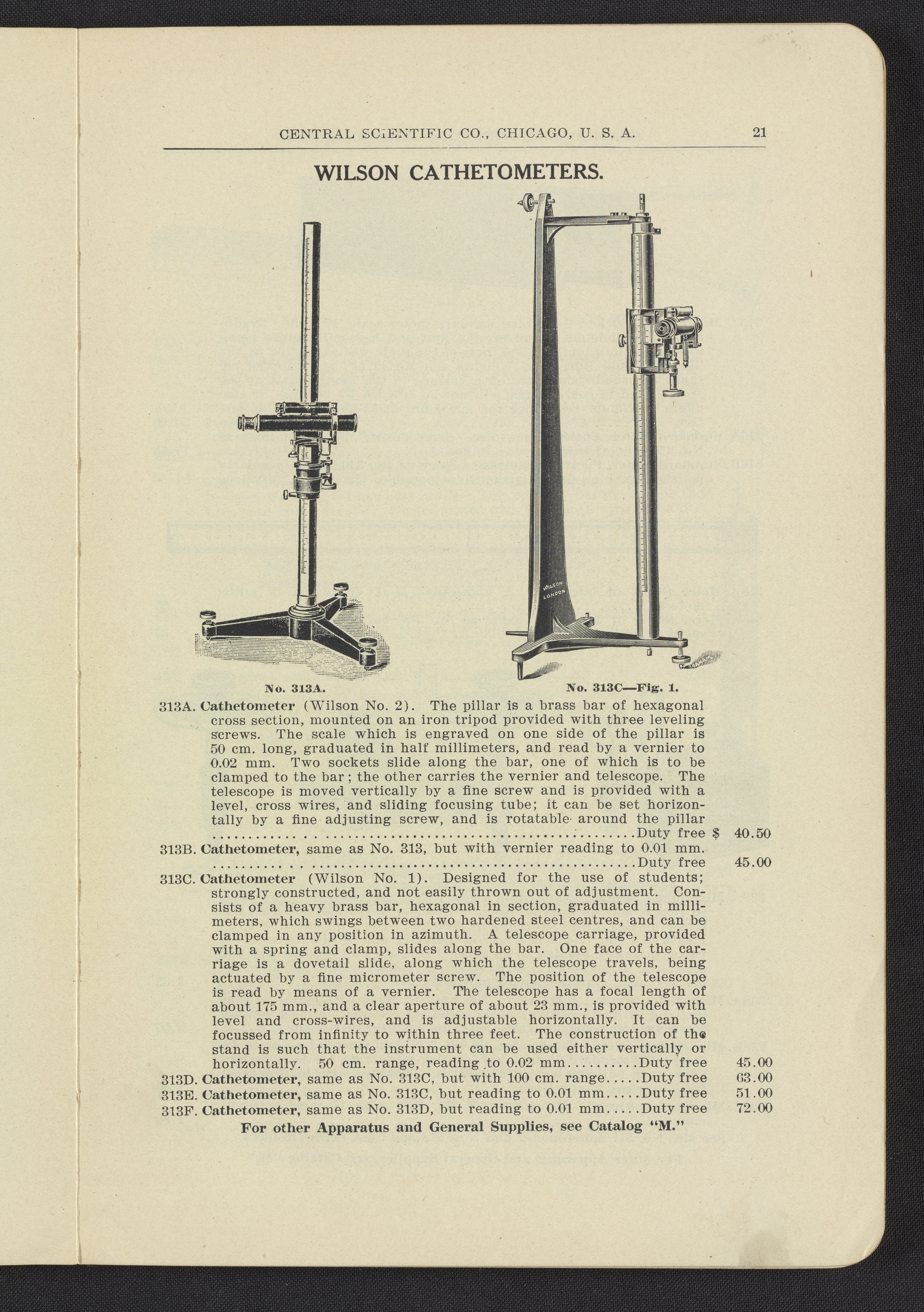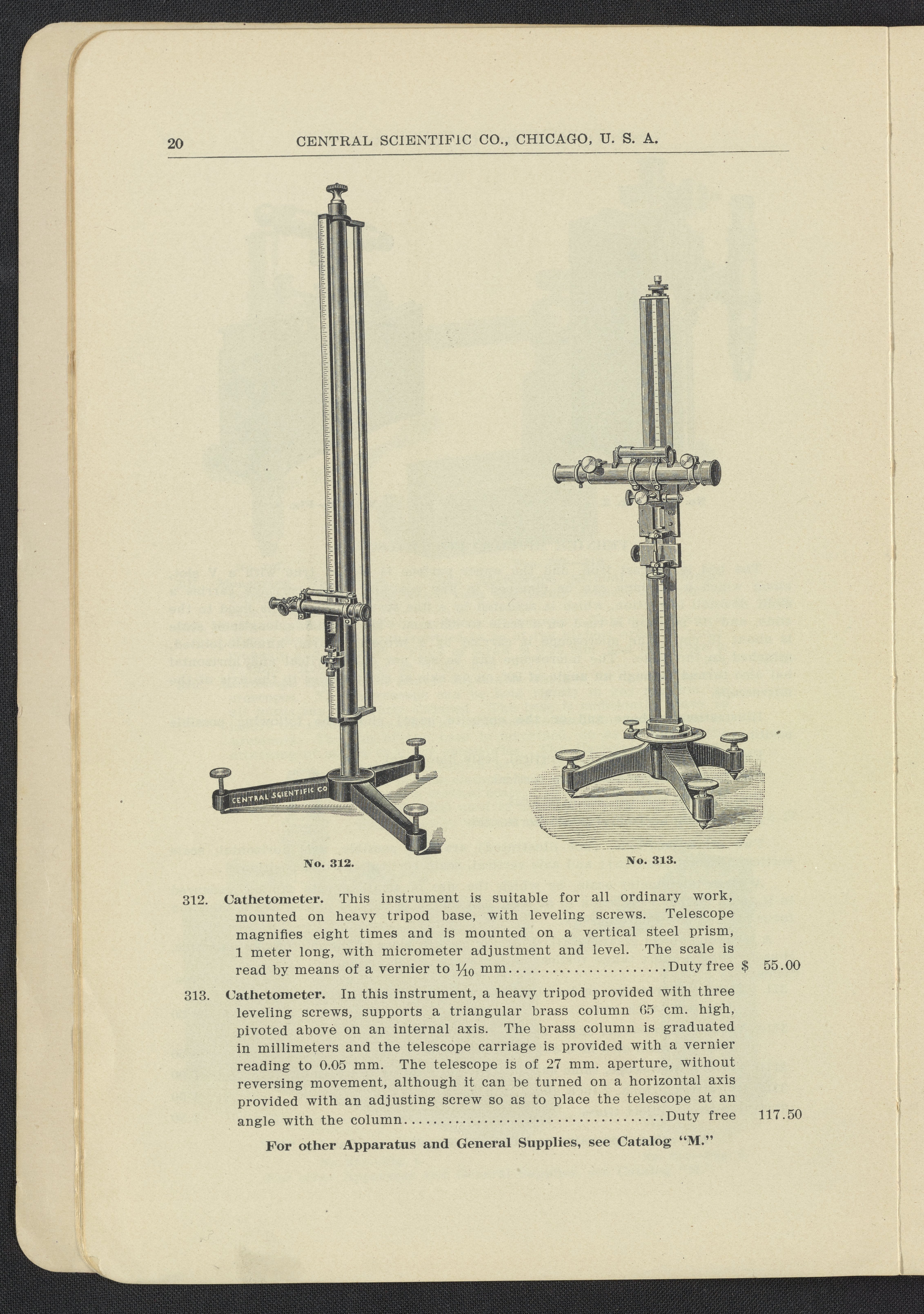 Part of Catalog K: Physical Apparatus for Universities and Colleges, a catalog of laboratory instruments for the physical sciences made by the Central Scientific Company. Founded in 1900 in downtown Chicago, Central Scientific manufactured and distributed science teaching equipment for schools, colleges, and universities by catalog mail order. The trademark CENCO was used from 1909 onwards.