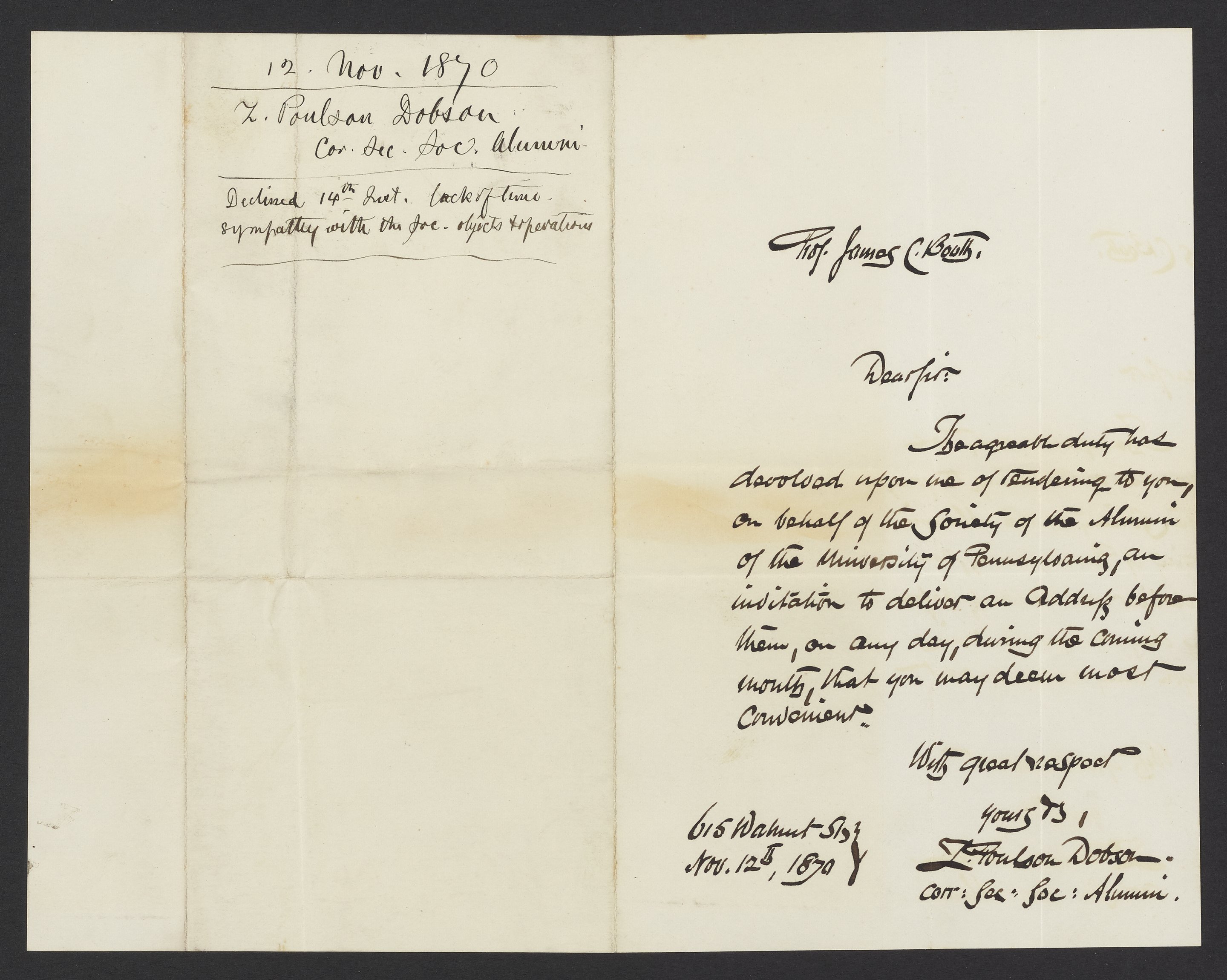 L. Poulson Dobson, corresponding secretary for the Society of the Alumni for the University of Pennsylvania invites James Curtis Booth (1810-1888) to deliver an address to the Society. Booth notes that he has declined the request due to lack of time.