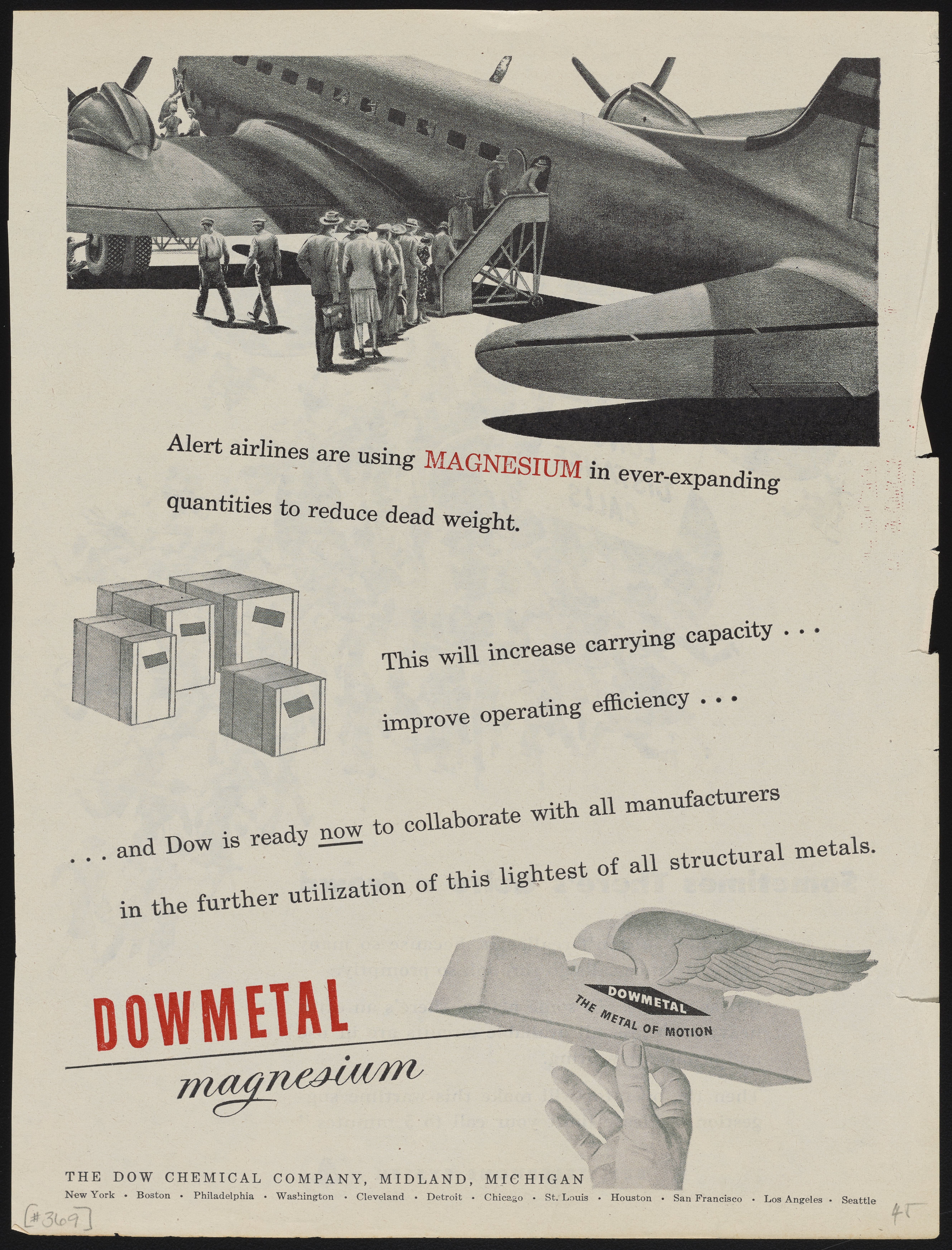 Dow Chemical Company. “Advertisement for Dowmetal Magnesium,” 1945. Advertisements from the Dow Chemical Historical Collection, Box 8. Science History Institute. Philadelphia. https://digital.sciencehistory.org/works/vuqkvax.