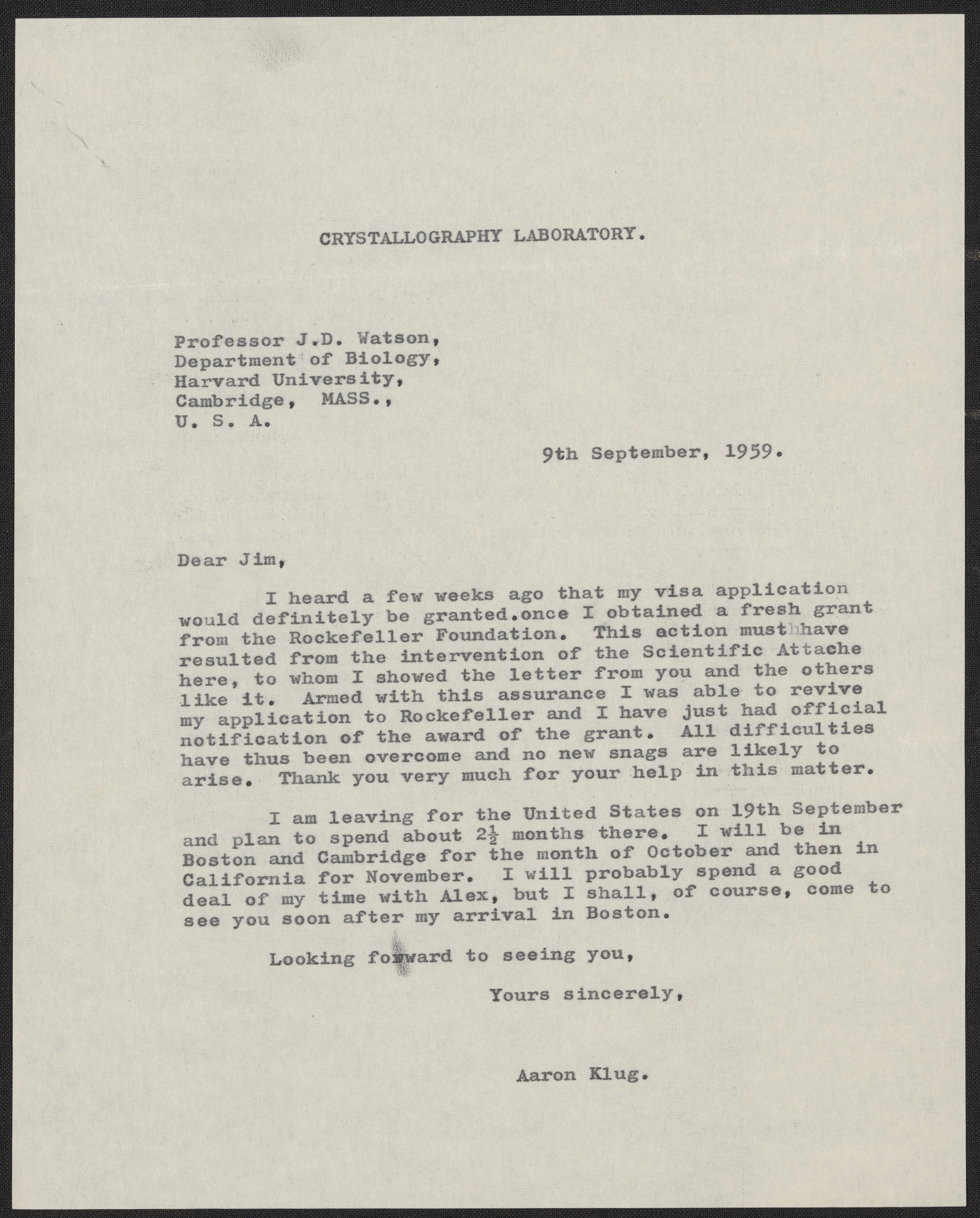 Klug, A. (Aaron), Sir. “Letter from Aaron Klug to James Watson, September 9, 1959,” September 9, 1959. History of Molecular Biology Collection, Box 28, Folder 8. Science History Institute. Philadelphia. https://digital.sciencehistory.org/works/vw857hb.