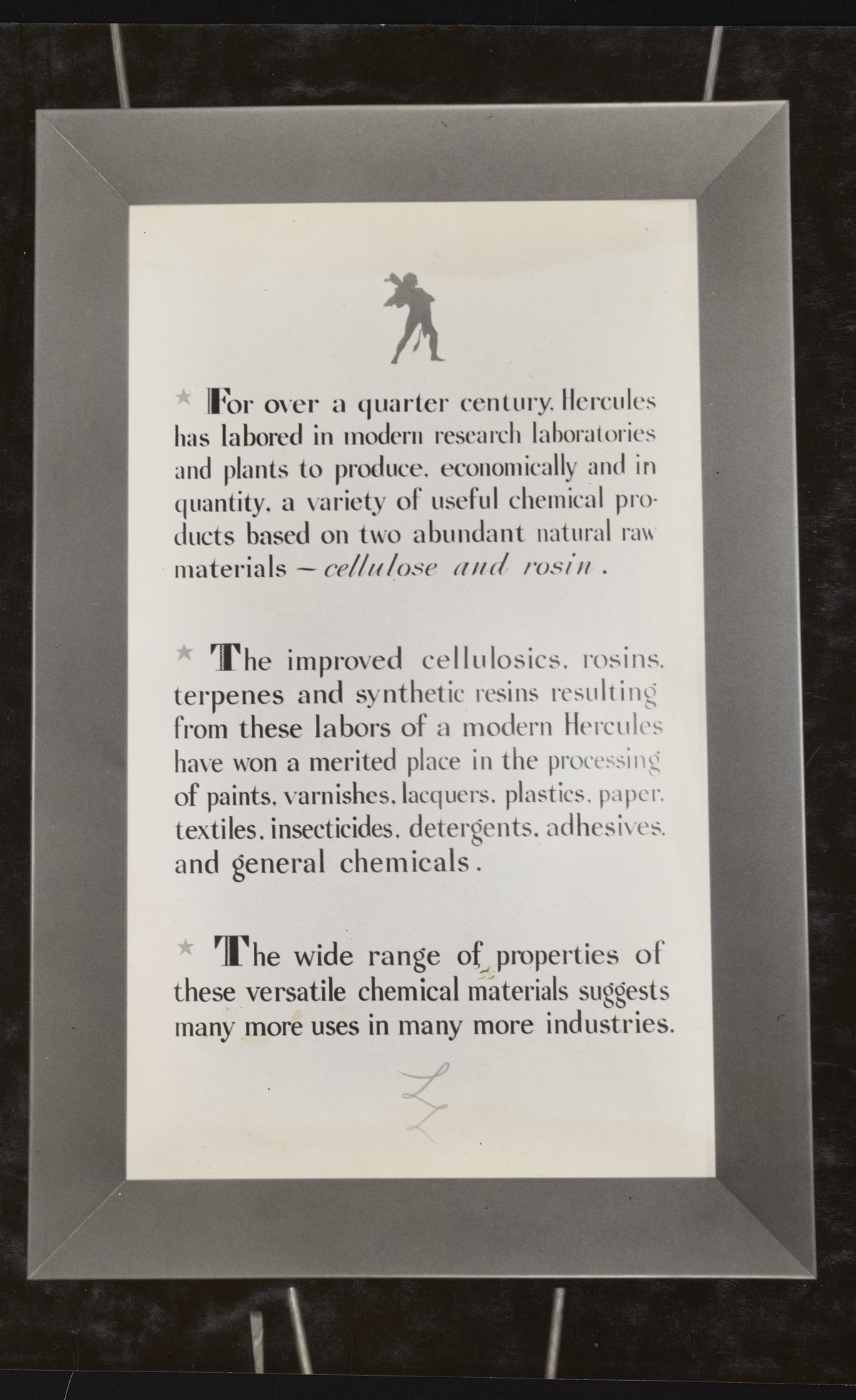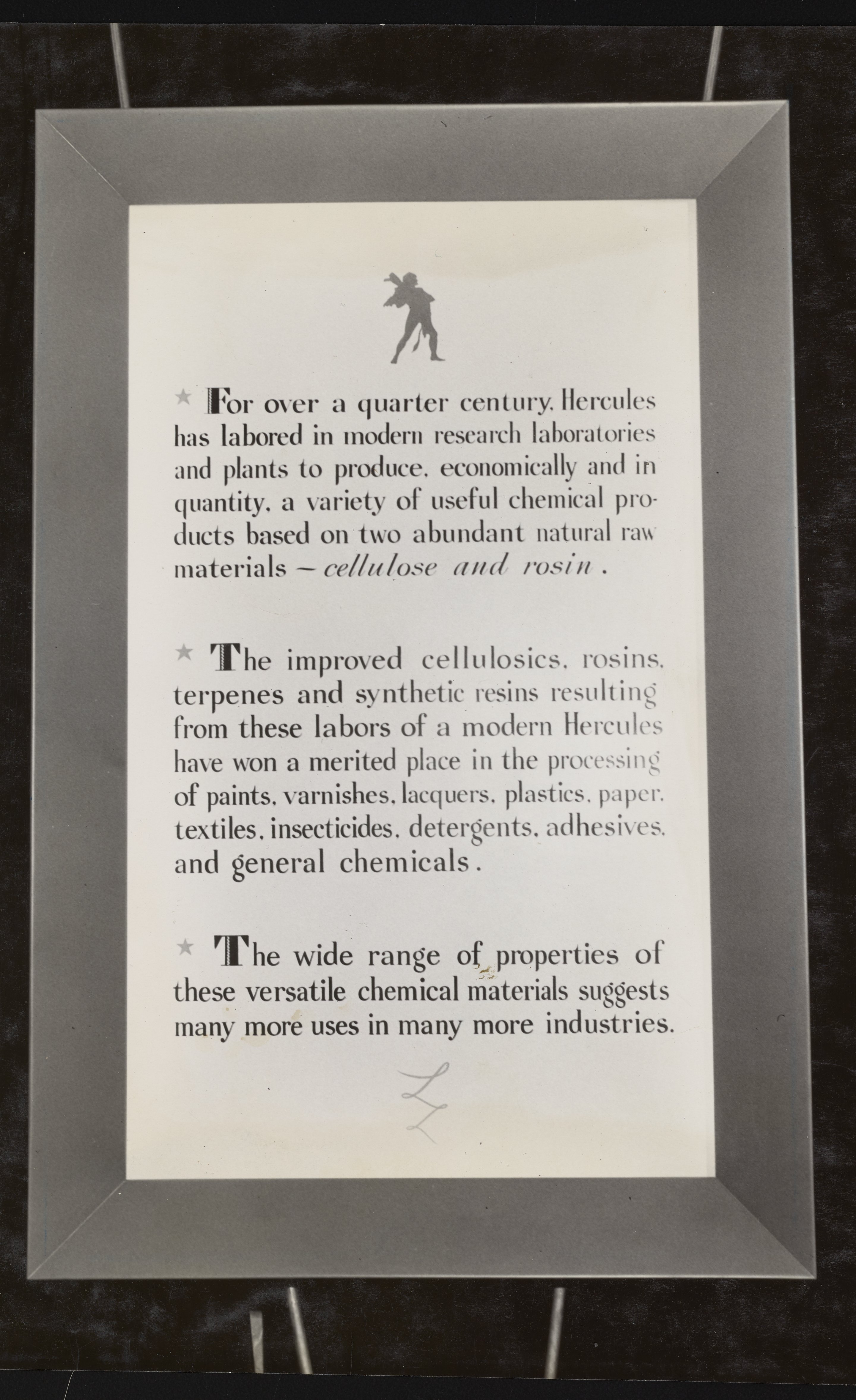 Formed in 1912 as part of an anti-trust settlement with DuPont, the Hercules Powder Company (later Hercules Inc.) initially specialized in the manufacture of explosives and smokeless powders and subsequently diversified its business to encompass a variety of industrial products, including pine and paper chemicals, synthetics, pigments, polymers, and cellulose.
