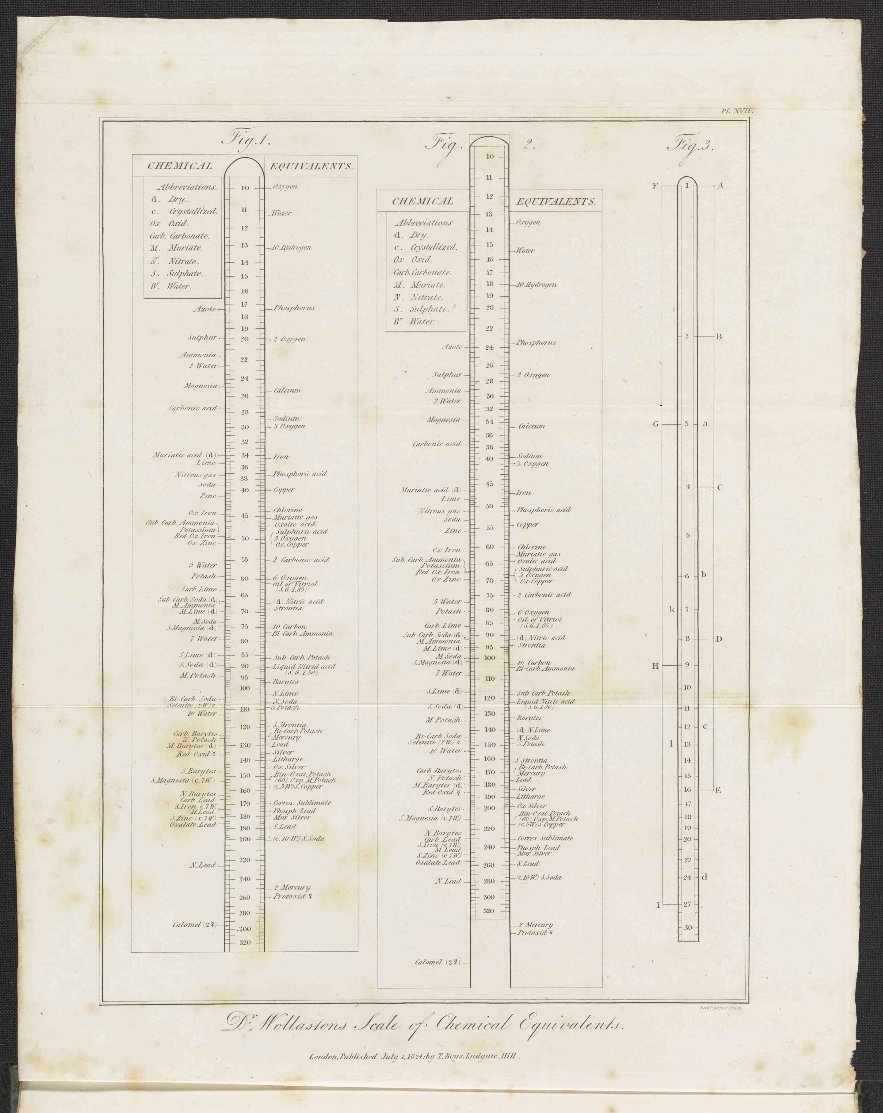 Accum, Friedrich Christian. “Plate 17: Dr. Wollaston's Scale of Chemical Equivalents.” In An Explanatory Dictionary of the Apparatus and Instruments Employed in the Various Operations of Philosophical and Experimental Chemistry. London, England: Thomas Shotter Boys, 1824. https://digital.sciencehistory.org/works/w0892994f.