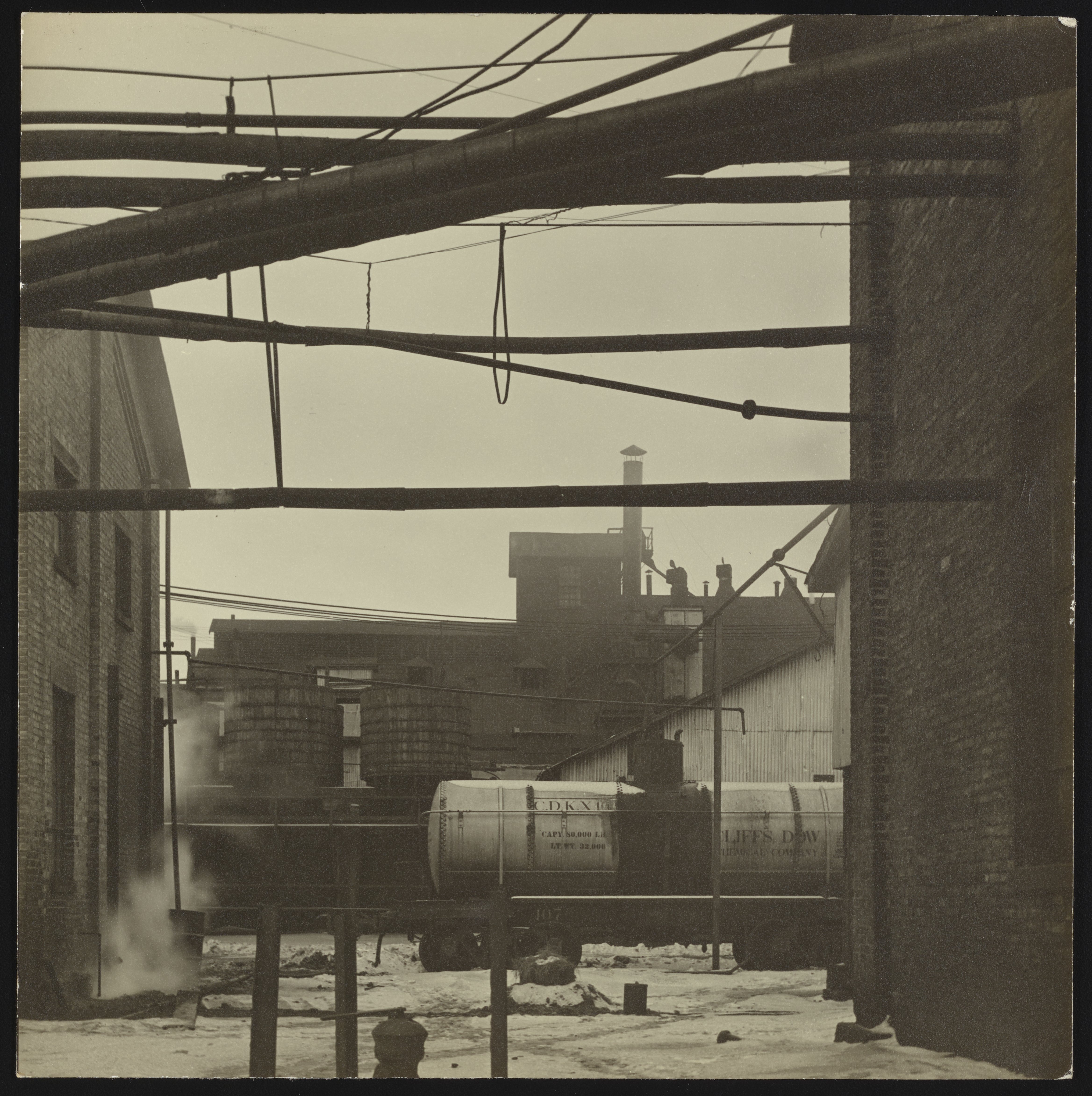 General view of a section of the exterior of the Cliffs Dow wood distillation plant located in Marquette, Michigan. Seeking a source of raw material for its new plastic, ethylcellulose, the Dow Chemical Company joined with the Cleveland-Cliffs Iron Company to form the Cliffs Dow Chemical Company in April 1935. The Cliffs Dow plant in Marquette primarily produced charcoal used in the manufacture of pig iron, as well as a range of chemical by-products including acetic acid, calcium acetate, wood alcohol, and ethyl alcohol. Notably, when the Marquette plant ceased operations in 1969, it was the last wood distillation plant in the United States.