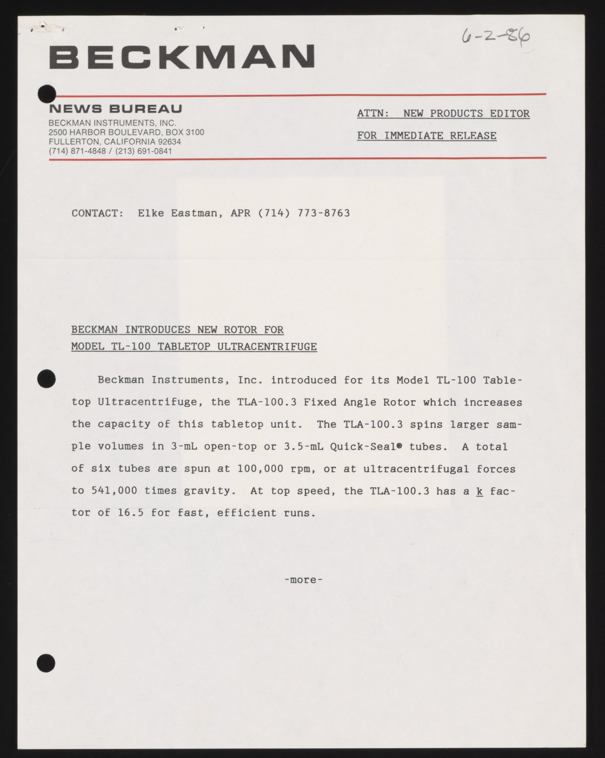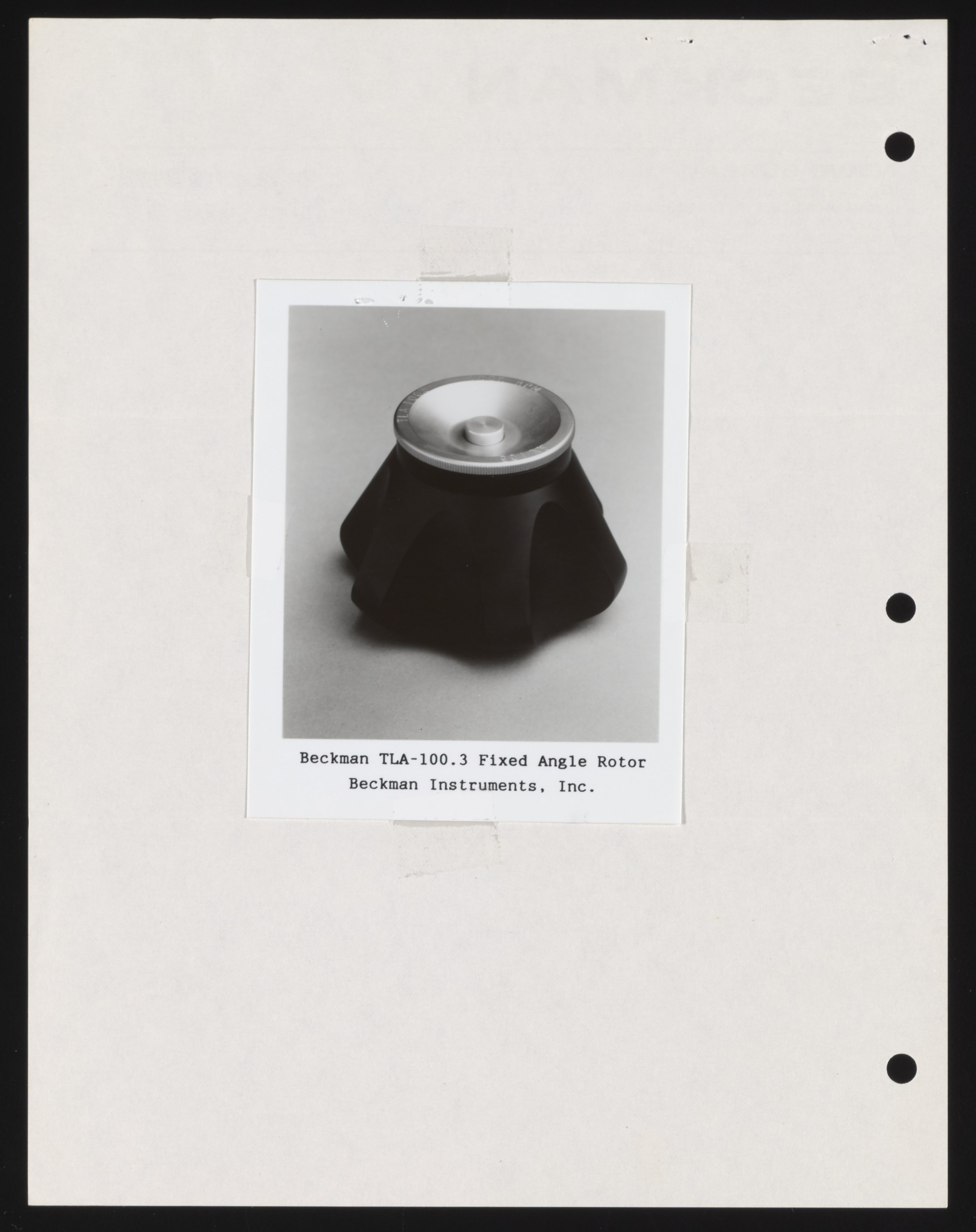 Eastman, Elke. “Beckman Introduces New Rotor for Model TL-100 Tabletop Ultracentrifuge,” June 2, 1986. Beckman Historical Collection, Box 58, Folder 71. Science History Institute. Philadelphia. https://digital.sciencehistory.org/works/w0892b41m.