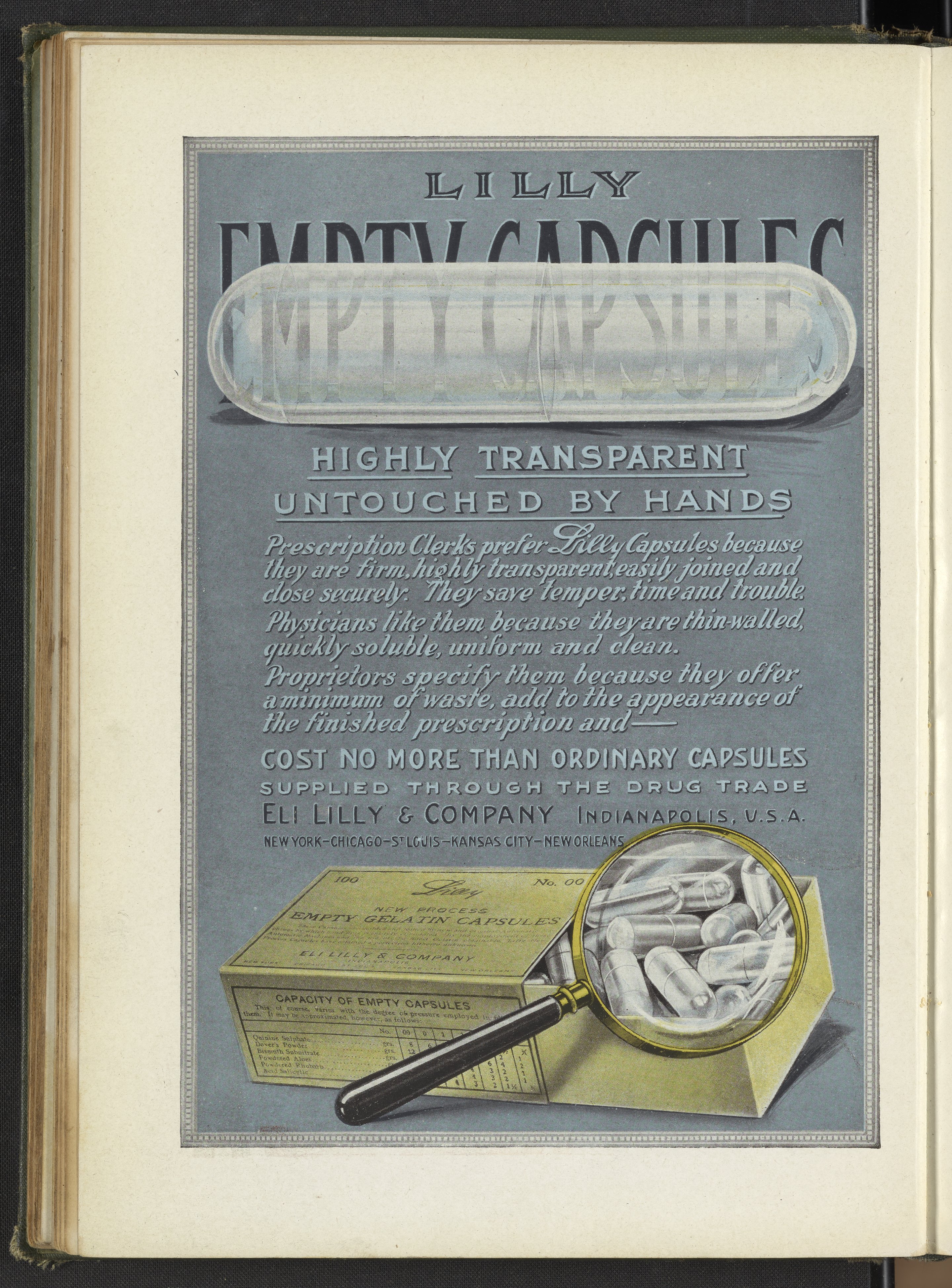 Eli Lilly and Company. “Lilly Empty Capsules.” Hand Book of Pharmacy and Therapeutics. Indianapolis, Indiana, circa 1919. https://digital.sciencehistory.org/works/w0892c16g.
