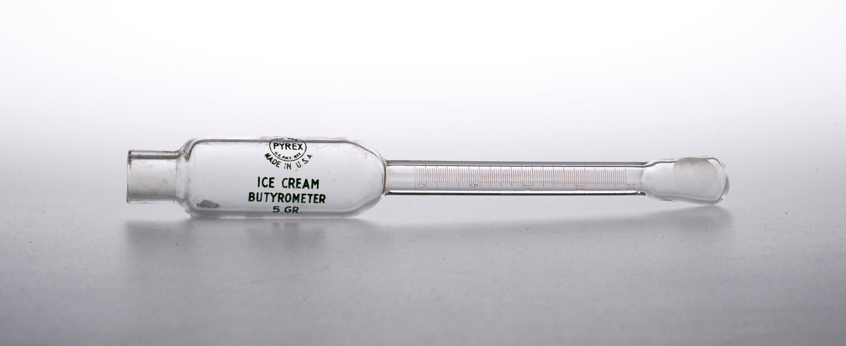 Pyrex Gerber Bottle 20% or Ice Cream Butyrometer 5 GR. - A glass butyrometer with bulbous ends and a narrow midsection. The midsection has measurements from 0 to 20 mL. On one end is imprinted "Ice Cream/Butyrometer/5GR.".