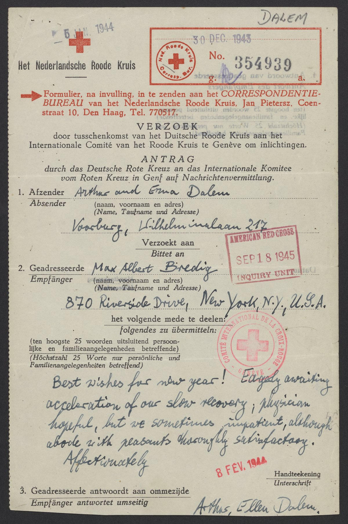 Message from Arthur and Erna Dalem (Alfred and Eva Schnell) to Max Bredig, December 30, 1943