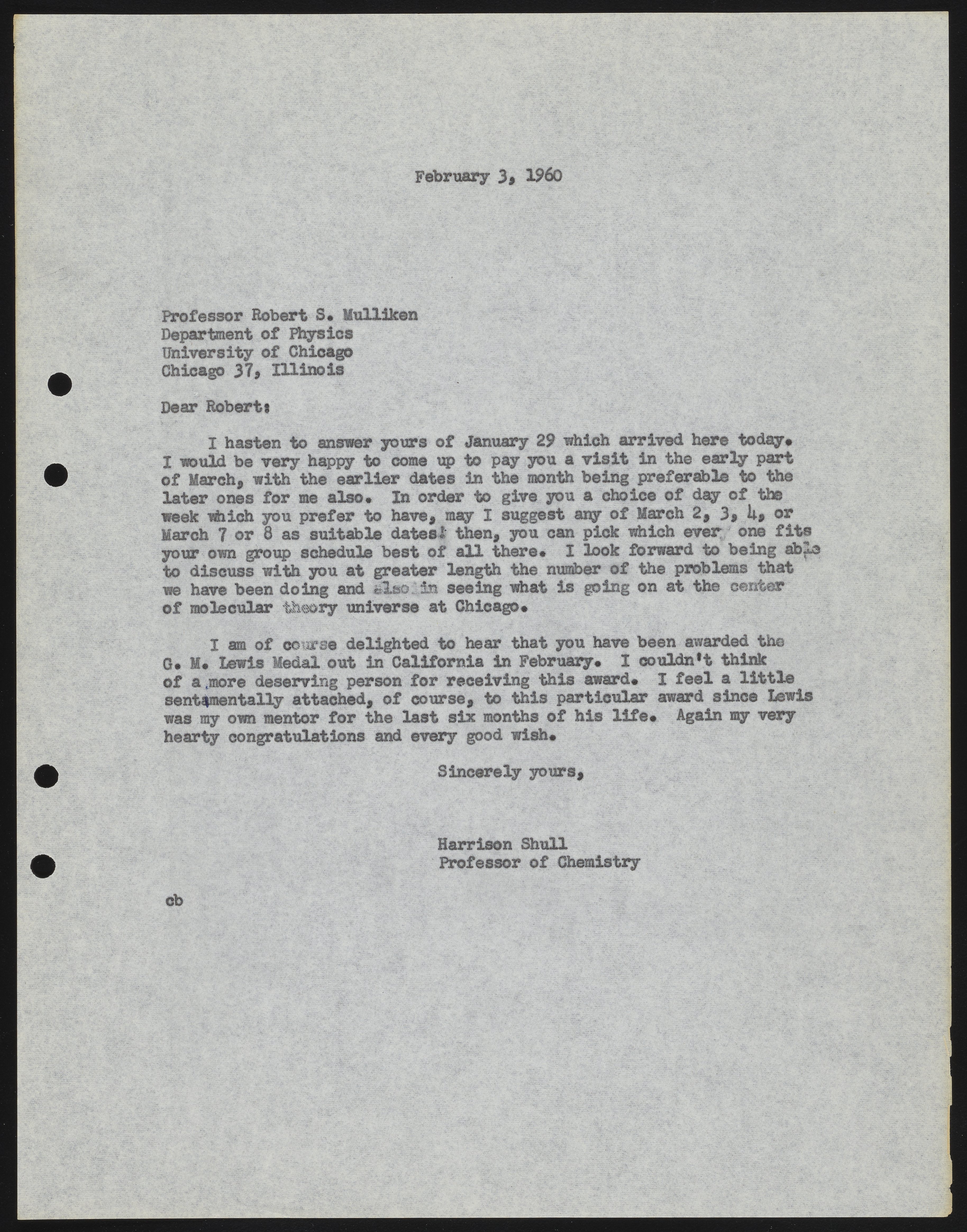 Shull, Harrison. “Letter from Harrison Shull to Robert S. Mulliken, 1960,” February 3, 1960. Robert S. Mulliken & Harrison Shull Correspondence, Box 1. Science History Institute. Philadelphia. https://digital.sciencehistory.org/works/w37636860.