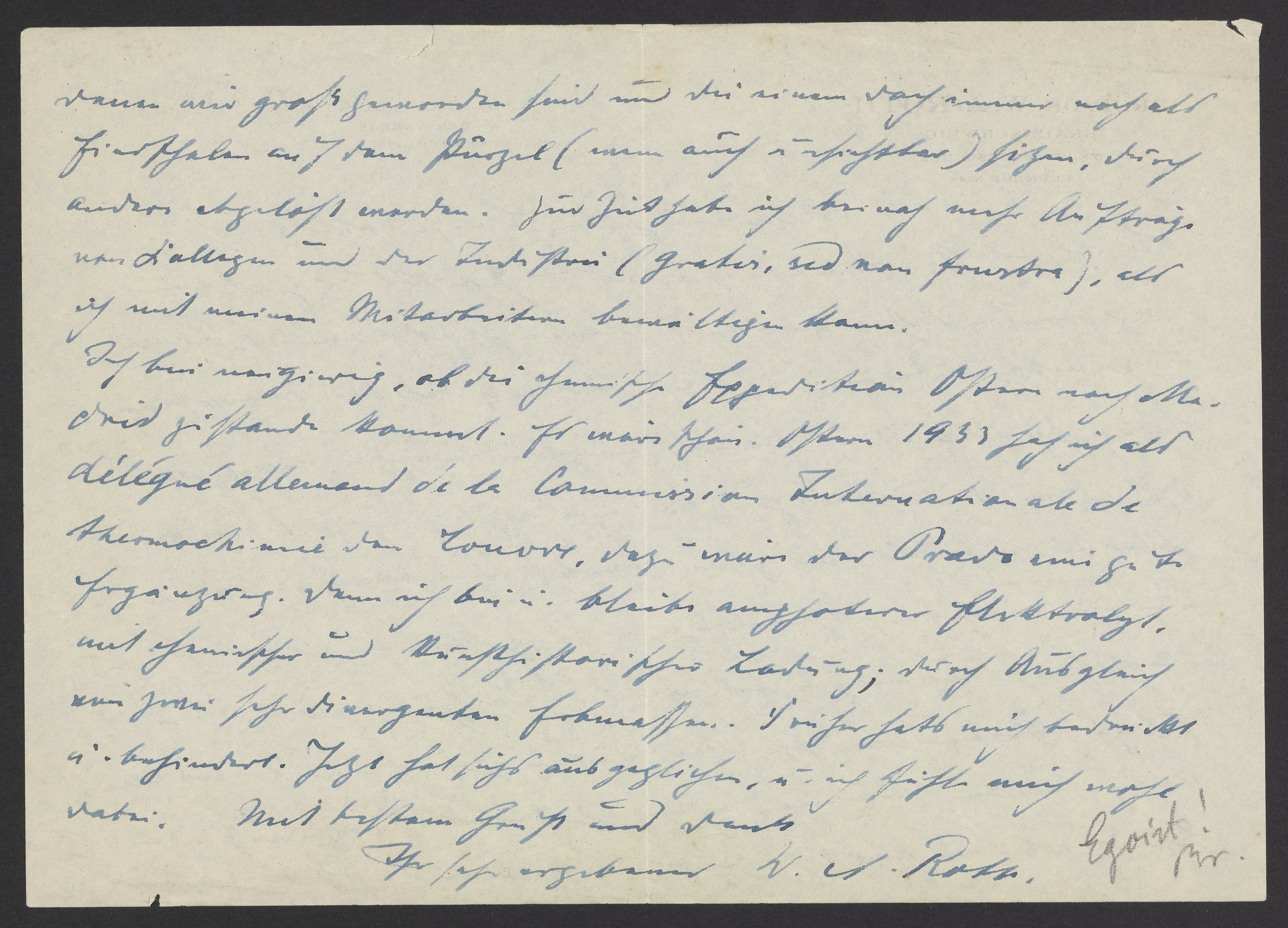 Ich bin neugierig, ob die chemische Expedition Ostern nach Madrid zustande kommt. Es wäre schön. Ostern 1933 sah ich als délégré allemand de la Commission Internationale de Thermochimie dans Louvre, dazu wäre der Prado eine gute Ergänzung. Denn ich bin u. bleibe ein besonderer Elektrolyt, mit chemischer und kunsthistorischer Ladung; durch Ausgleich von zwei sehr divergenten Erbmassen. Früher hats mich bedrückt u. behindert. Jetzt hat sich es ausgeglichen, u. ich fühle mich wohl dabei.