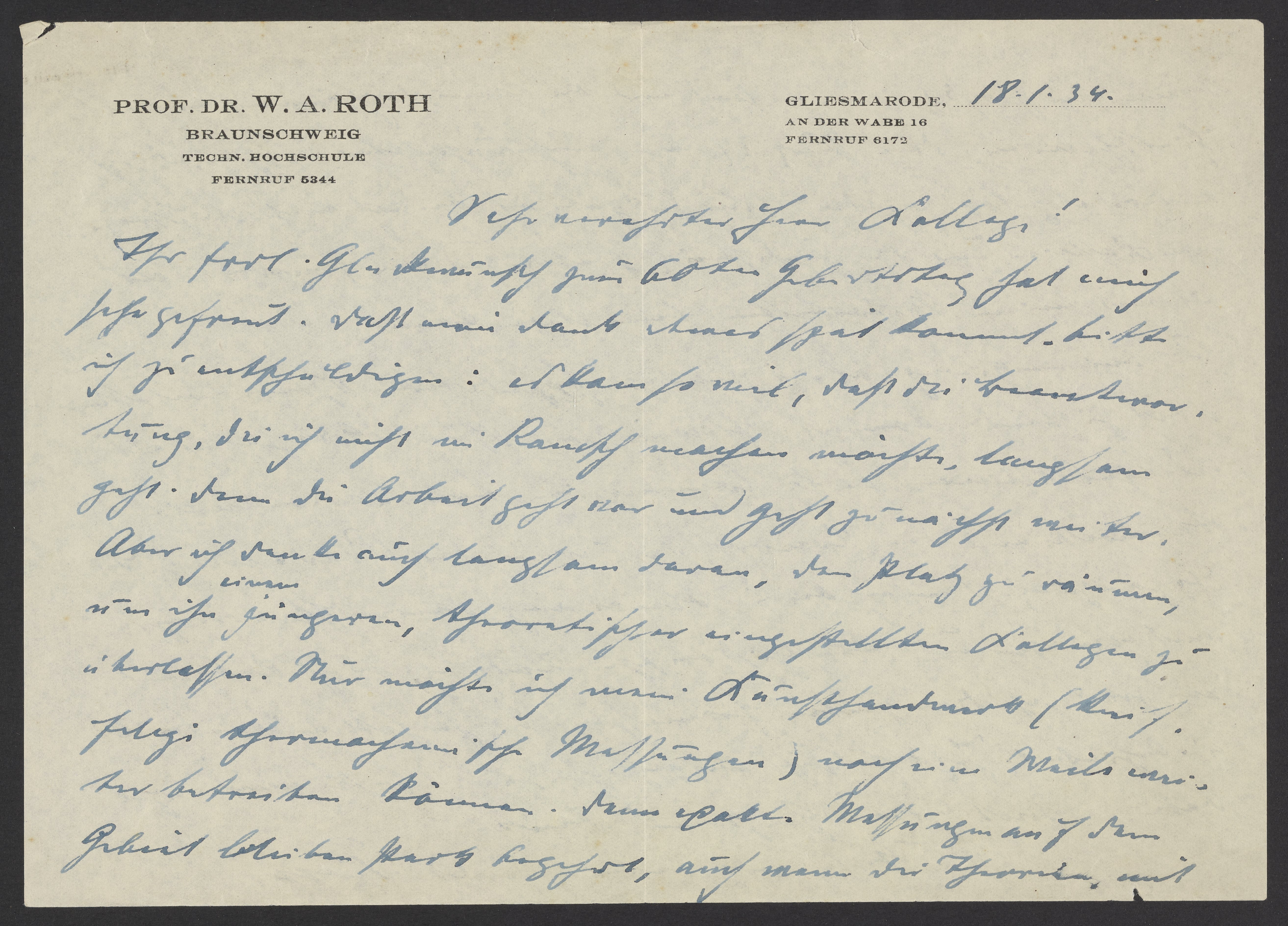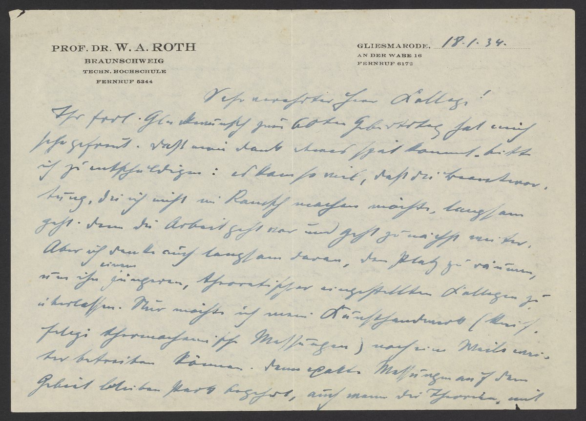 Small JPG1200 x 863px — 173 KBLarge JPG2880 x 2071px — 936 KBFull-sized JPG5253 x 3777px — 2.8 MBOriginal fileTIFF — 5253 x 3777px — 56.8 MBWalther Roth (1873-1950), a professor of physical chemistry in Braunschweig and specialist in thermochemistry, thanks Georg Bredig (1868-1944) for wishing him well on his sixtieth birthday. Roth additionally provides updates on his career.