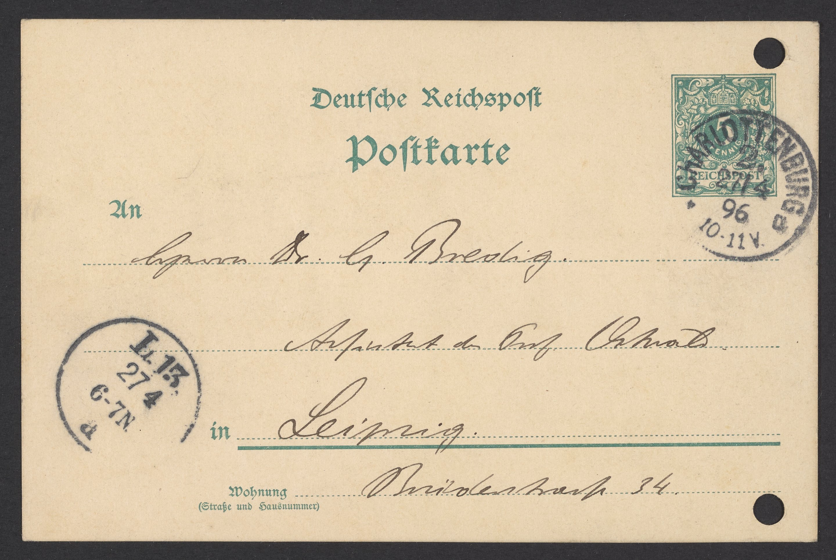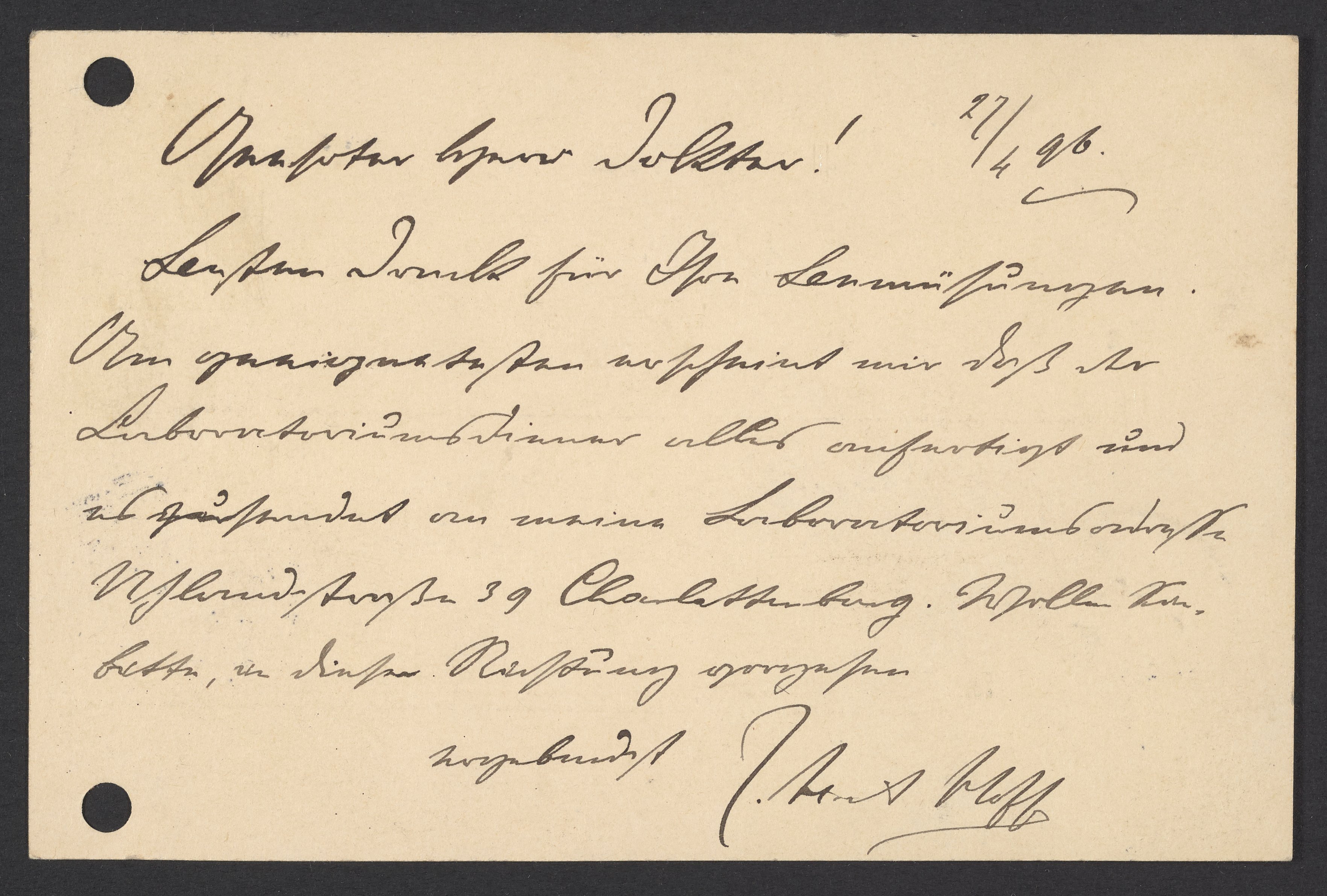 Postcard from Jacobus H. van 't Hoff to Georg Bredig, April 1896