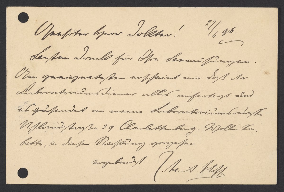 Hoff, J. H. van 't (Jacobus Henricus). “Postcard from Jacobus H. Van 't Hoff to Georg Bredig, April 1896,” April 27, 1896. Papers of Georg and Max Bredig, Box 2, Folder 1. Science History Institute. Philadelphia. https://digital.sciencehistory.org/works/w458wbs.