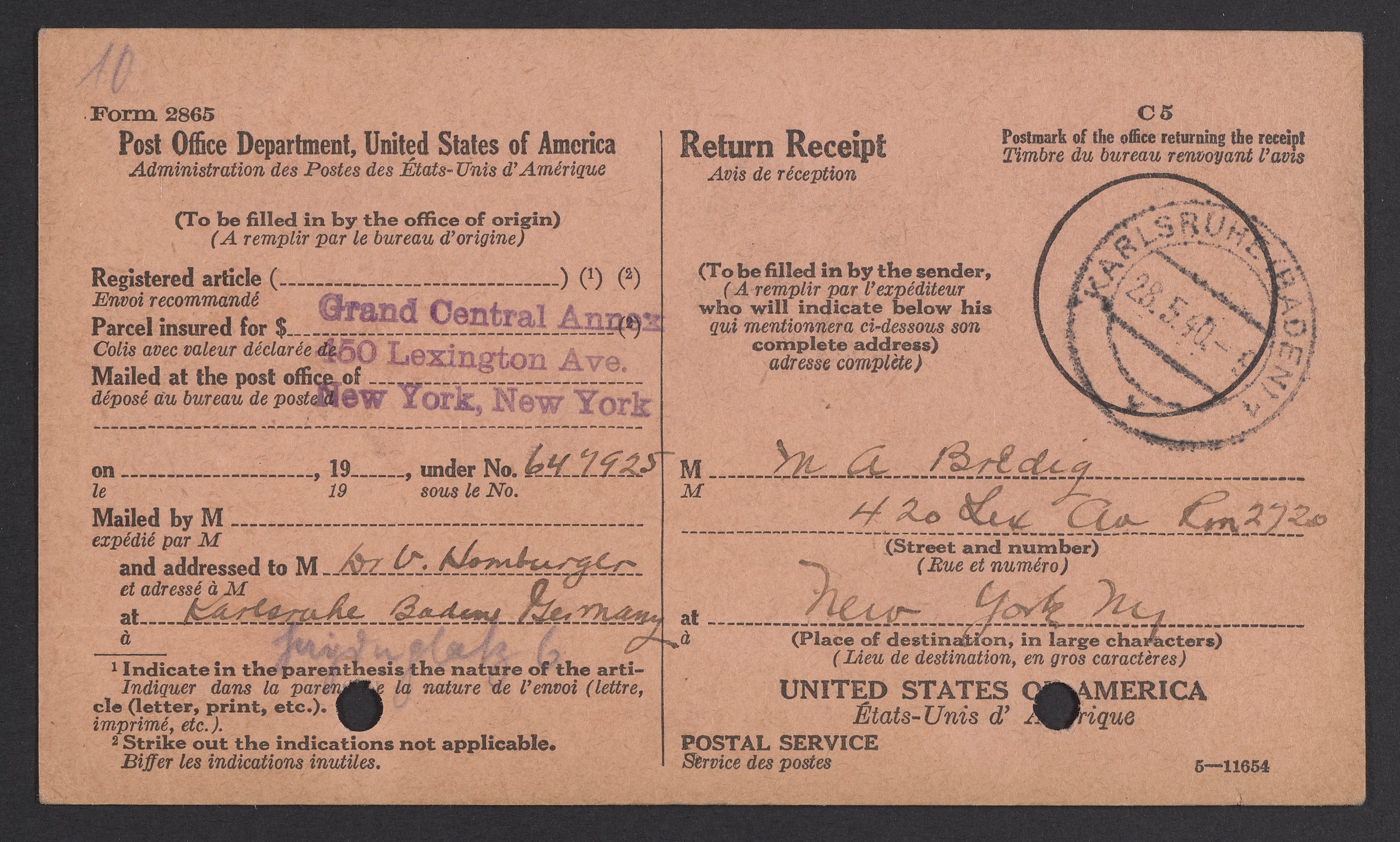 Small JPG1200 x 722px — 205 KBLarge JPG2880 x 1733px — 1.1 MBFull-sized JPG3842 x 2312px — 1.8 MBOriginal fileTIFF — 3842 x 2312px — 25.5 MBReceipt for a package sent from Max Bredig (1902-1977) to his brother-in-law, Viktor Homburger (1888-1968) in Karlsruhe, Germany.