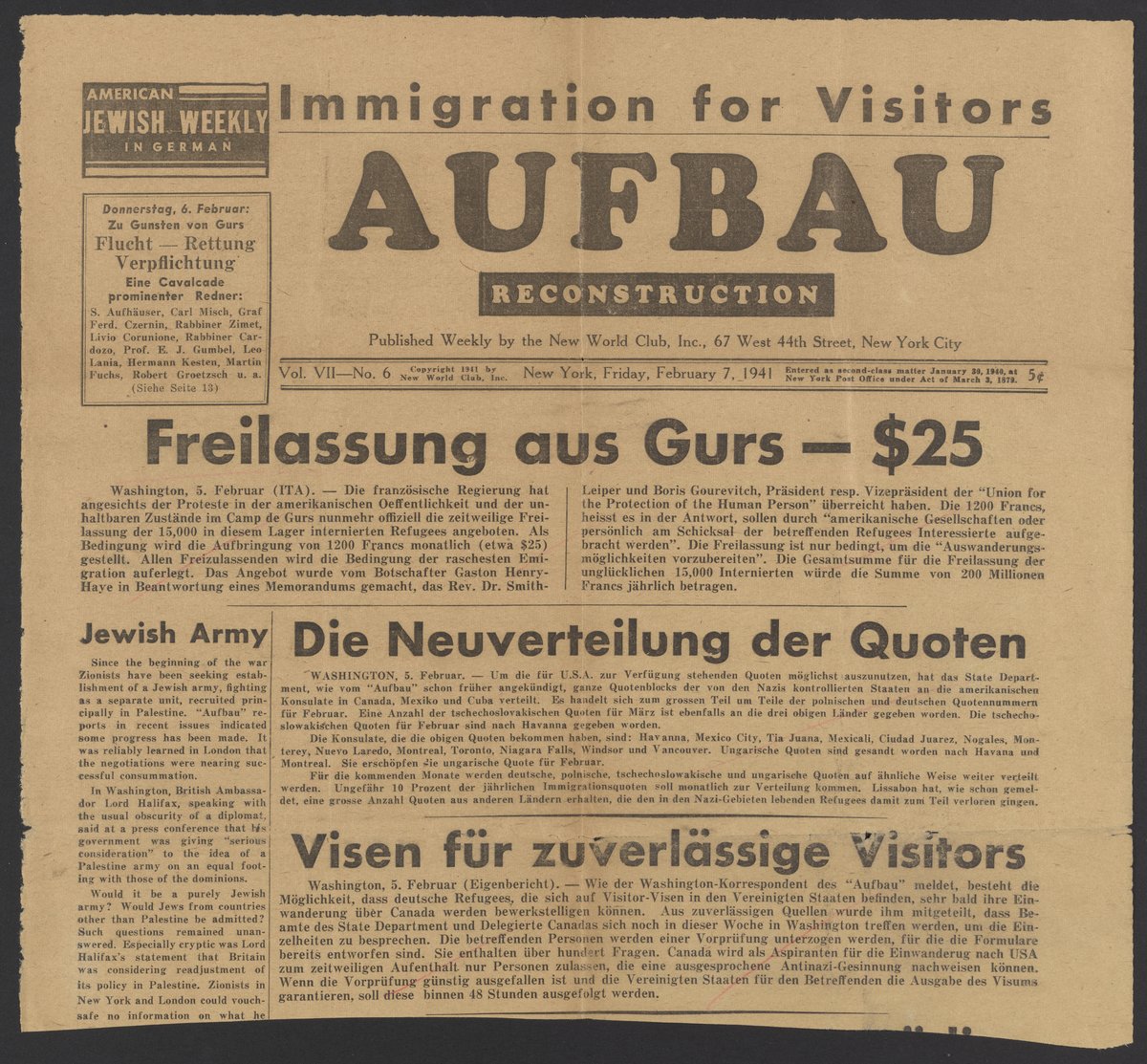 “Aufbau, Volume 7, Number 6.” Aufbau (New York, N.Y.), February 7, 1941. Papers of Georg and Max Bredig, Box 4, Folder 13. Science History Institute. Philadelphia. https://digital.sciencehistory.org/works/w4ult92.
