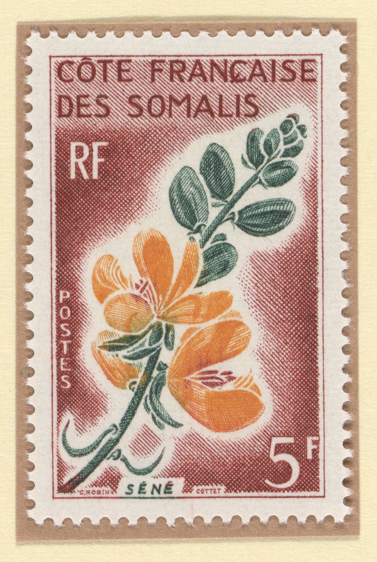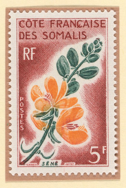 1966 postage stamp from French Somaliland, now present day Djibouti, featuring an illustration of a Senna plant. Senna plants are native to Djibouti and have been used as natural laxatives.