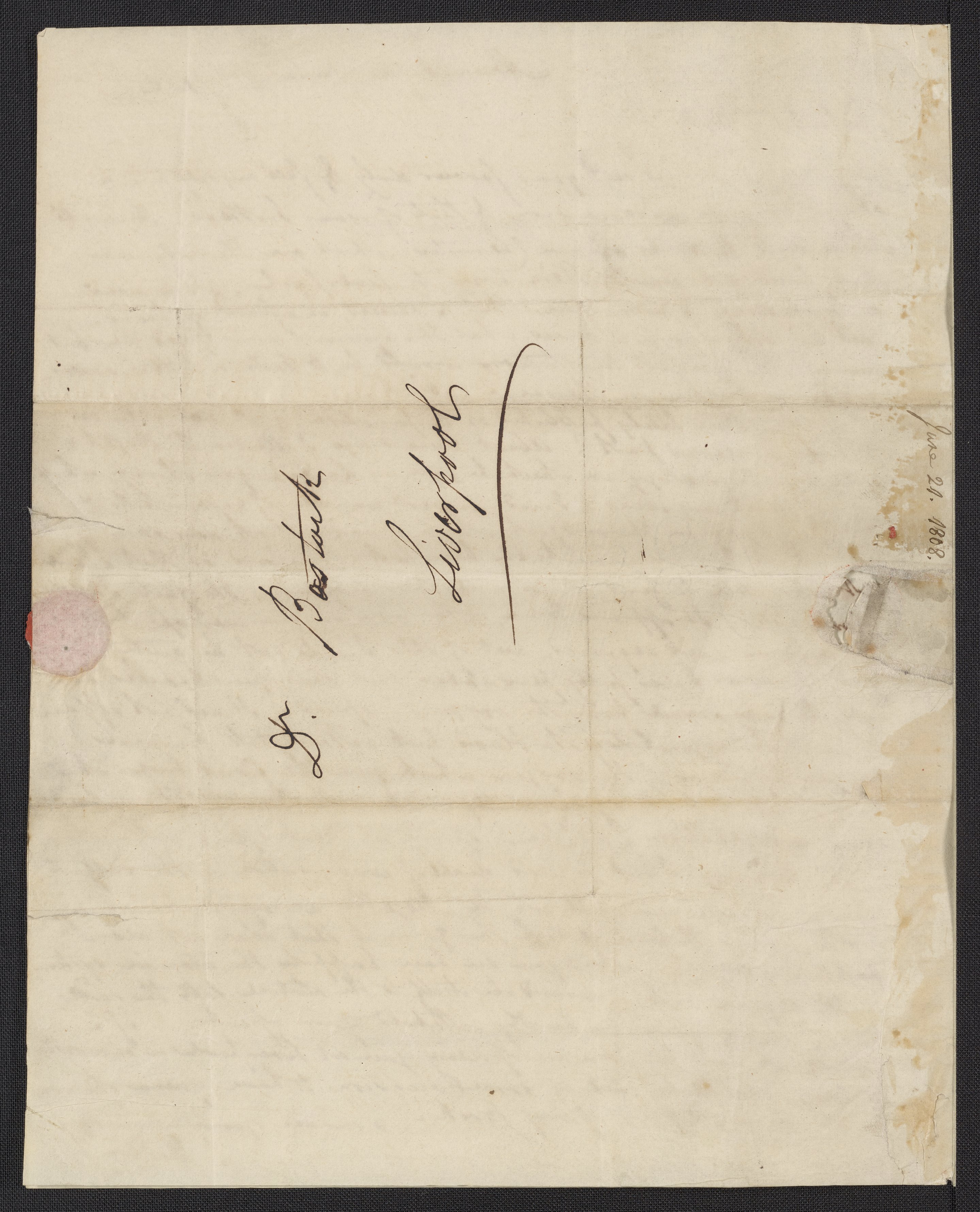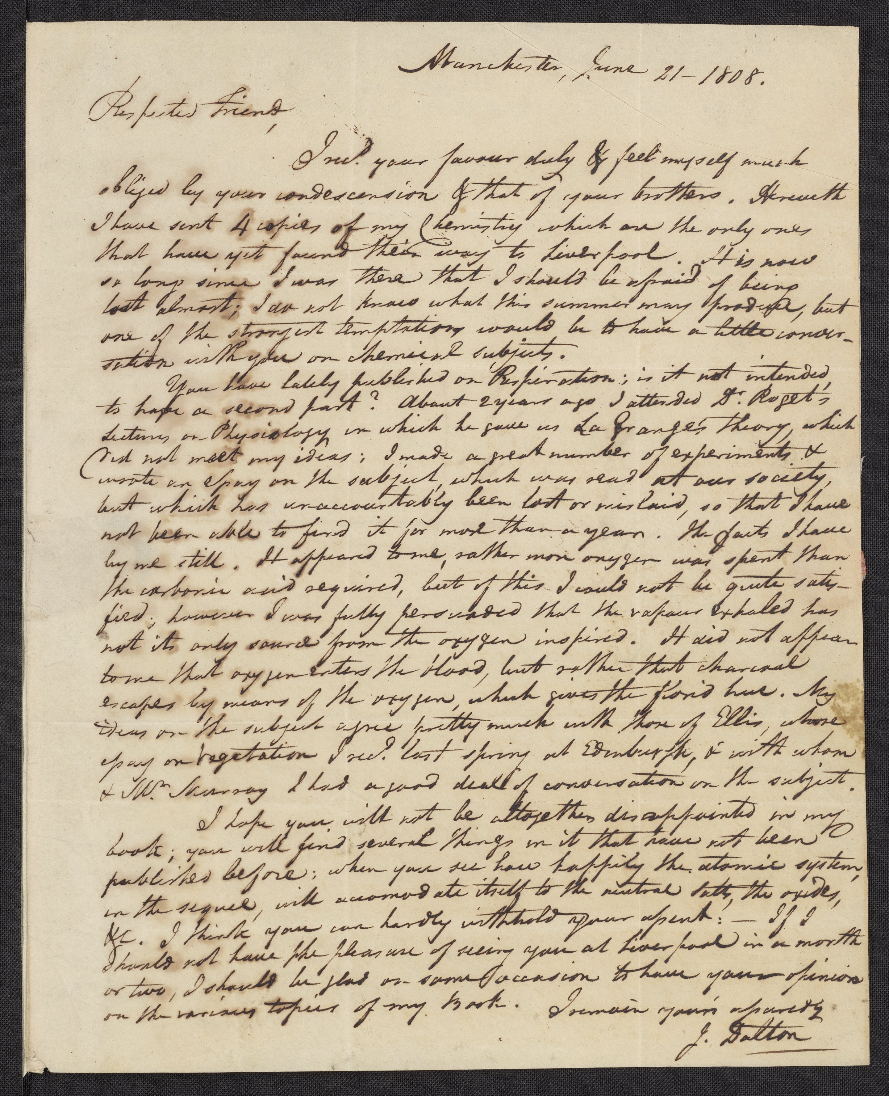 Small JPG1200 x 1479px — 419 KBLarge JPG2880 x 3548px — 1.9 MBFull-sized JPG4610 x 5680px — 4.3 MBOriginal fileTIFF — 4610 x 5680px — 75.0 MBA letter from John Dalton (1766-1844) to Dr. John Bostock (1773-1846) following Dalton's letter of June 11, 1808. Dalton writes he has sent Bostock four copies of his "Chemistry," referring to his work, A New System of Chemical Philosophy (1808), "which are the only ones that have yet found their way to Liverpool." Dalton expresses his wish to converse with Bostock about his new book and his experiments inspired by "Dr. Roget's lectures on physiology."