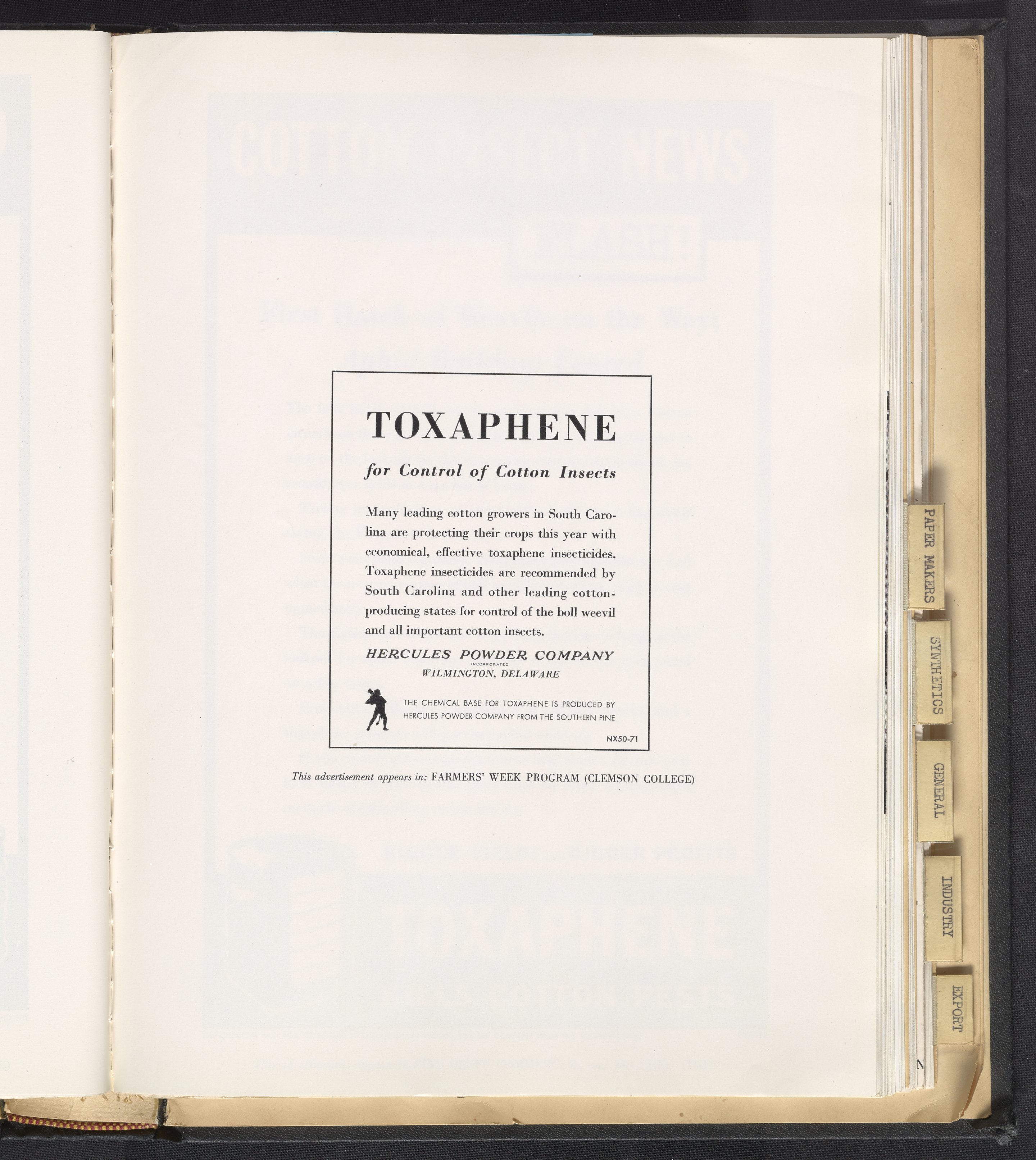 Print advertisement for Toxaphene produced by Hercules Powder Company consists of an inset paragraph describing how South Carolina cotton growers are utilizing Toxaphene to control insects. This advertisement appeared in Farmers' Week Program (Clemson College).