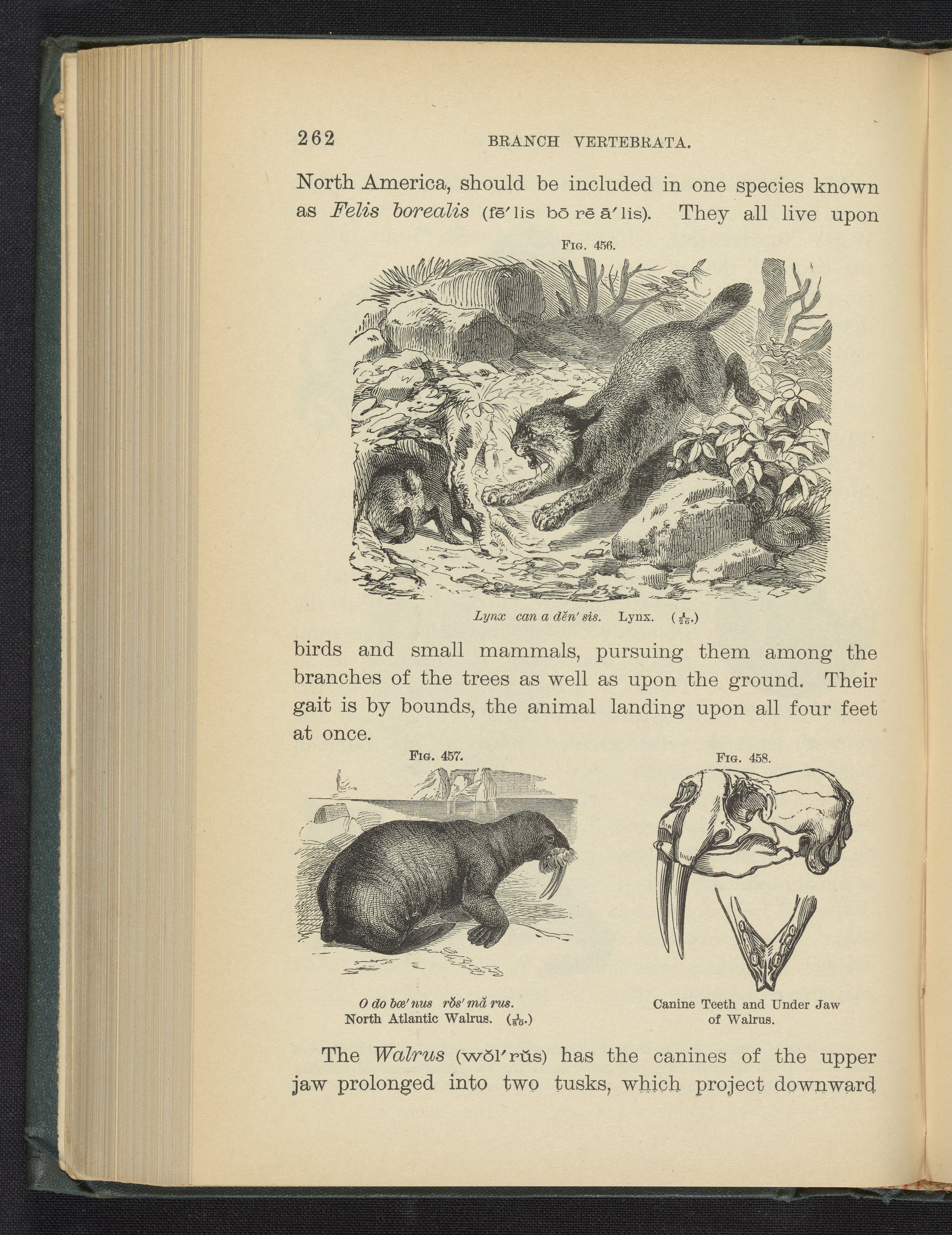 Steele, Joel Dorman, and Jenks, J. W. P. (John Whipple Potter). “Figure 456. Lynx. Figure 457. North Atlantic Walrus. Figure 458. Canine Teeth and Under Jaw of Walrus.” Popular Zoology. New York, New York: Chautauqua Press, 1887. https://digital.sciencehistory.org/works/w6fdlrm.