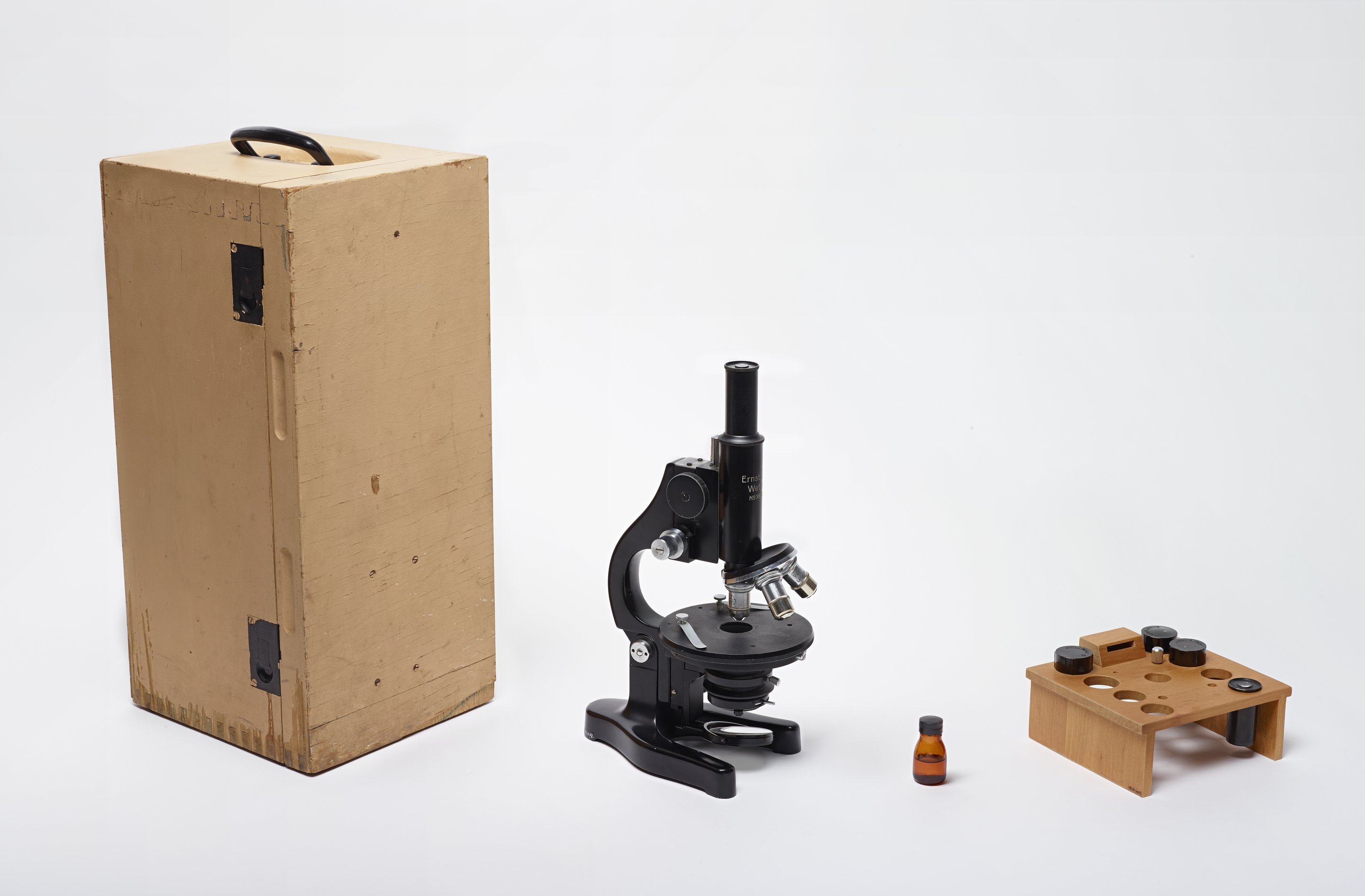 Ernst Leitz oil-immersion microscope; instrument rests on wishbone-shaped base with a single beam extending from the center before splitting into two sections: an arm supporting the telescope and microscopic lenses and a round stand for slides; below the stage is a double-sided mirror that rotates 360 degrees; the stage has a round hole in the middle allowing light to come up through the mirror and two metal stage clips that pivot to hold slides in place; an additional lens below the stage helps focus the light; the telescope has a monocular eye piece with 8x magnification and a rotating nose with three objective lenses (3, 6L, and 1/12); the telescope arm can be raised and lowered using knobs on the side.