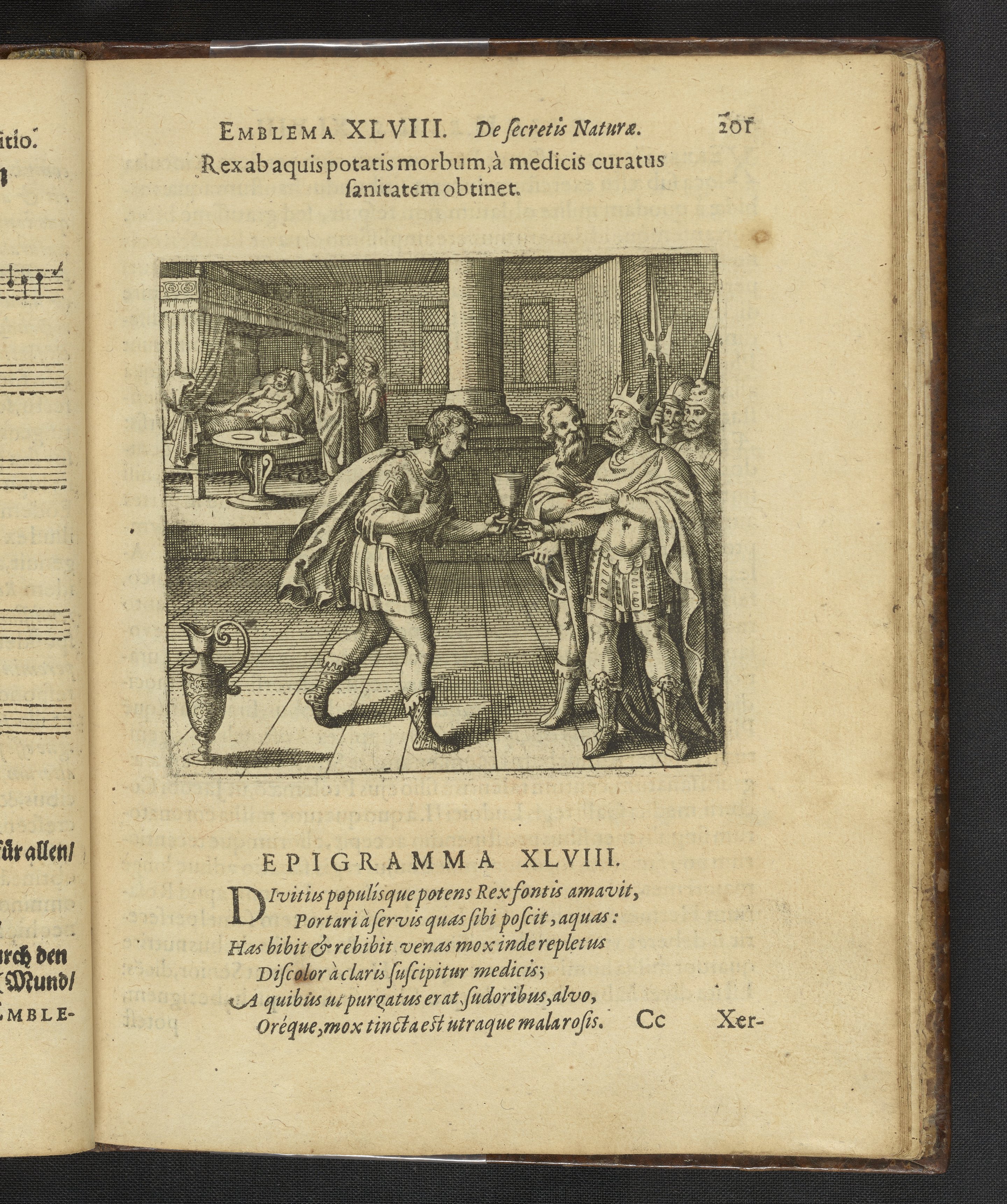 • Emblem 48. The king, sick from drinking the waters, is cured by the physicians and gains his health.